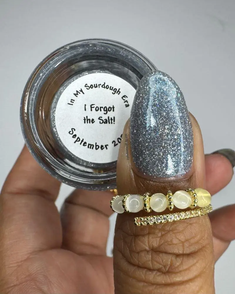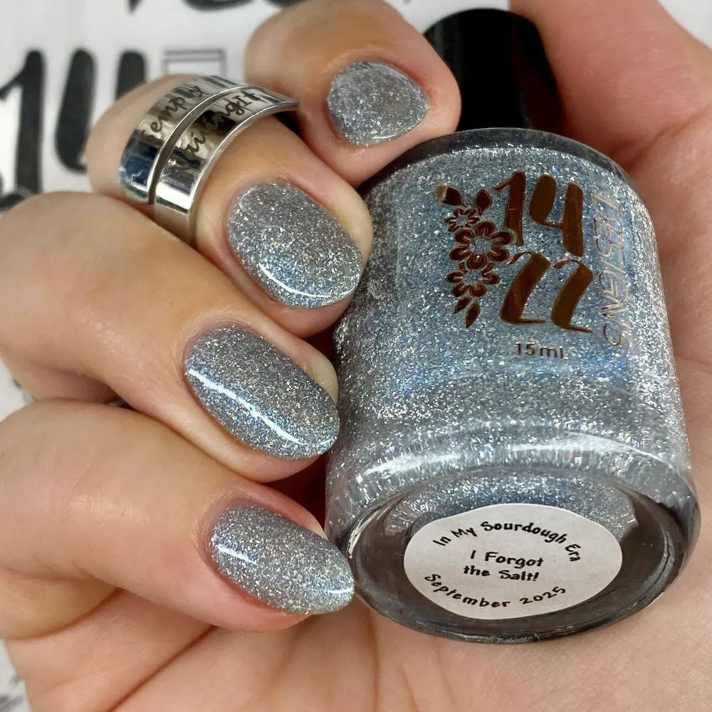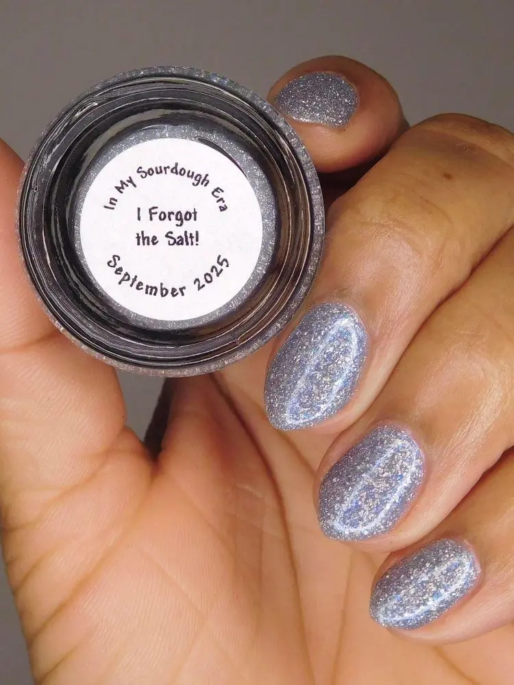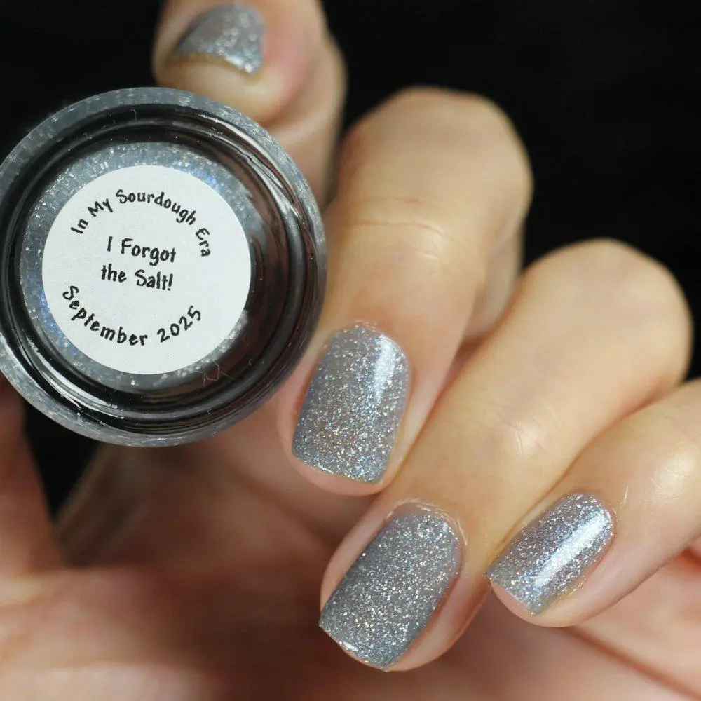 This gray nail polish features a sophisticated base with subtle blue sparks that add depth and dimension. Silver reflective glitter enhances the sparkle, while holographic flakes create a captivating multidimensional effect that catches the light from every angle. Perfect for a modern, edgy look with a touch of sparkle.