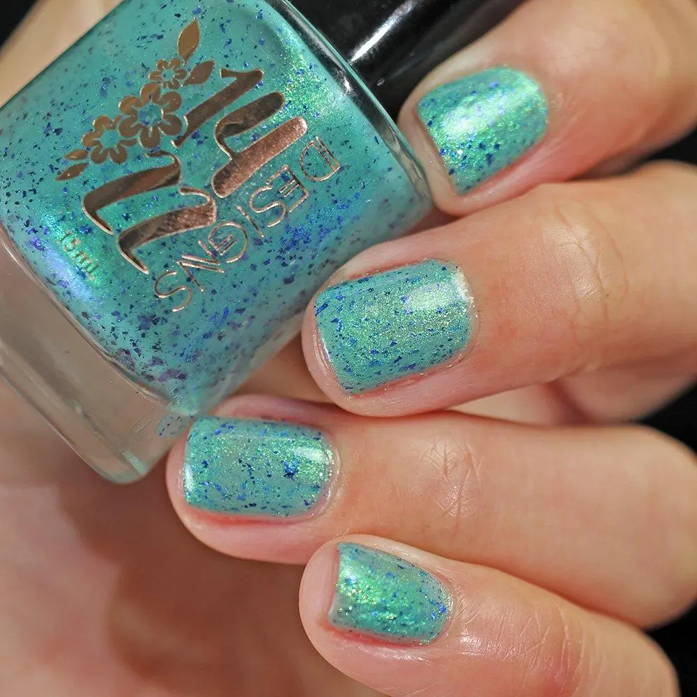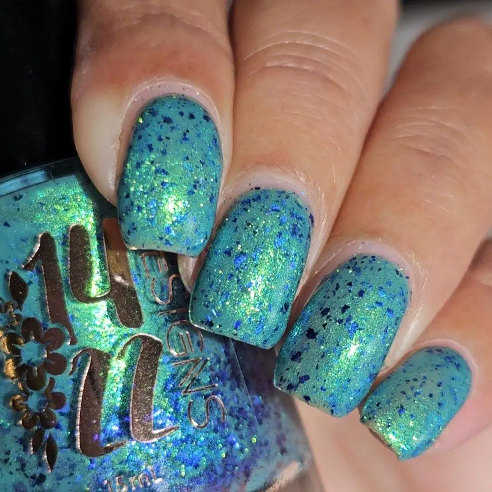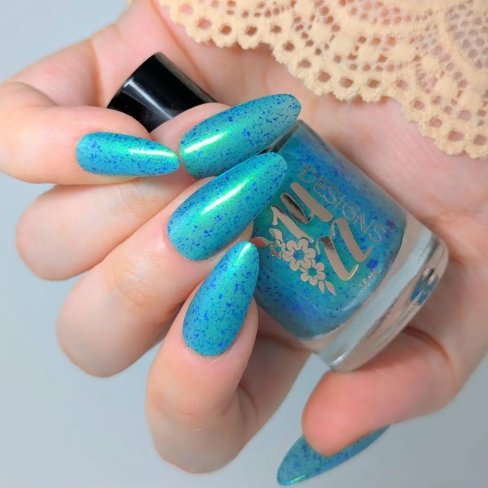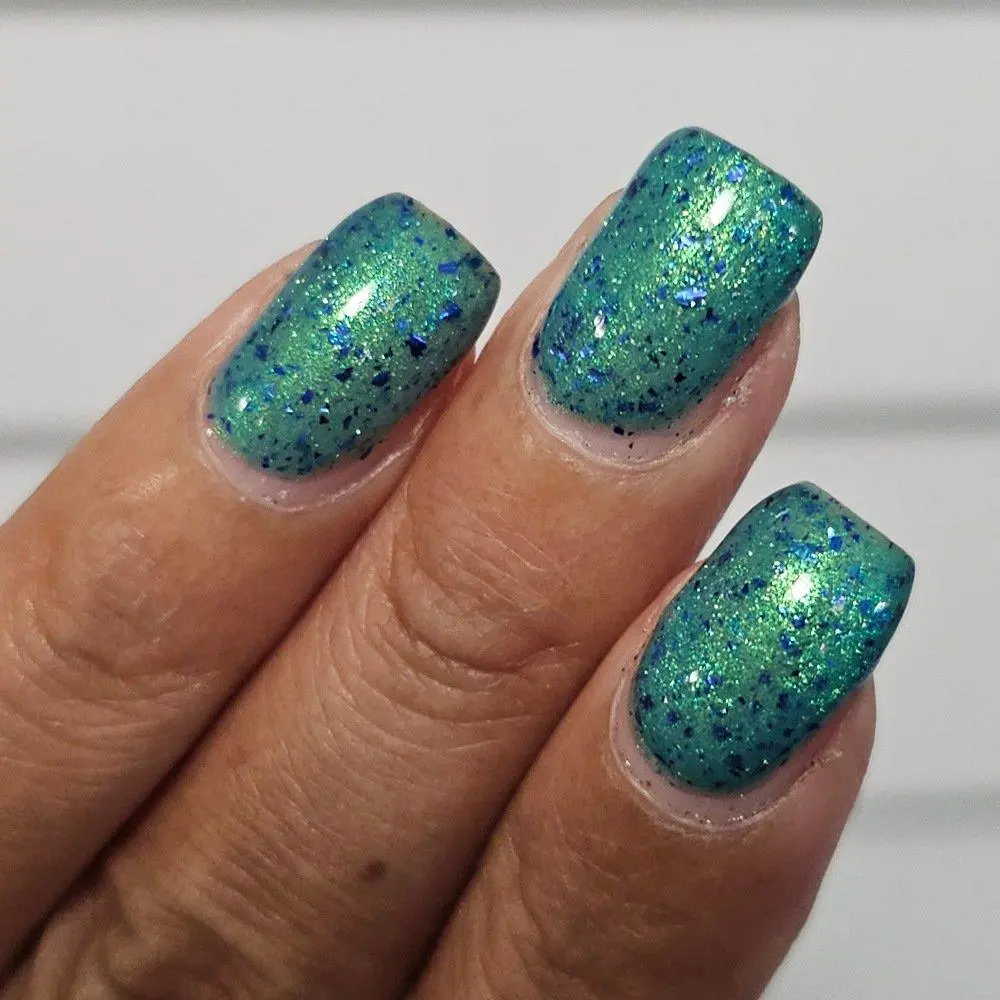 Teal base with a shifting shimmer that moves between green, teal, blue, and purple. Very fine shimmer gives a soft iridescence; scattered blue-purple metallic flakes add contrast and sparkle. Sophisticated by day, luminous by night.
