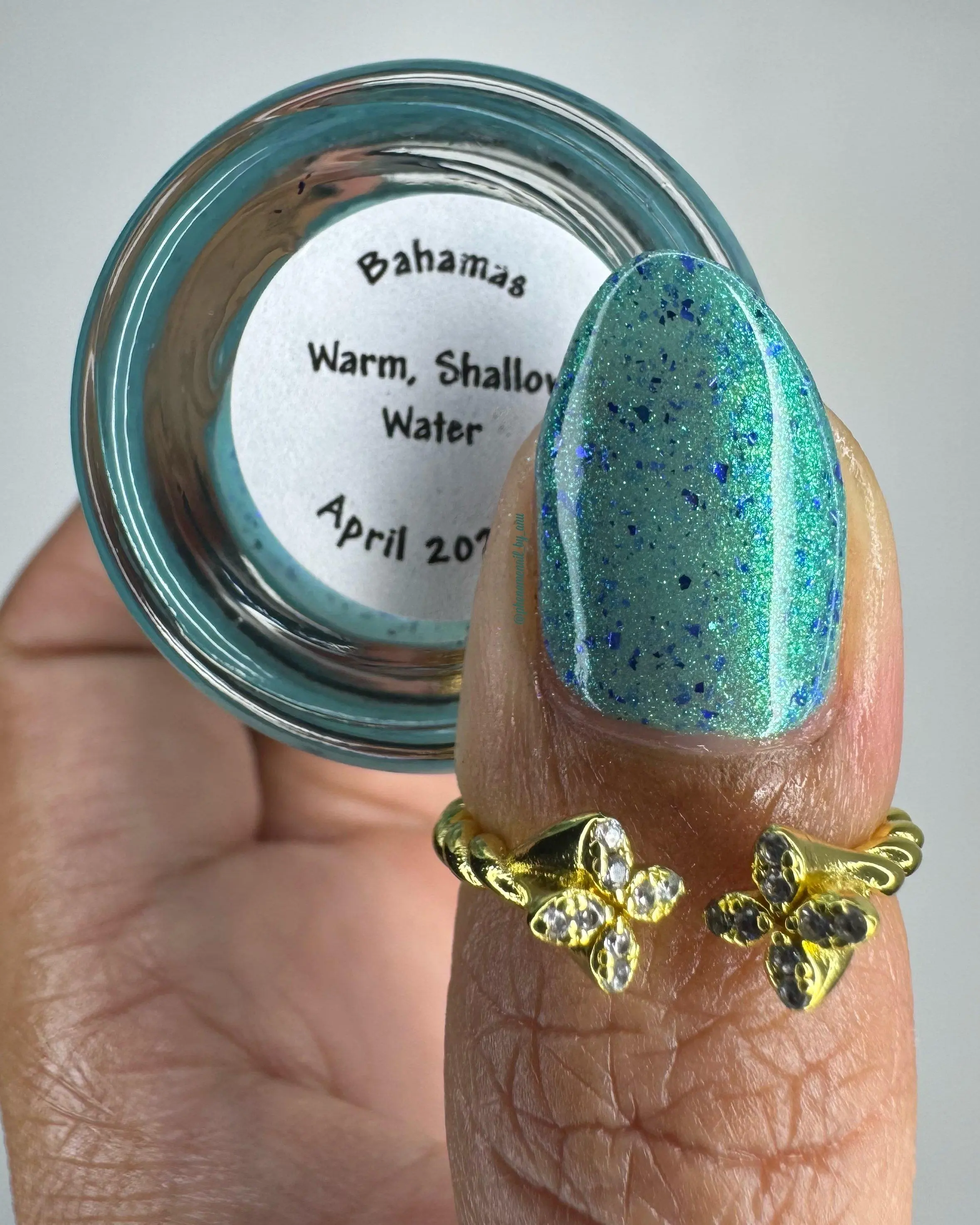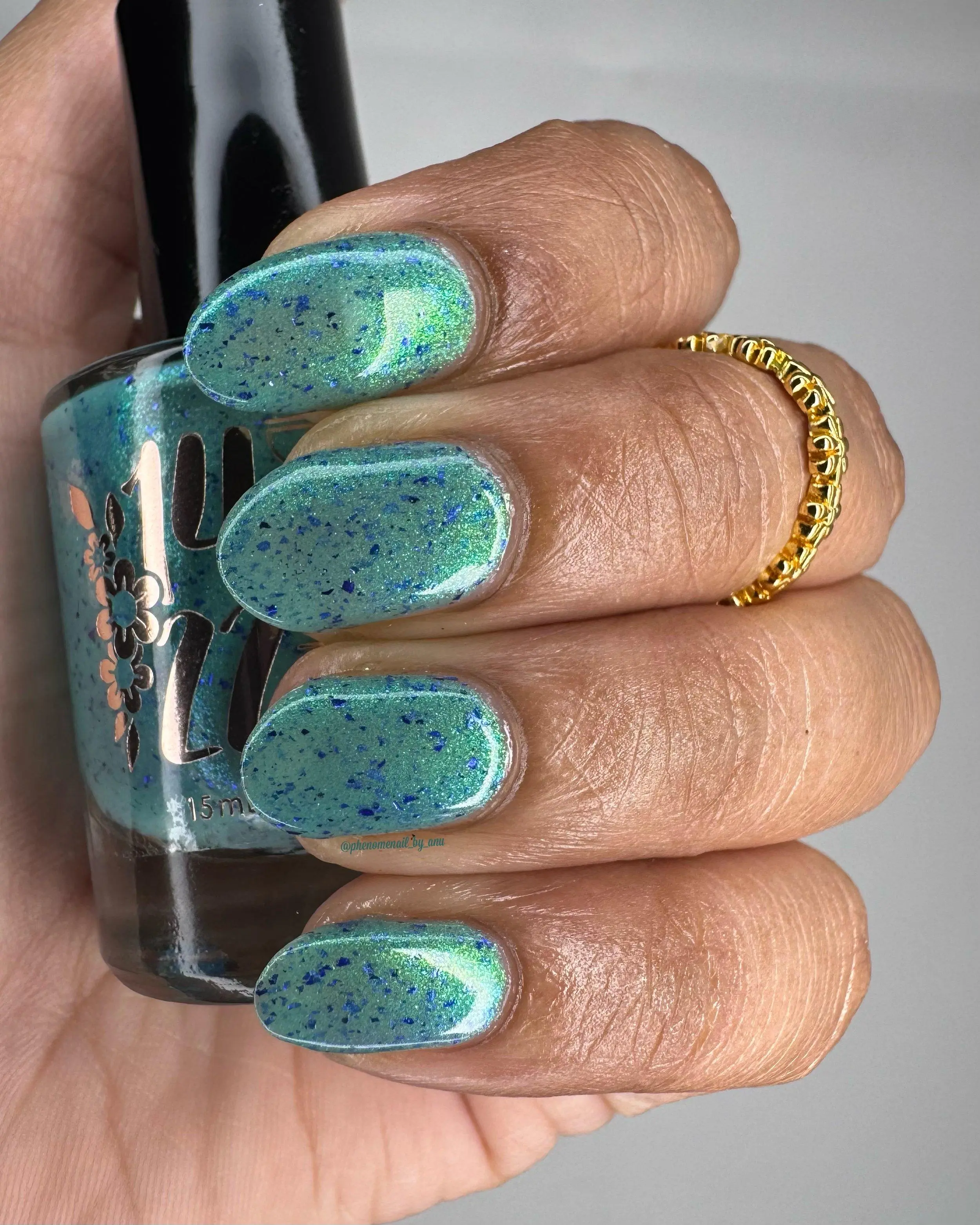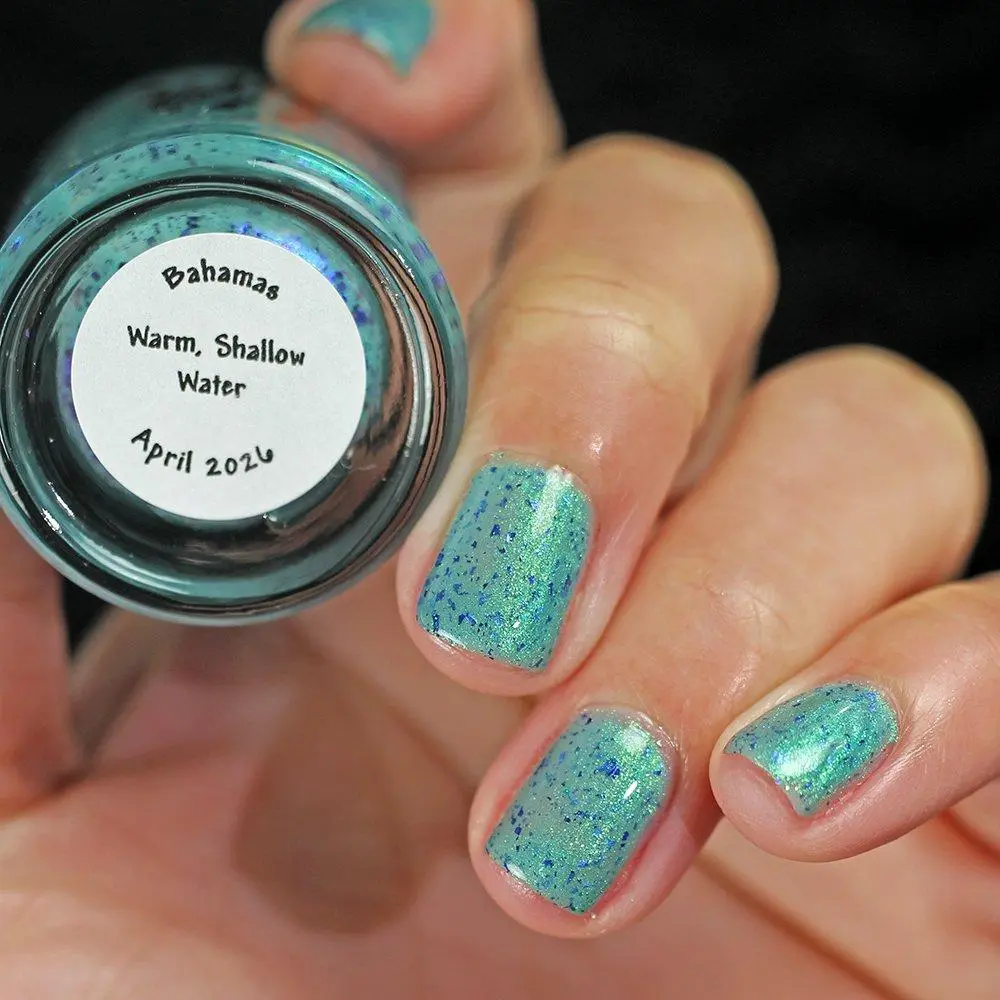 Teal base with a shifting shimmer that moves between green, teal, blue, and purple. Very fine shimmer gives a soft iridescence; scattered blue-purple metallic flakes add contrast and sparkle. Sophisticated by day, luminous by night.
