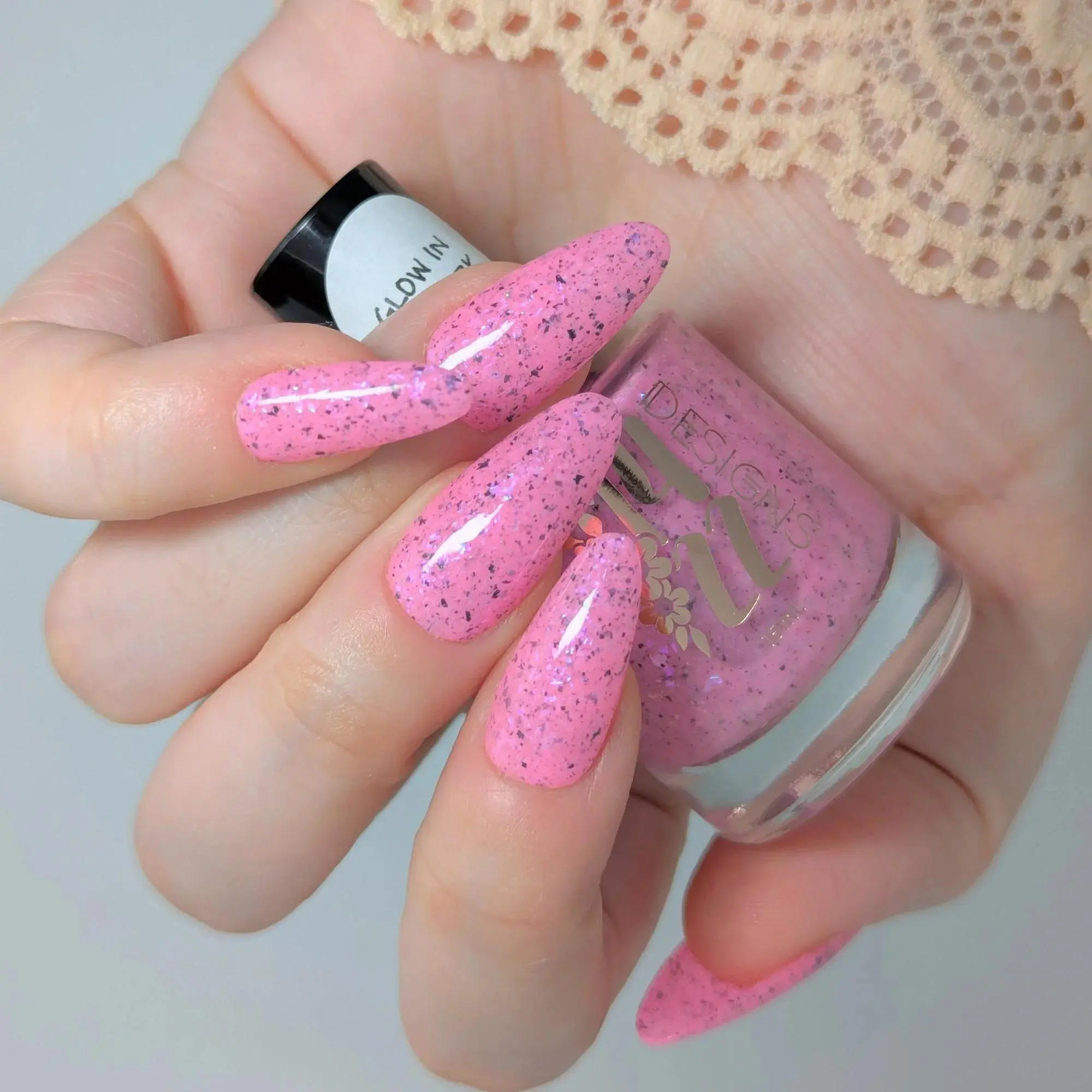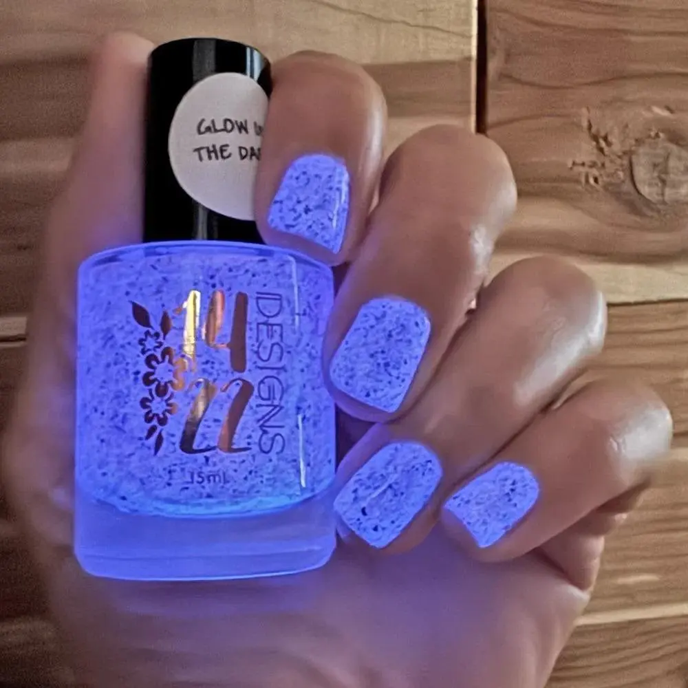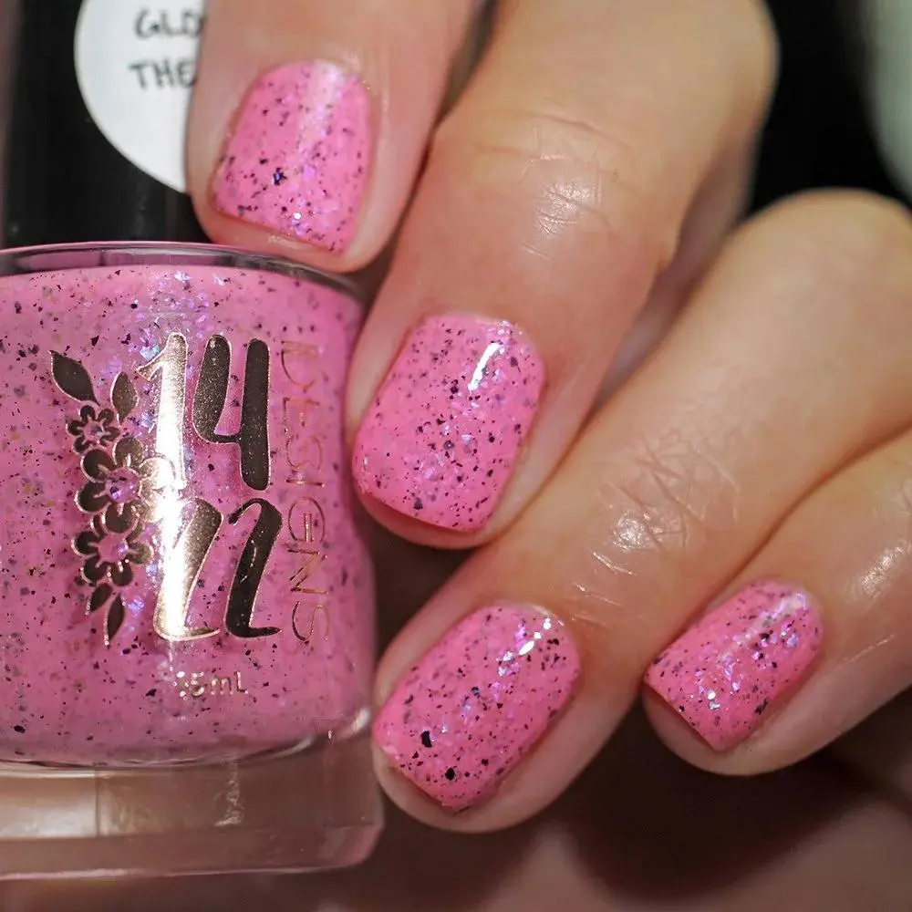 Luminous pink glow-in-the-dark nail polish with pearlescent iridescent flakes and bold black flakes. Great for nights out, festivals, or anyone wanting a modern, eye-catching manicure.