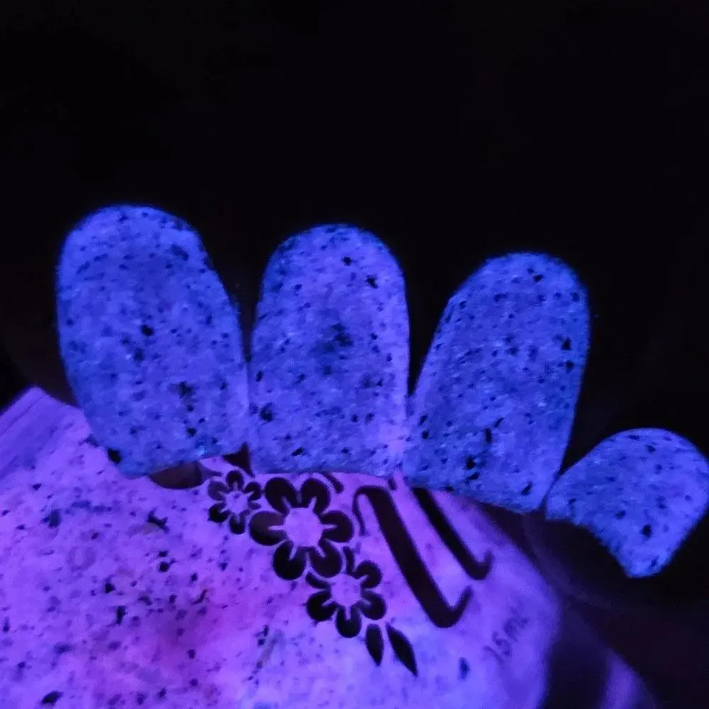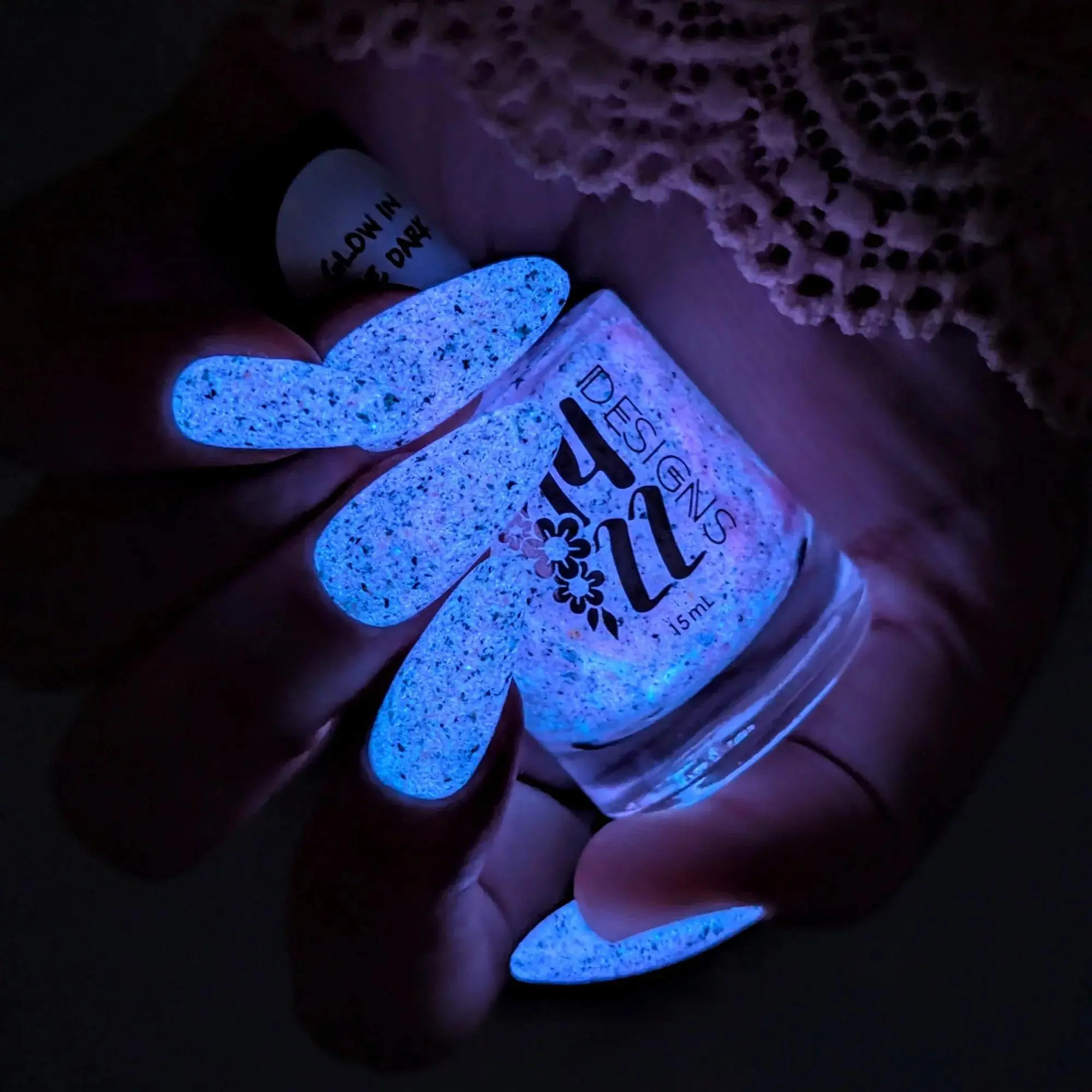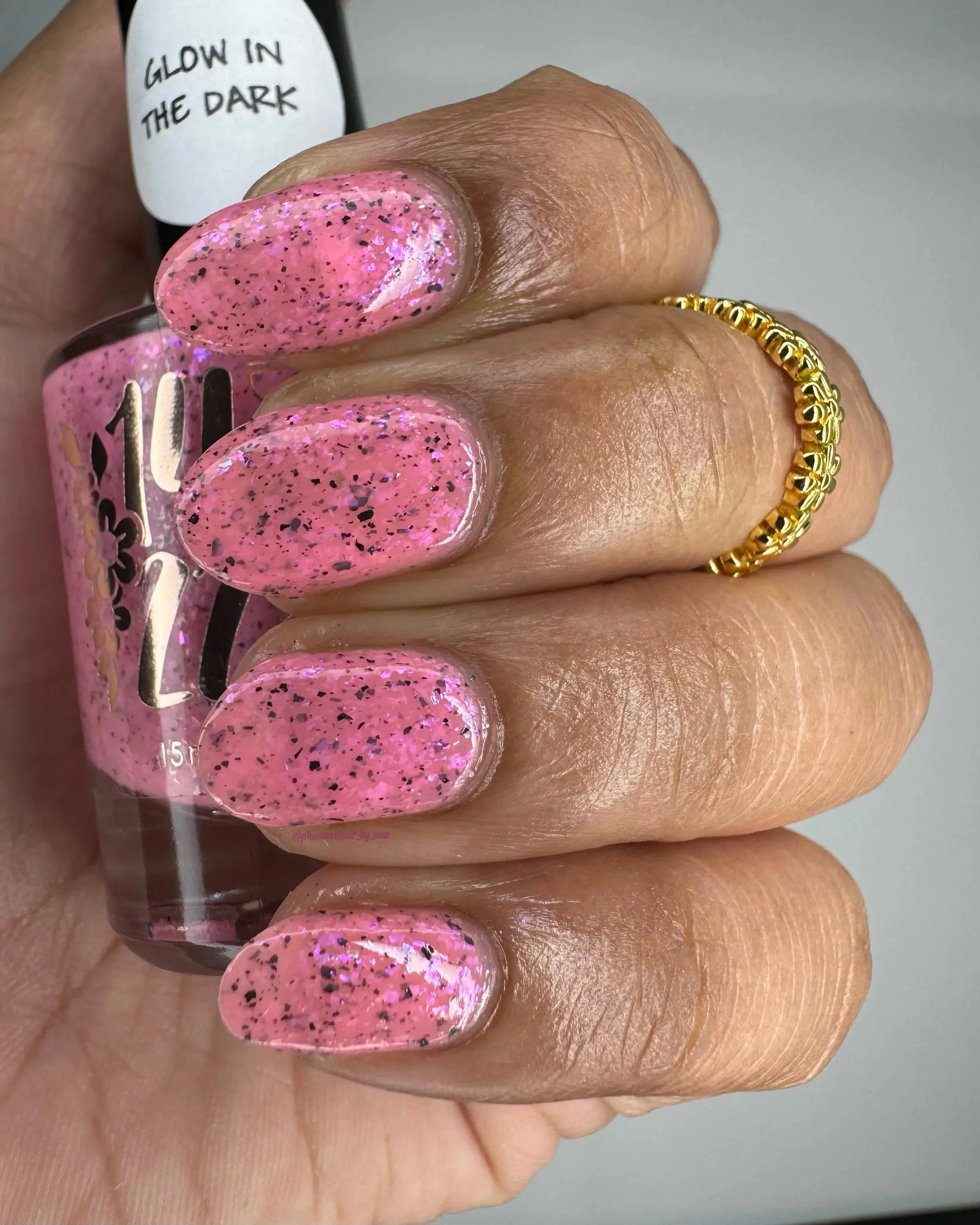 Luminous pink glow-in-the-dark nail polish with pearlescent iridescent flakes and bold black flakes. Great for nights out, festivals, or anyone wanting a modern, eye-catching manicure.