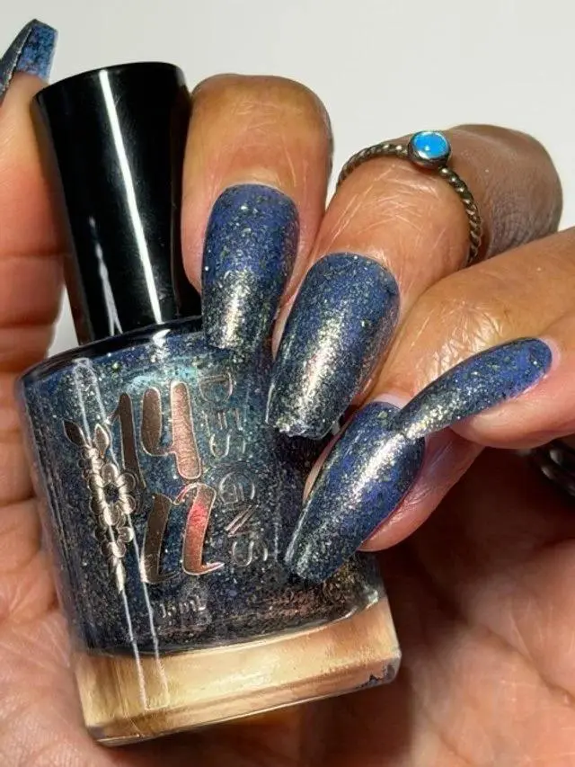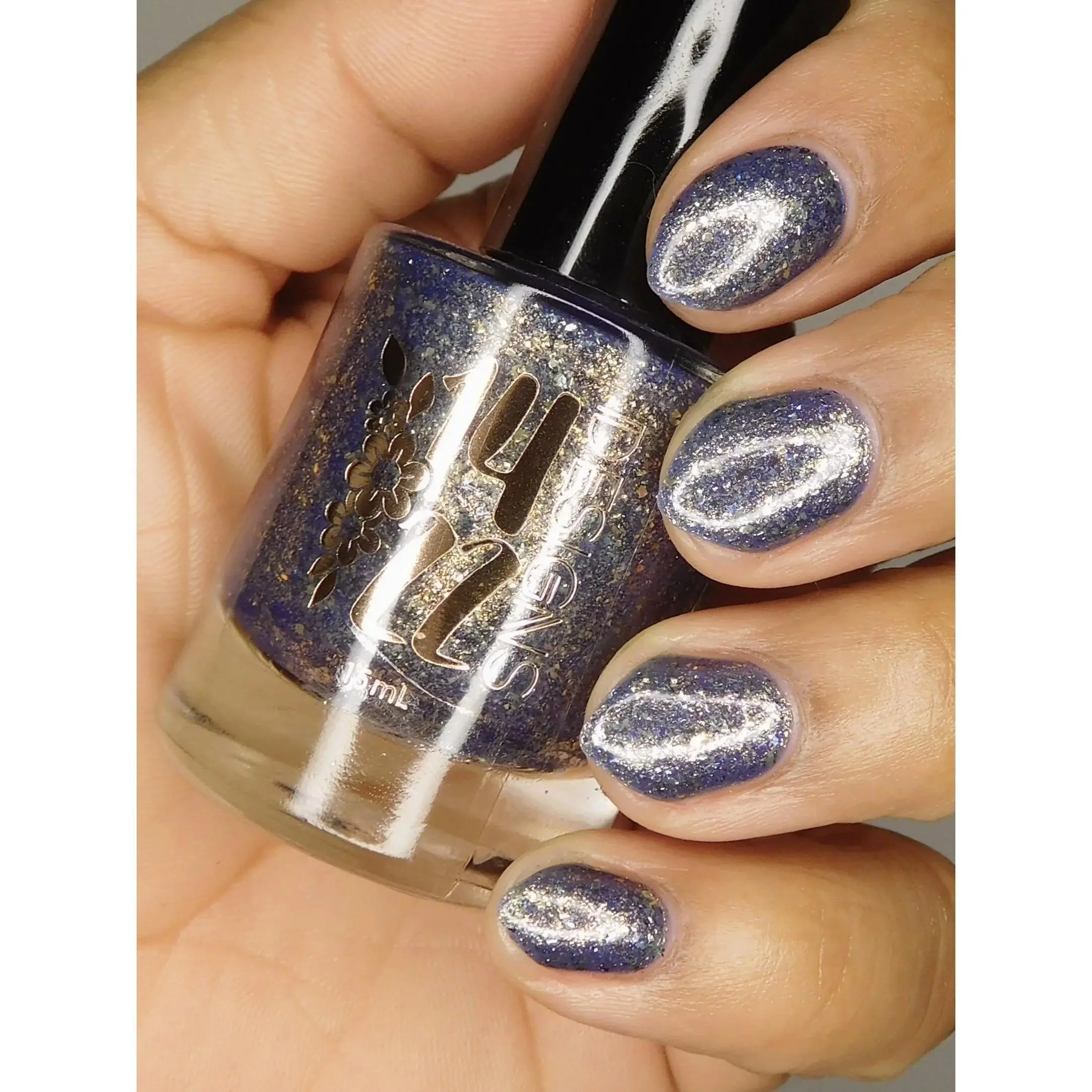 A deep blue nail polish that dazzles with a rich blend of copper sparks, gold flakes, and platinum flakes. The polish captures the depth of a midnight sky, enhanced by shimmering metallic accents that catch the light with every movement. Perfect for adding a touch of elegance and sparkle to your manicure, this polish delivers a unique, multidimensional finish that is both bold and sophisticated.