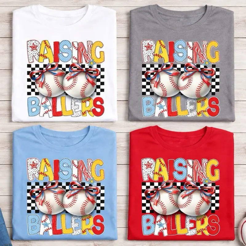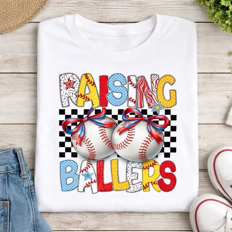 Bring the spirit of the ballpark wherever you go with this bold and fun “Raising Ballers” tee! Perfect for proud baseball moms, dads, and supporters, this design blends sporty vibes with playful style.