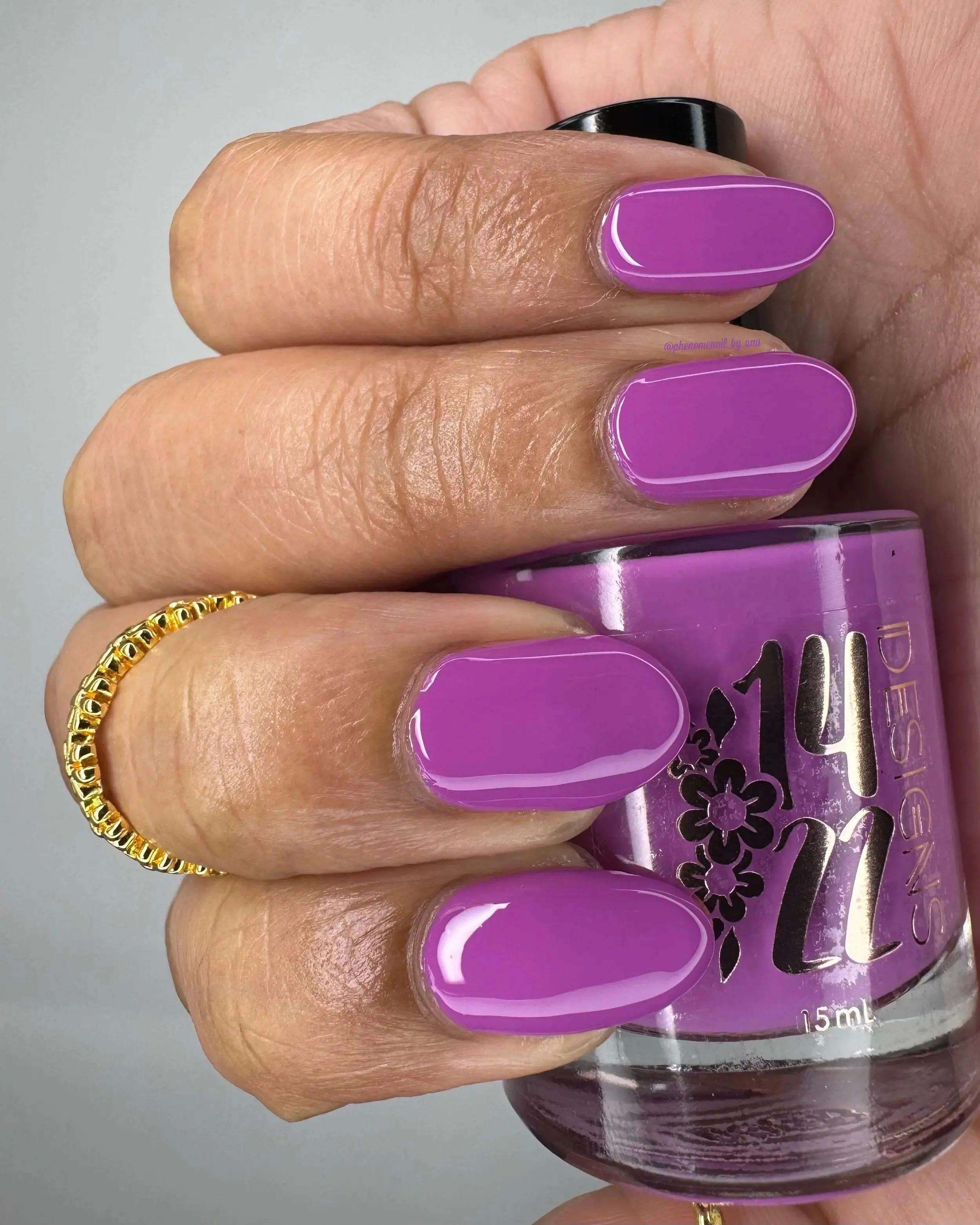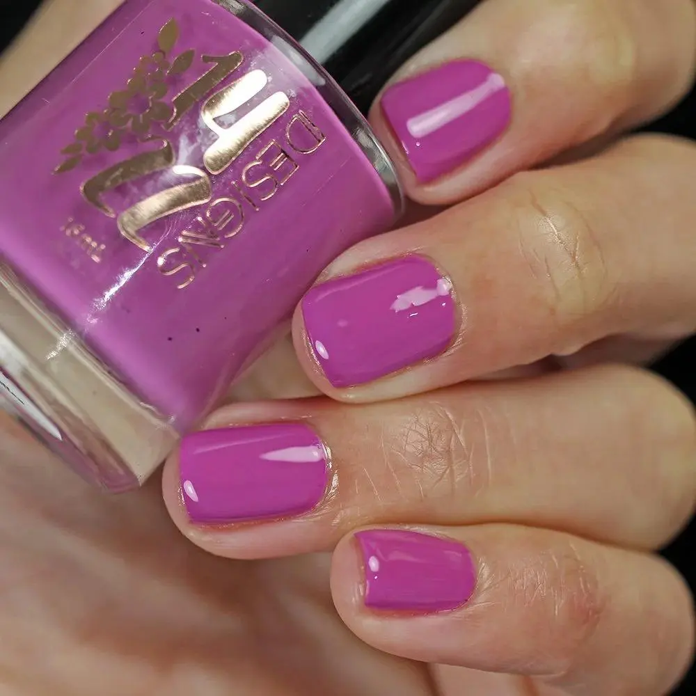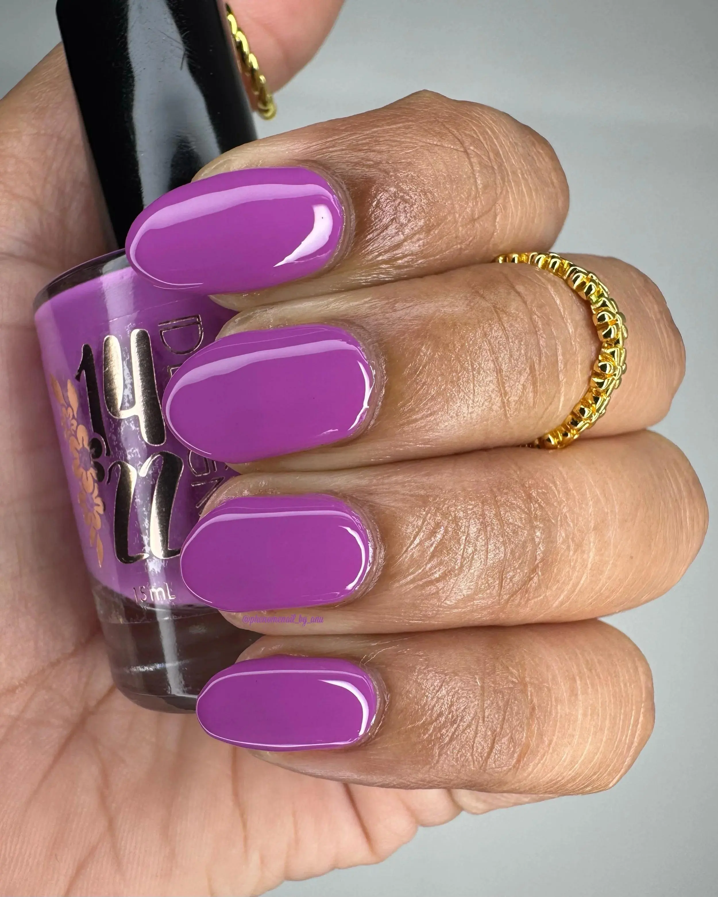 A smooth mid-tone purple with a soft orchid tint and creamy finish. Gives full, even coverage in two thin coats for a salon look. Great for everyday or to dress up neutrals; suits many skin tones and pairs well with muted gold, deep navy, and soft neutrals. Use a base coat for longer wear and a top coat for extra shine.