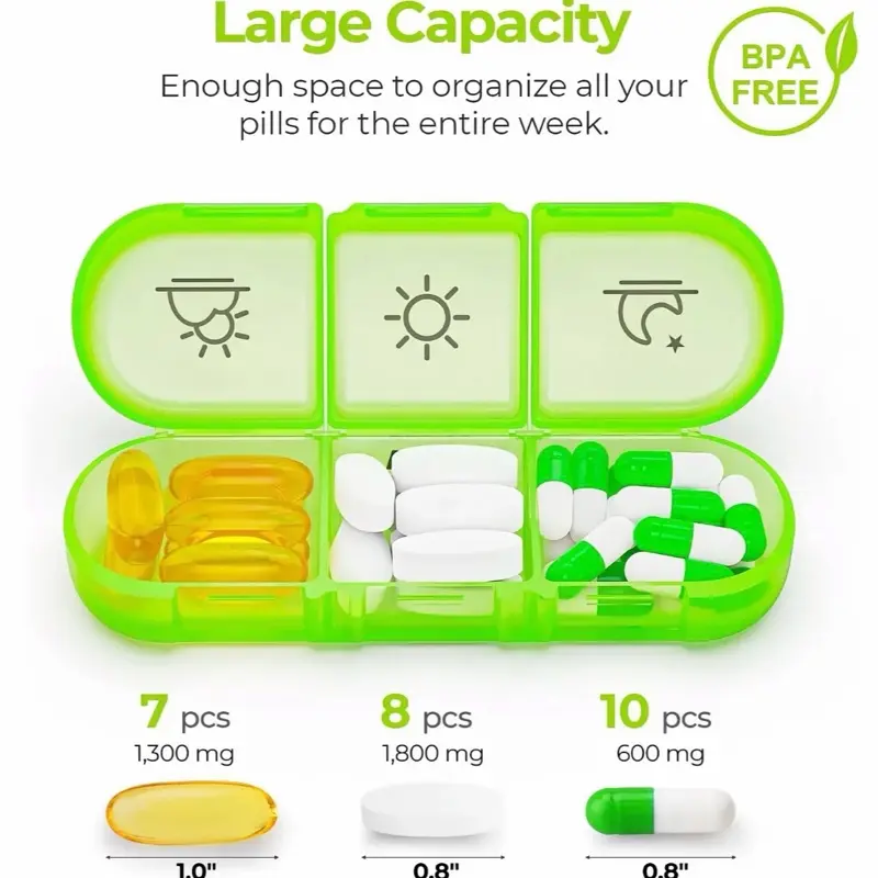 ·Extra Large Capacity. This 7 day medication organizer is designed with a large capacity for you to fill and sort your one week pills in advance, you can keep track and maintain your medication regimen (Morning, Noon, Evening) easier with it. Each compartment can hold 7 fish oils and 10 capsules. (Size of each compartment:1.4"x1.3"XO.7", overall size: 6.18"x 4.4"x1.5")