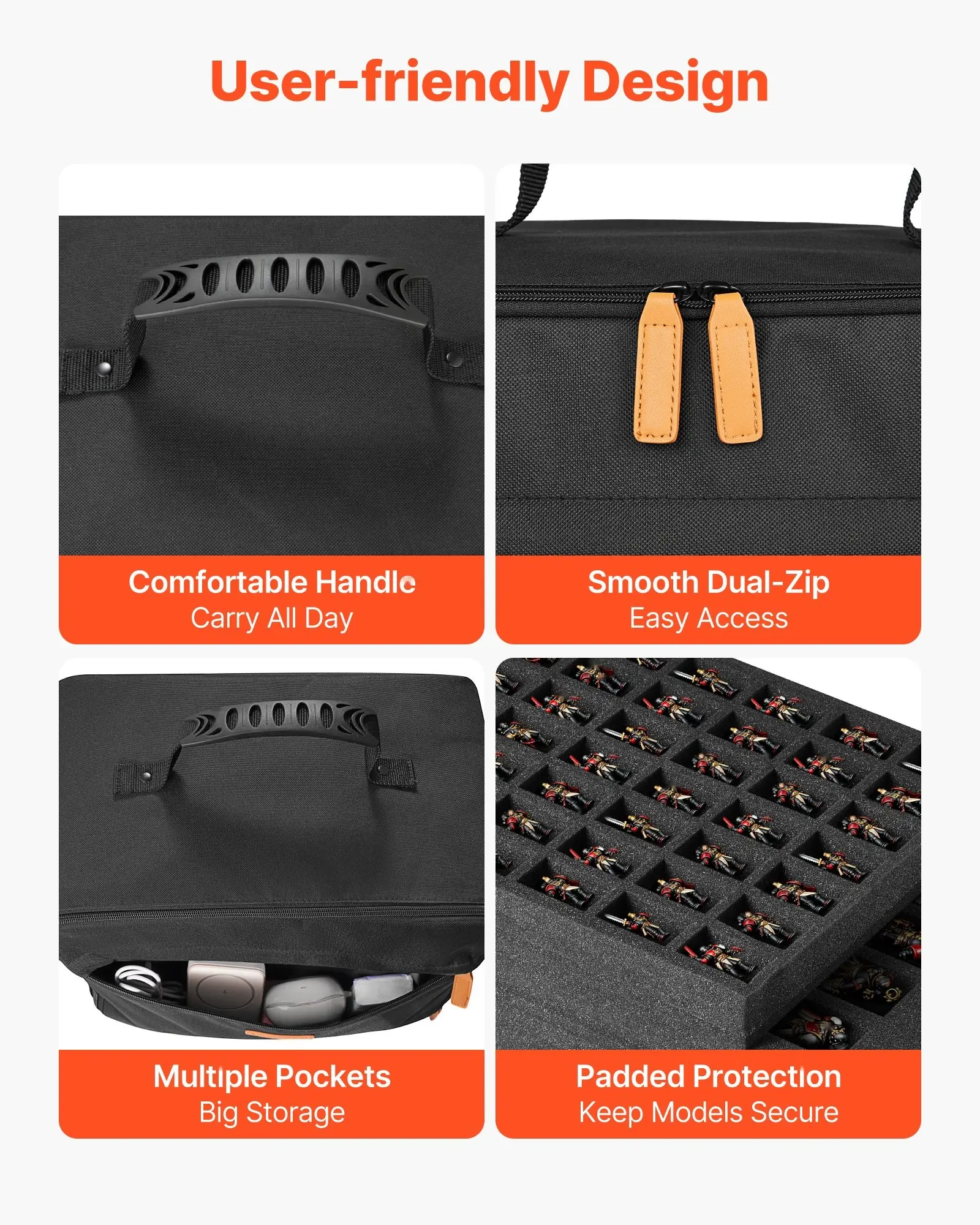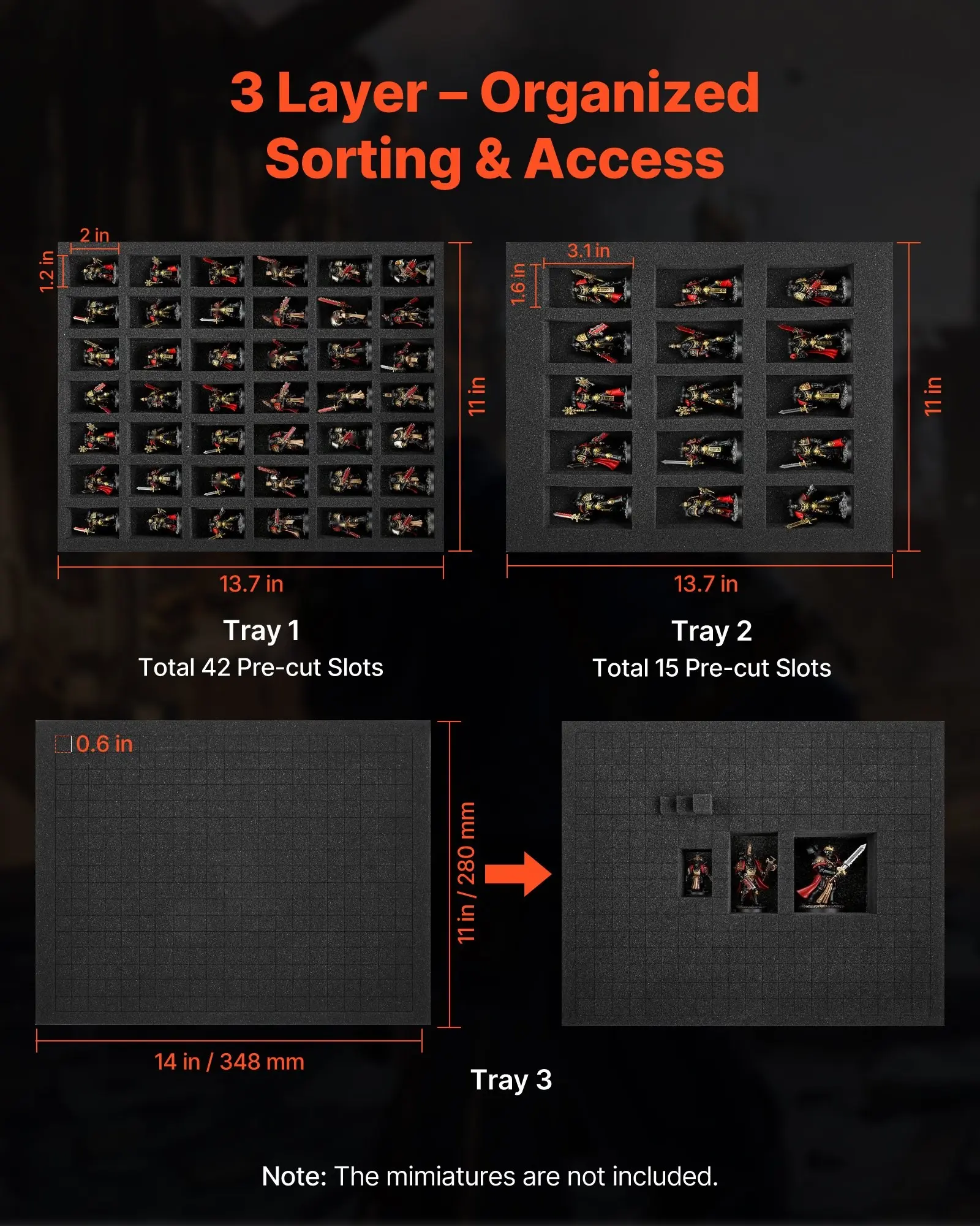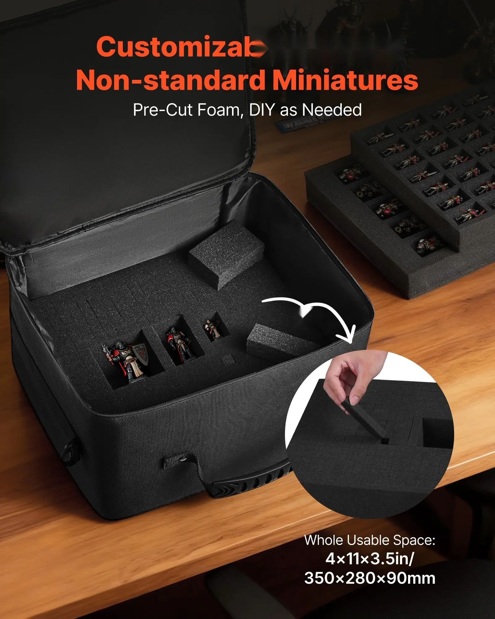 This miniature transport bag uses triple-layer foam: a 42-slot pre-cut top, a 15-slot middle, and a trimmable bottom. You tailor compartments so different model sizes ride snug, organized, and easy to reach.