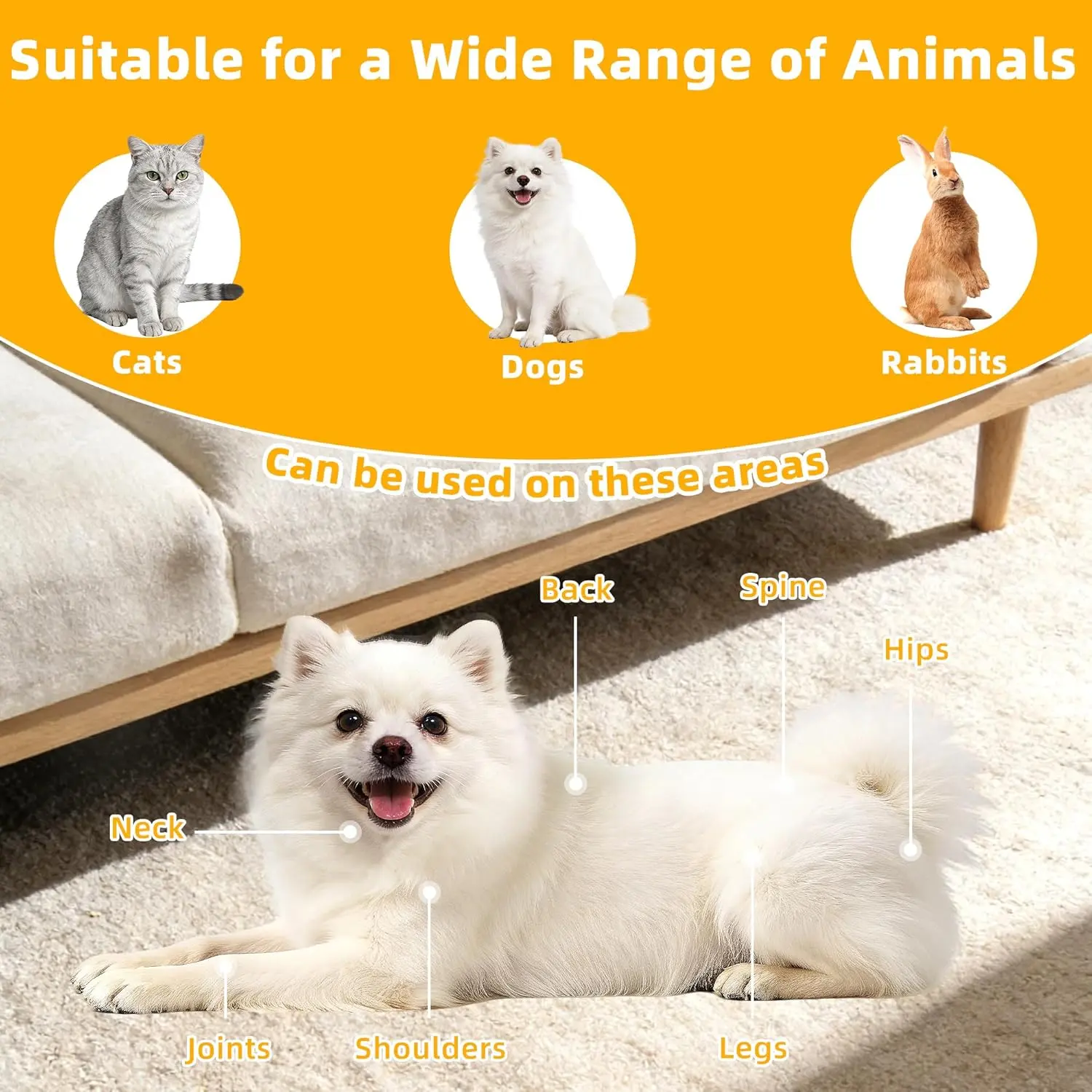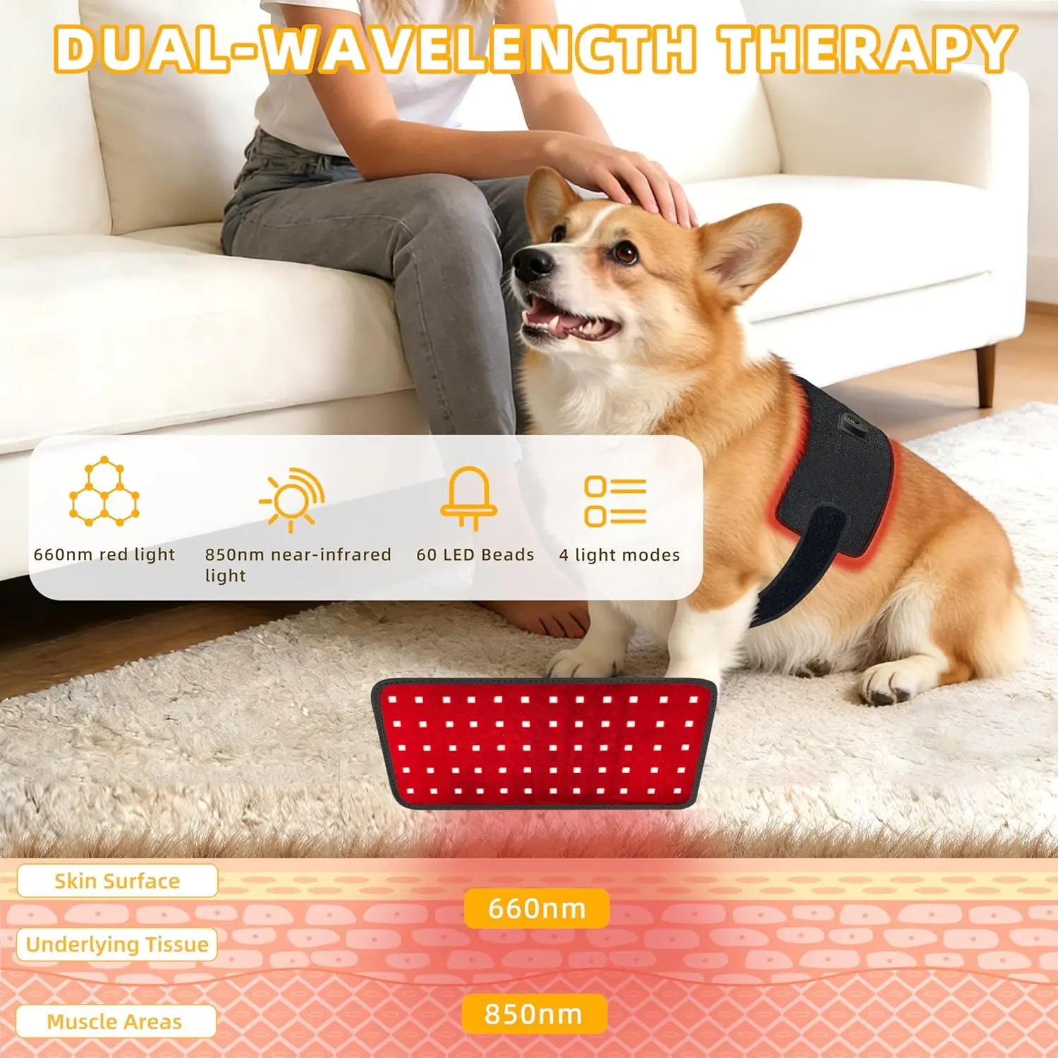 ·【Dual-Wavelength Light Therapy】Engineered with 660nm red light and 850nm near-infrared light, this infrared red light therapy pad features 60 LEDs to deliver balanced, pet-friendly light coverage for dogs and cats. Designed for pet muscle recovery light routines, it supports everyday muscle relaxation, helps ease joint stiffness, and promotes calm recovery after activity through gentle infrared light therapy.