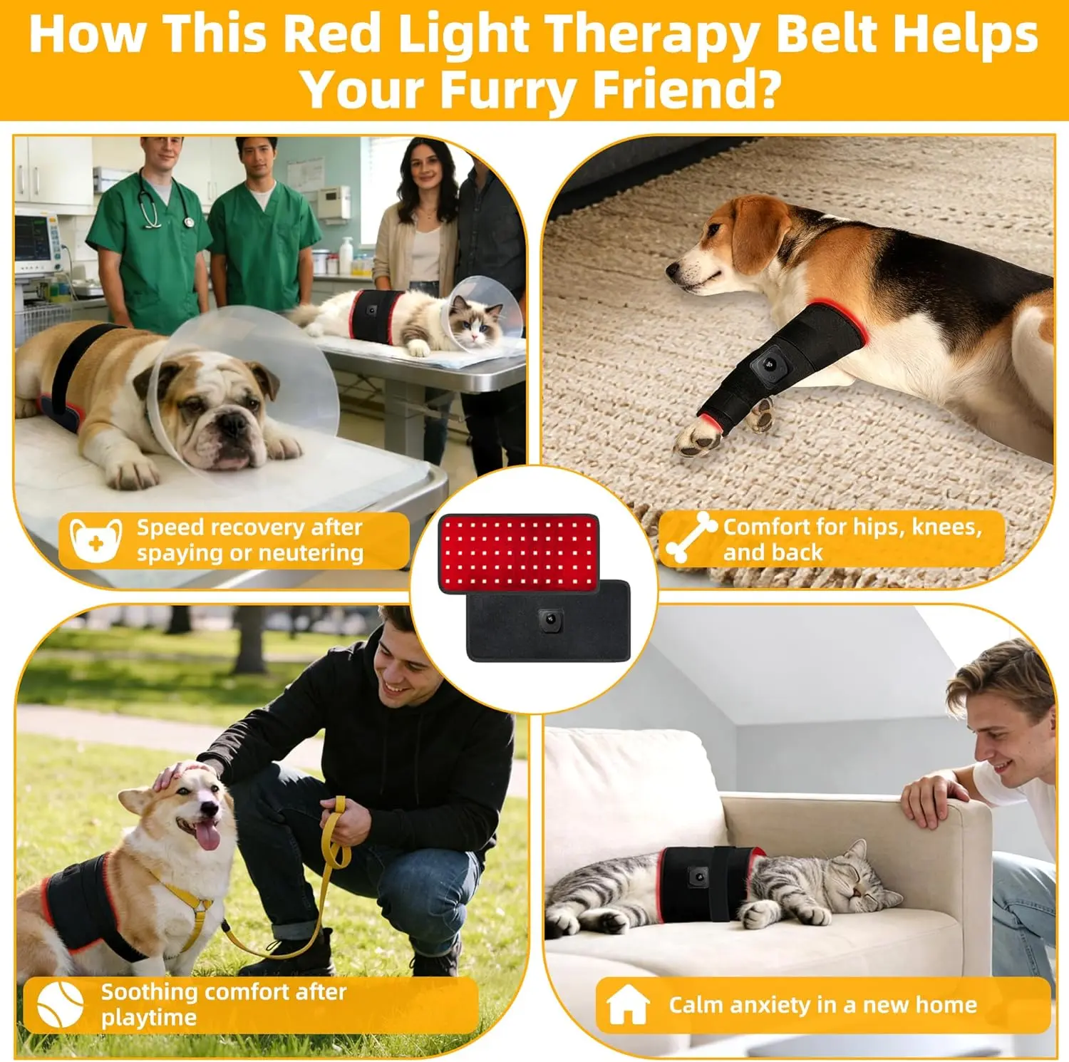 ·【Cordless Wearable & Portable Design】Unlike plug-in devices, this dog red light therapy belt offers true cordless convenience, allowing pets to rest or move freely during sessions. Designed as an LED red light belt for pets, it uses adjustable bandage fixation to stay securely positioned on joints, back, hips, or other targeted areas—safe, flexible, and ideal for everyday home use or travel.