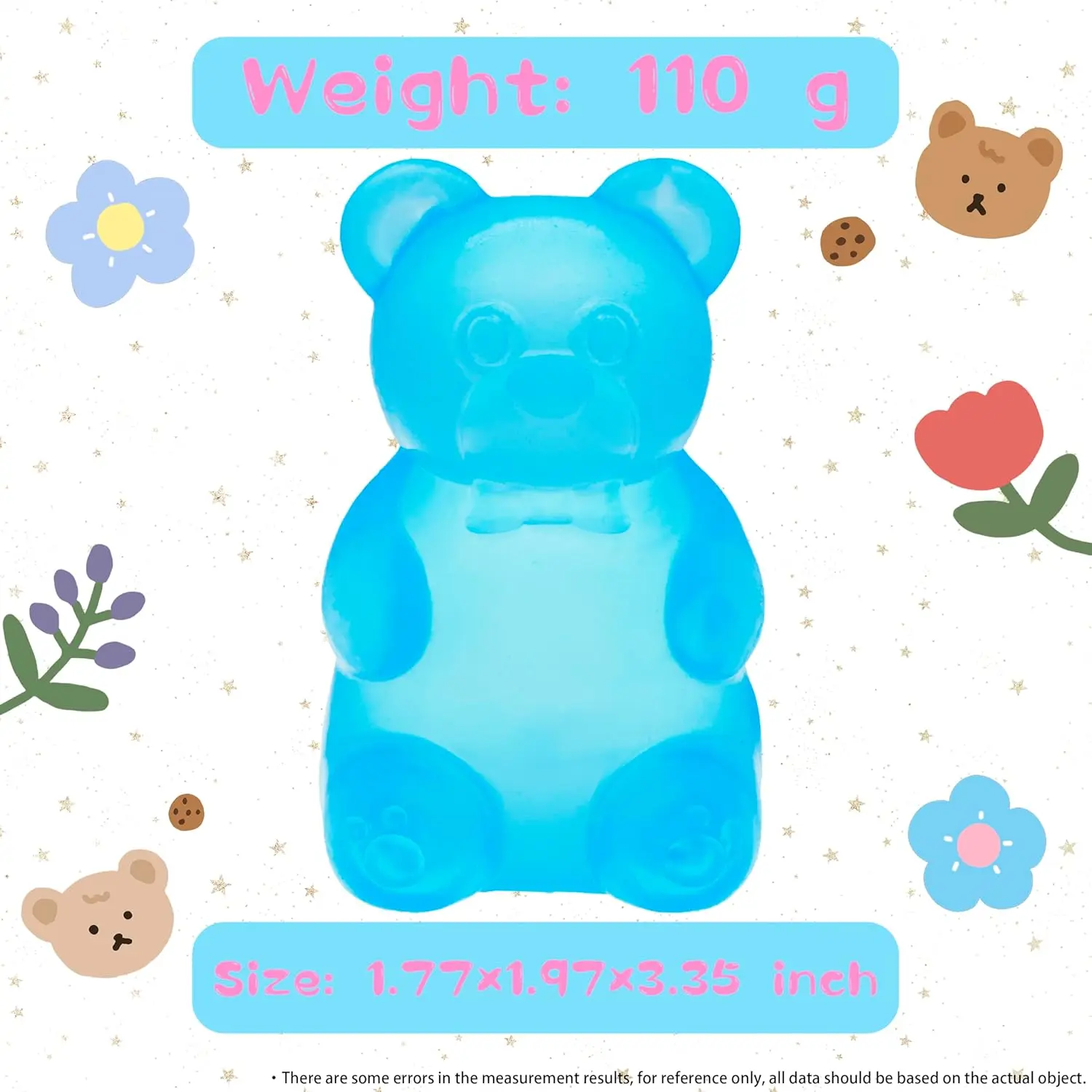 Each gummy bear measures 3.3 inches, making them perfect companions. Ideal for office, classroom, travel, or airplane. Help you stay focused and entertained. Versatile and inclusive, they are ideal for children, educators, teenagers, office workers, athletes, seniors, and those recovering from injuries.