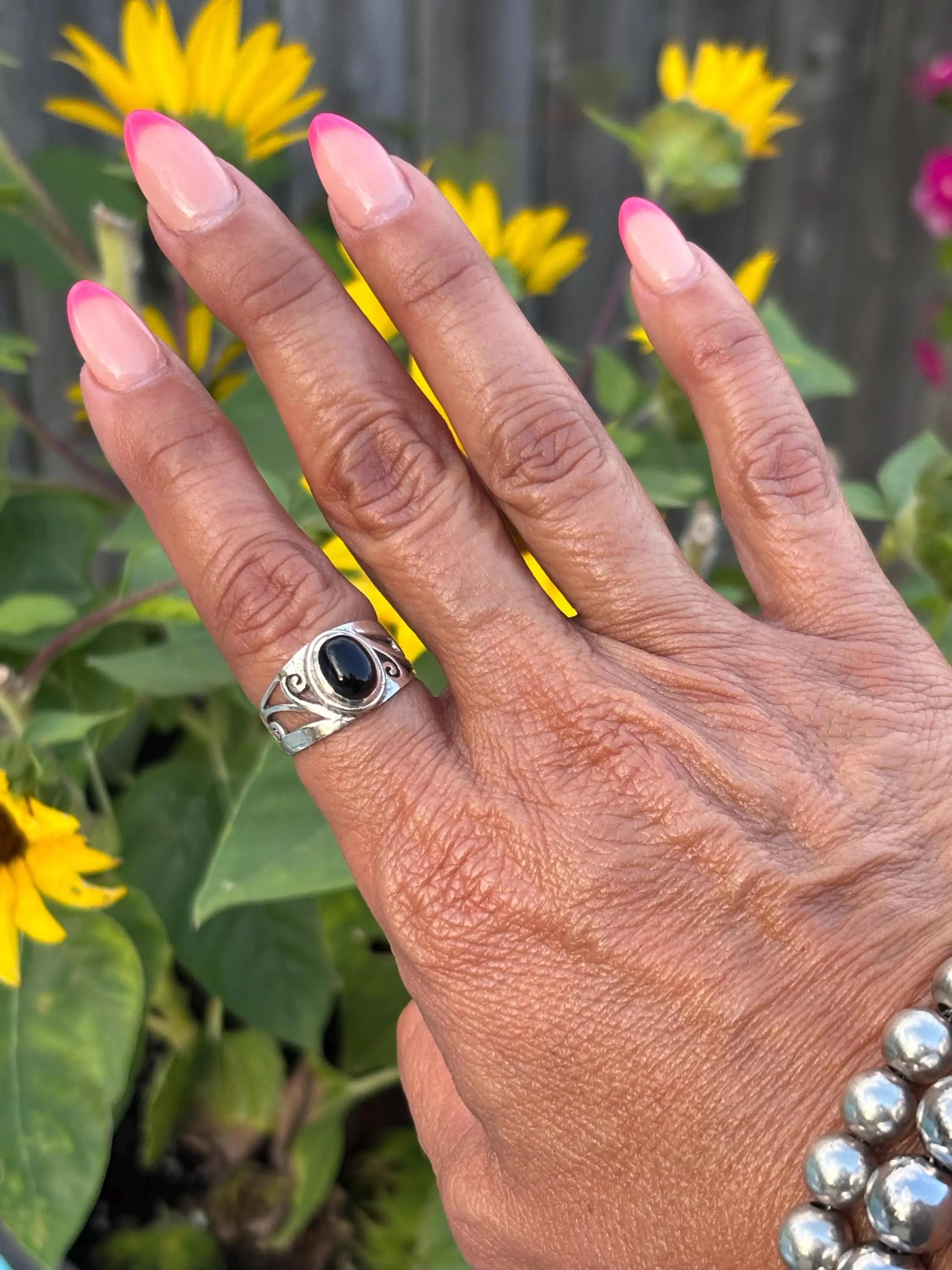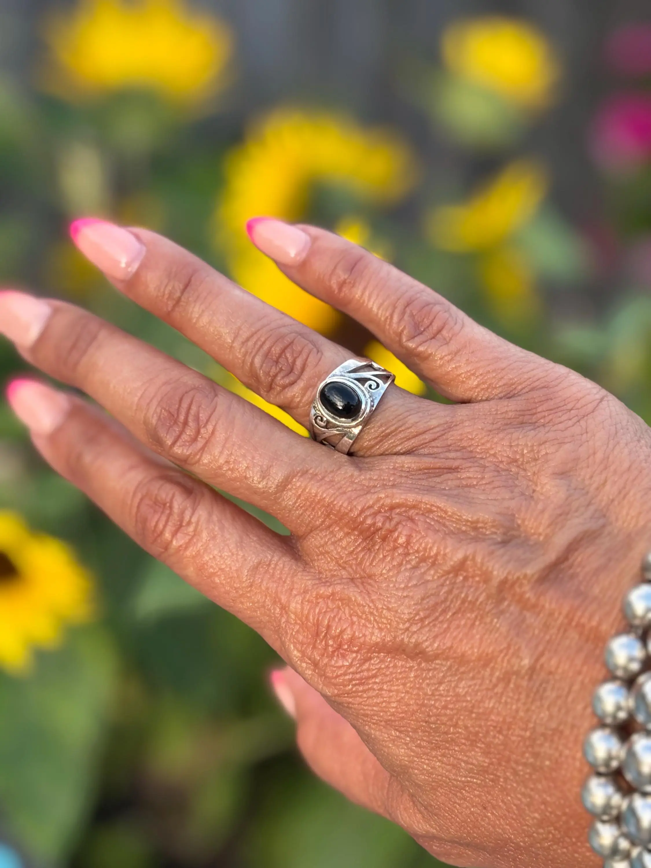 ✨ Details: • Genuine black onyx cabochon • Sterling silver with swirl band design • Ring Size: 7 • Condition: Brand new