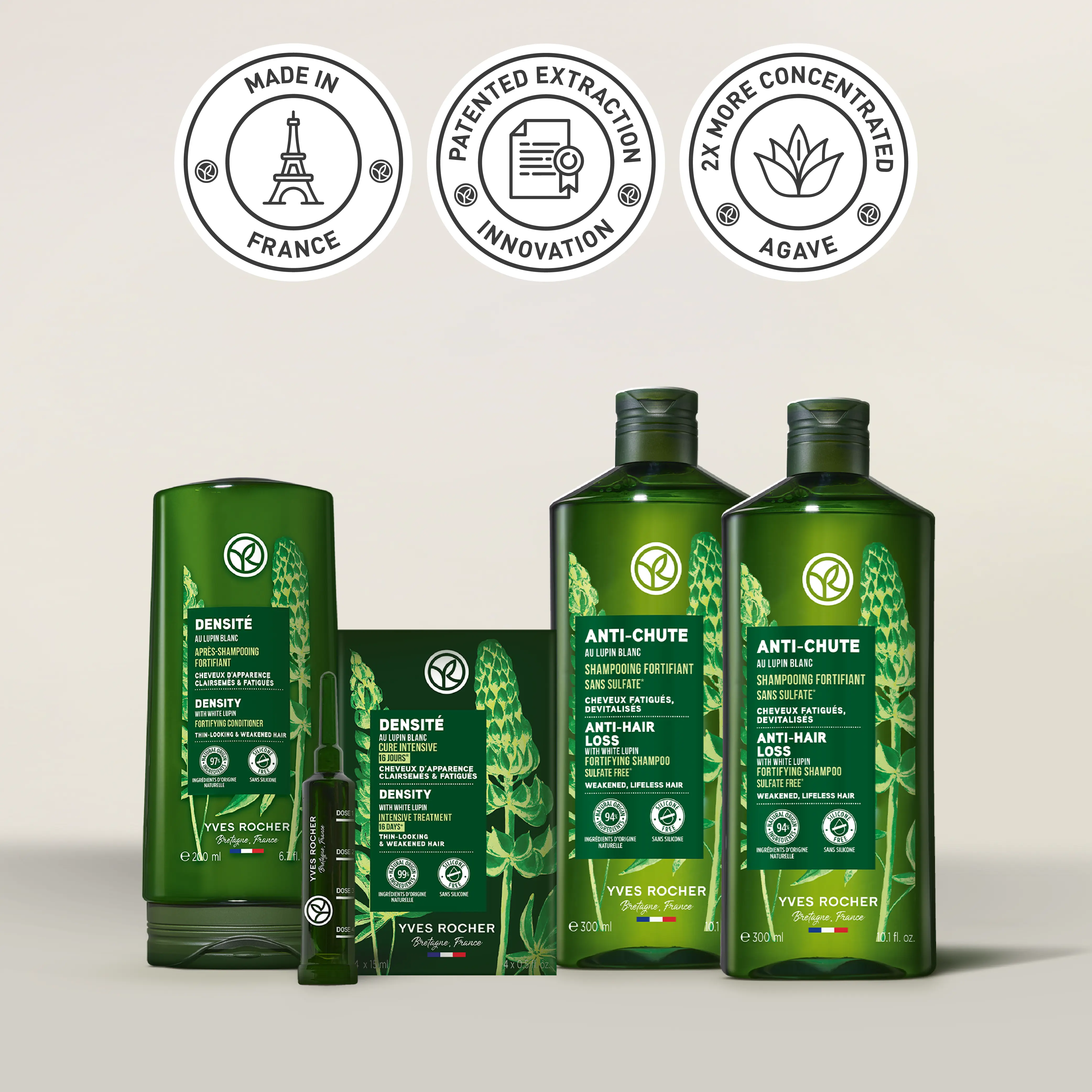 Revitalize and strengthen your hair with this complete 4-product system designed to promote denser hair. Infused with powerful natural ingredients like Organic Agave and White Lupin, this routine is formulated for weakened, lifeless hair, delivering visible results with regular use. 1. Fortifying Shampoo (Sulfate-Free) Restore hair density and fortify strands with this gentle, sulfate-free shampoo. Enriched with Organic Agave and White Lupin, it helps strengthen the hair fiber, reducing breakage and stimulating the scalp for healthier growth. Benefits: strengthens and densifies hair 2. Fortifying Density Detangling Conditioner This rich, melting balm instantly detangles and strengthens lengths while providing intense nourishment. With White Lupin and Organic Agave, it fortifies the hair, reducing breakage and making it easier to style. Benefits: 90% reduction in breakage during styling, enhances hair strength and manageability 3. Density Intensive Treatment (16 Days) A revitalizing treatment for stronger, fuller hair.The Density Intensive Treatment works on three essential levels: it helps reduce hair loss, strengthens the hair fiber from root to tip, and promotes healthier, more resilient hair growth. Powered by a botanical blend featuring white lupin extract and a patented anti-hair loss complex, this lightweight leave-in formula helps reactivate the scalp, nourish the hair roots, and improve overall hair density over just 16 days. Hair type: Thinning, fragile hair Texture: Lightweight leave-in lotion Benefits: Reduces hair loss, strengthens, and boosts density Achieve stronger, denser, and more vibrant hair with this scientifically formulated routine, designed to support healthy growth and combat hair loss.
