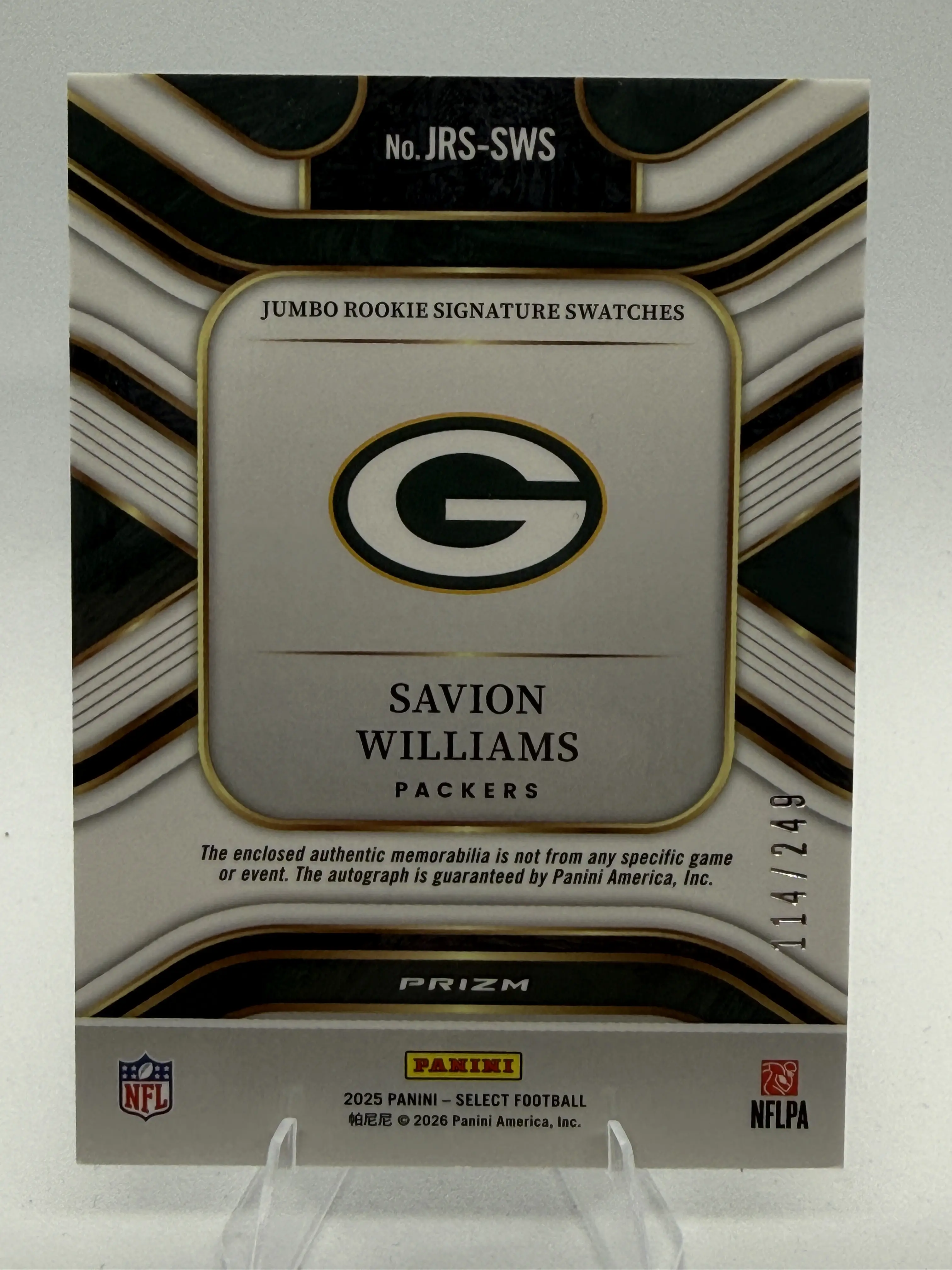The product is a 2025 Panini Select trading card featuring a Jumbo Rookie Signature Swatches insert of Savion Williams from the Green Bay Packers. This limited edition card is numbered #JRS-SWS out of 249 and includes a piece of memorabilia from the player. As a rookie card with serial numbering, it is a highly sought-after collectible for fans of the National Football League, especially those interested in emerging talents like Savion Williams in the 2025 season. This card is a valuable addition to any sports trading card collection.
