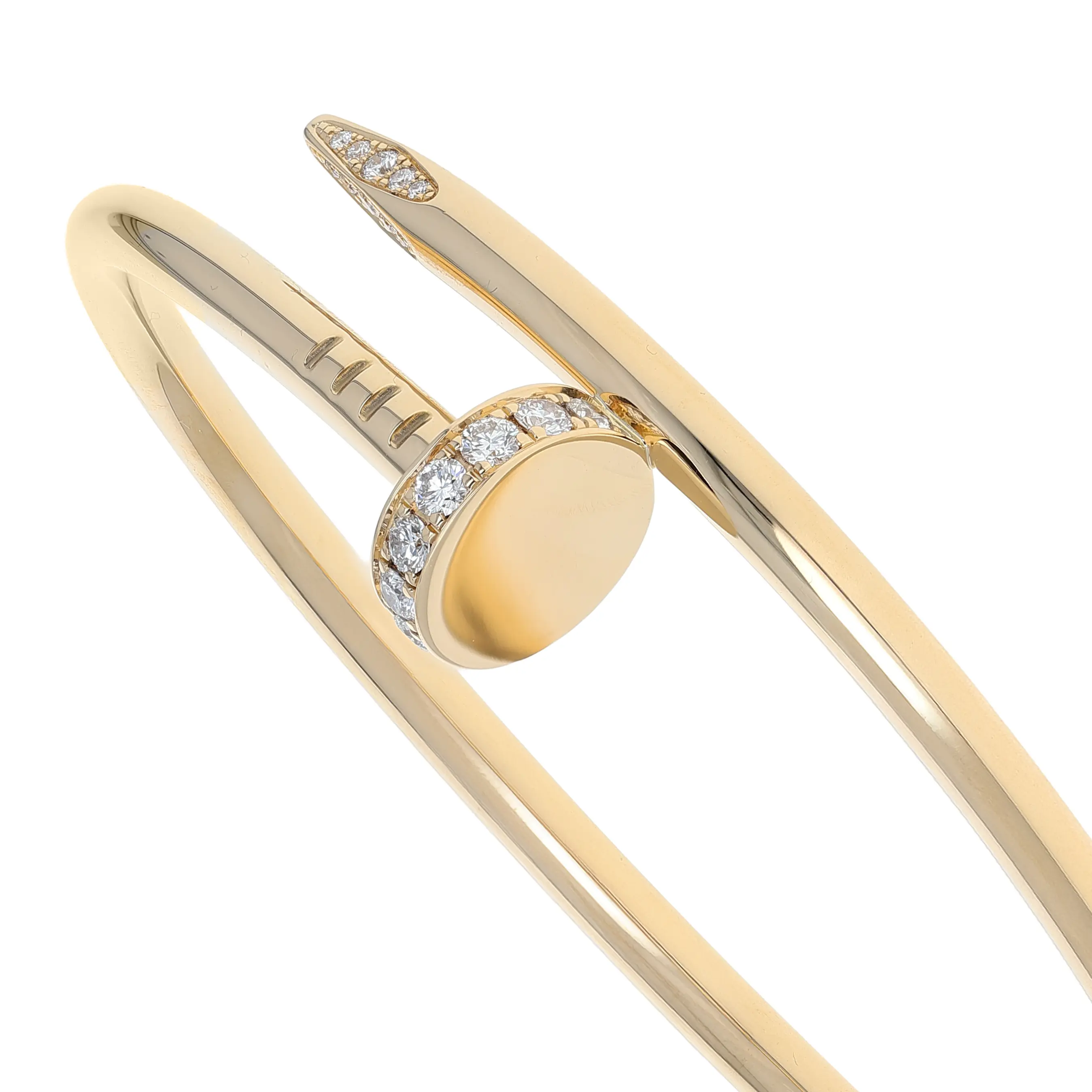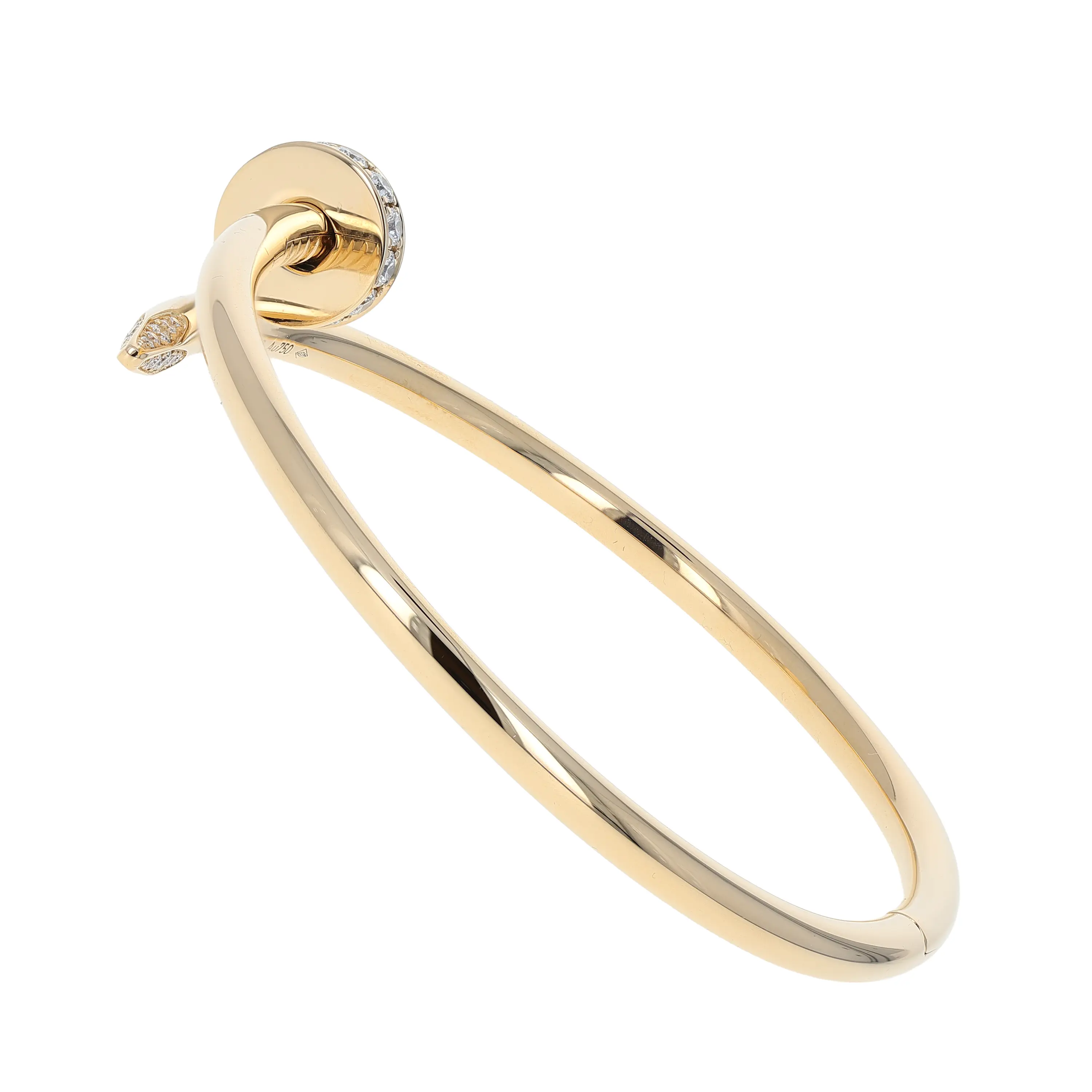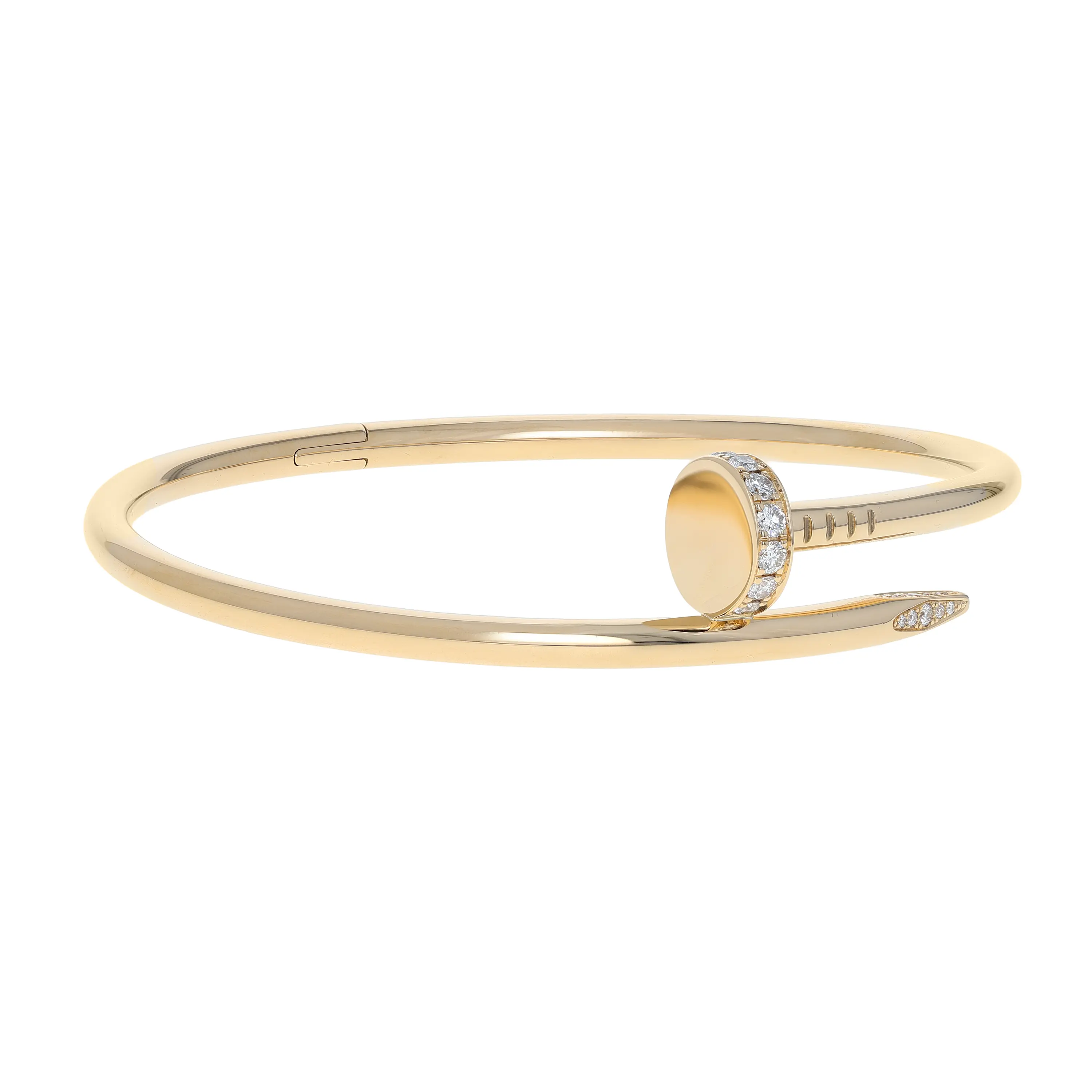 Pre-owned Cartier 18k yellow gold and diamond bangle bracelet from the Juste Un Clou collection. The bracelet features a nail design that wraps once around the wrist and is secured with a hidden hinge. Each end of the bangle is accented with round-brilliant diamonds. The piece is in a size 18 and comes with the original papers.