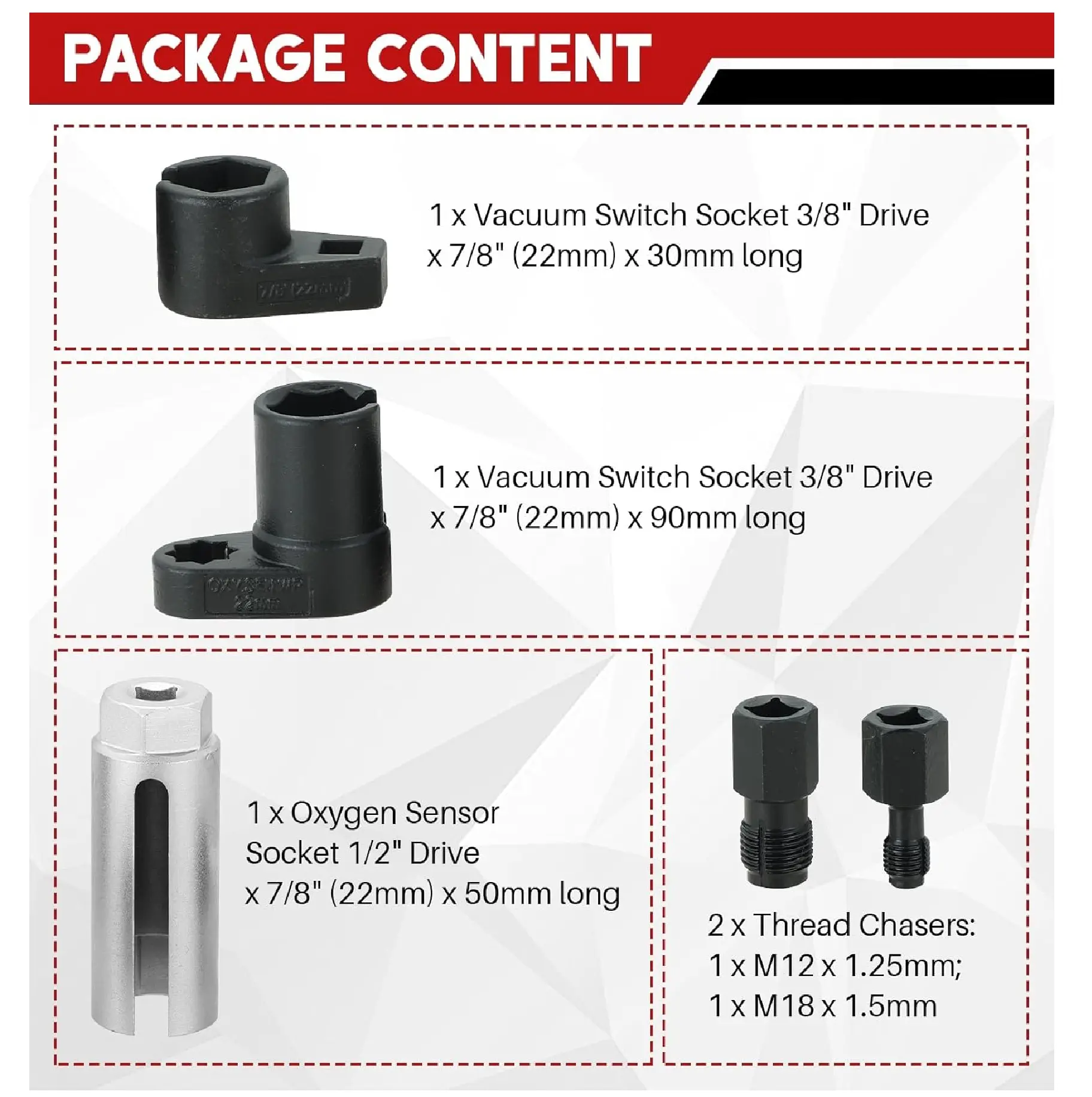 ·Complete 5-Piece Kit – Includes offset socket wrenches and thread chasers for full O2 sensor service