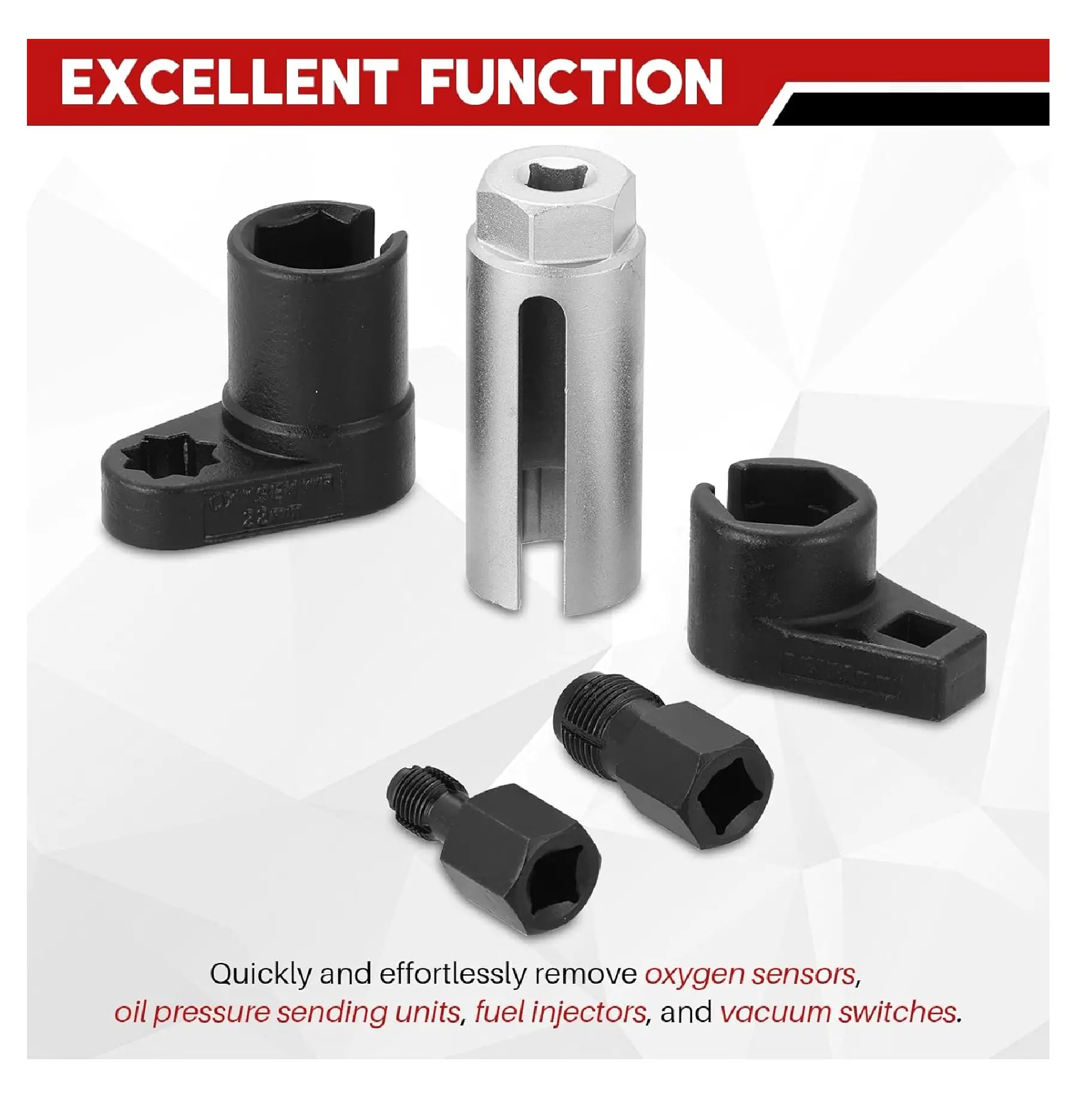 Upgrade your garage with this professional-grade 5-piece Oxygen Sensor Socket Set, designed to make removing and installing O2 sensors fast, clean, and hassle-free. Perfect for both DIY car owners and professional mechanics.