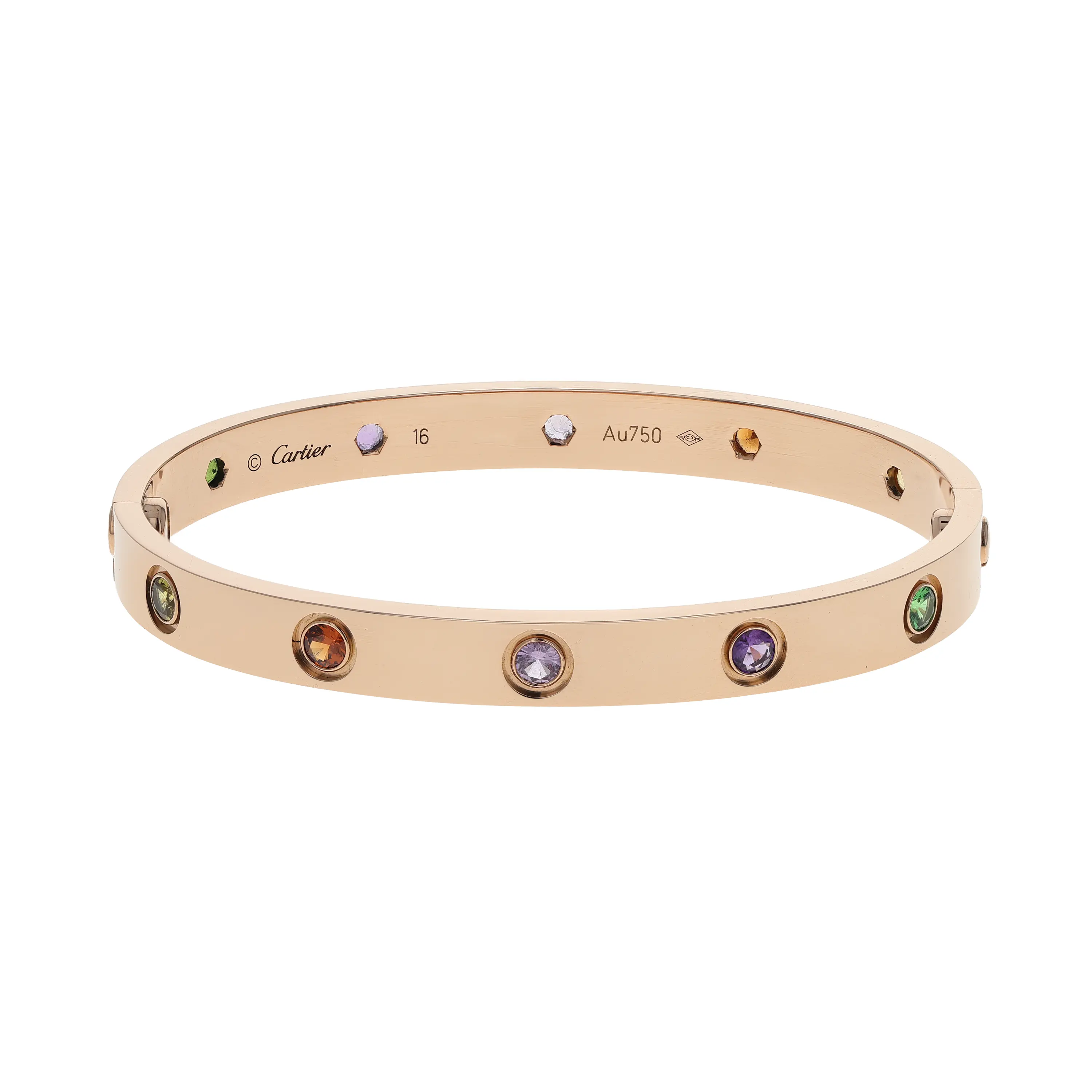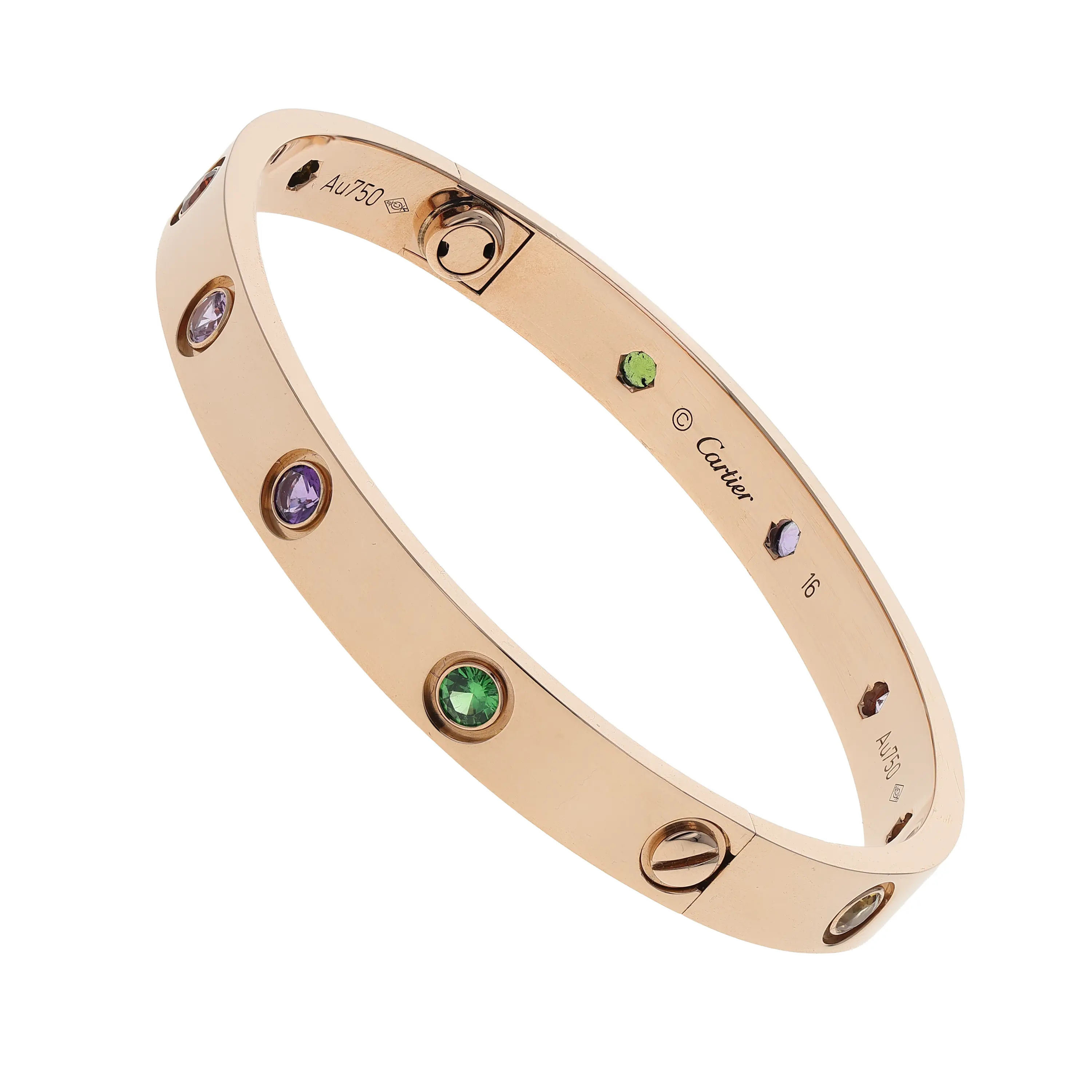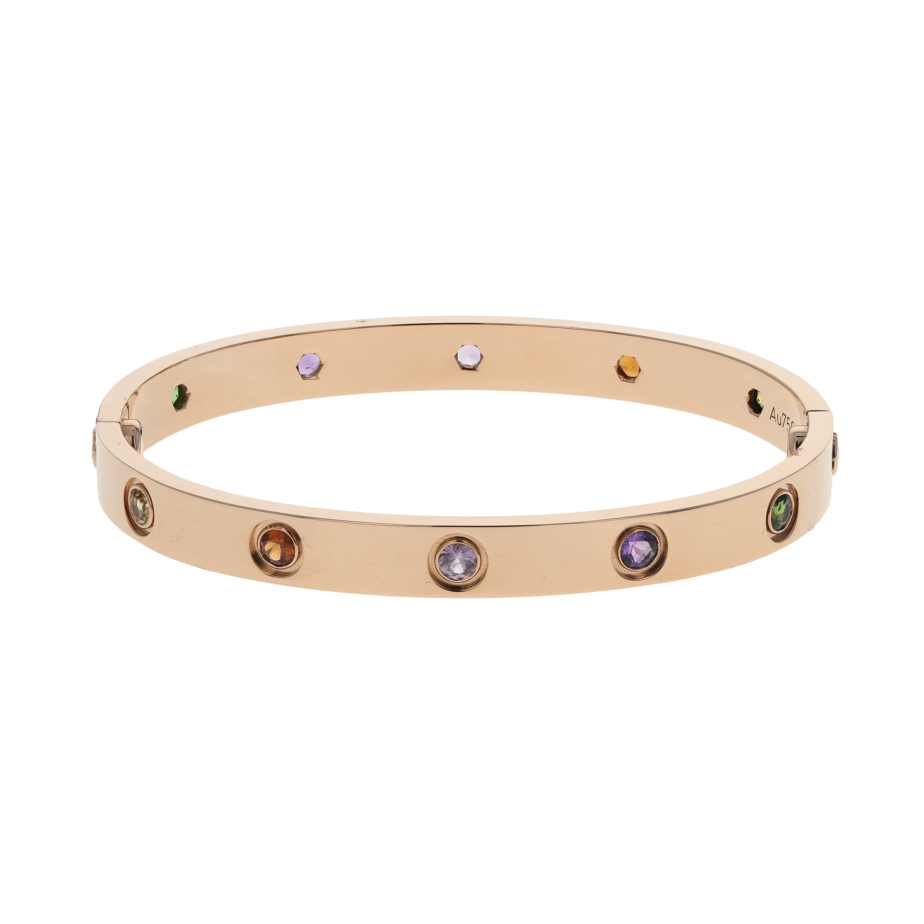 Pre-owned Cartier 18k rose gold and multi-gemstone bangle bracelet from the Love collection. The bracelet features ten round bezel-set gemtones evenly spaced around the outside of the bangle. The piece is in a size 16.