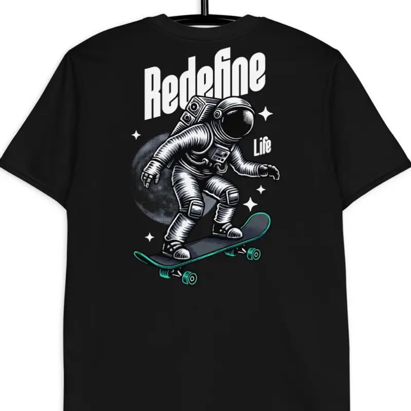Redefine Life T-Shirt features a bold astronaut on a skateboard design. This eye-catching graphic makes a statement for men who love quirky, fun fashion. The design blends space and skate culture, appealing to diverse tastes. Perfect for casual wear, it adds a playful twist to your wardrobe.