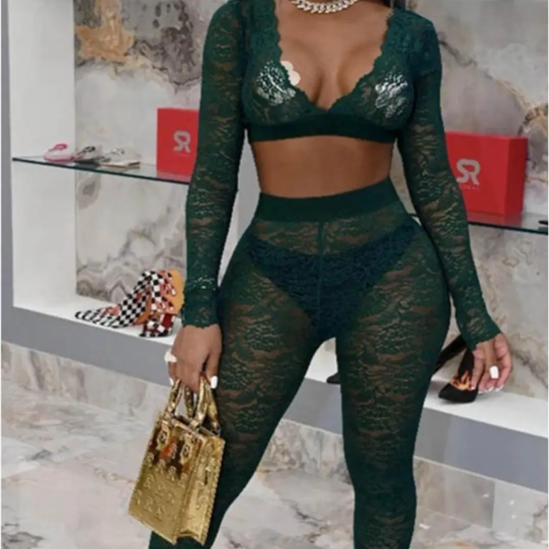 Lady Luxe Fashions Women’s Floral Lace Two‑Piece Set – Long‑Sleeve Lace Crop Top and Matching Leggings