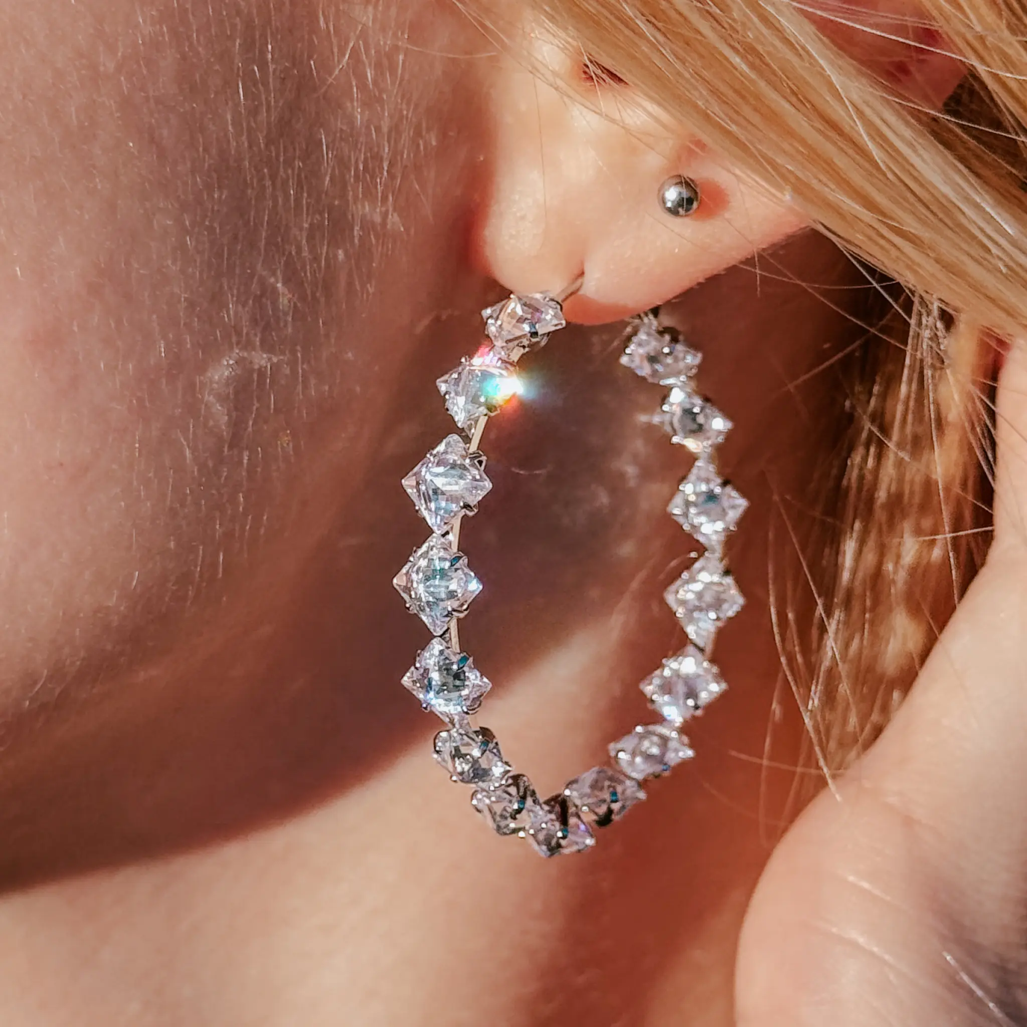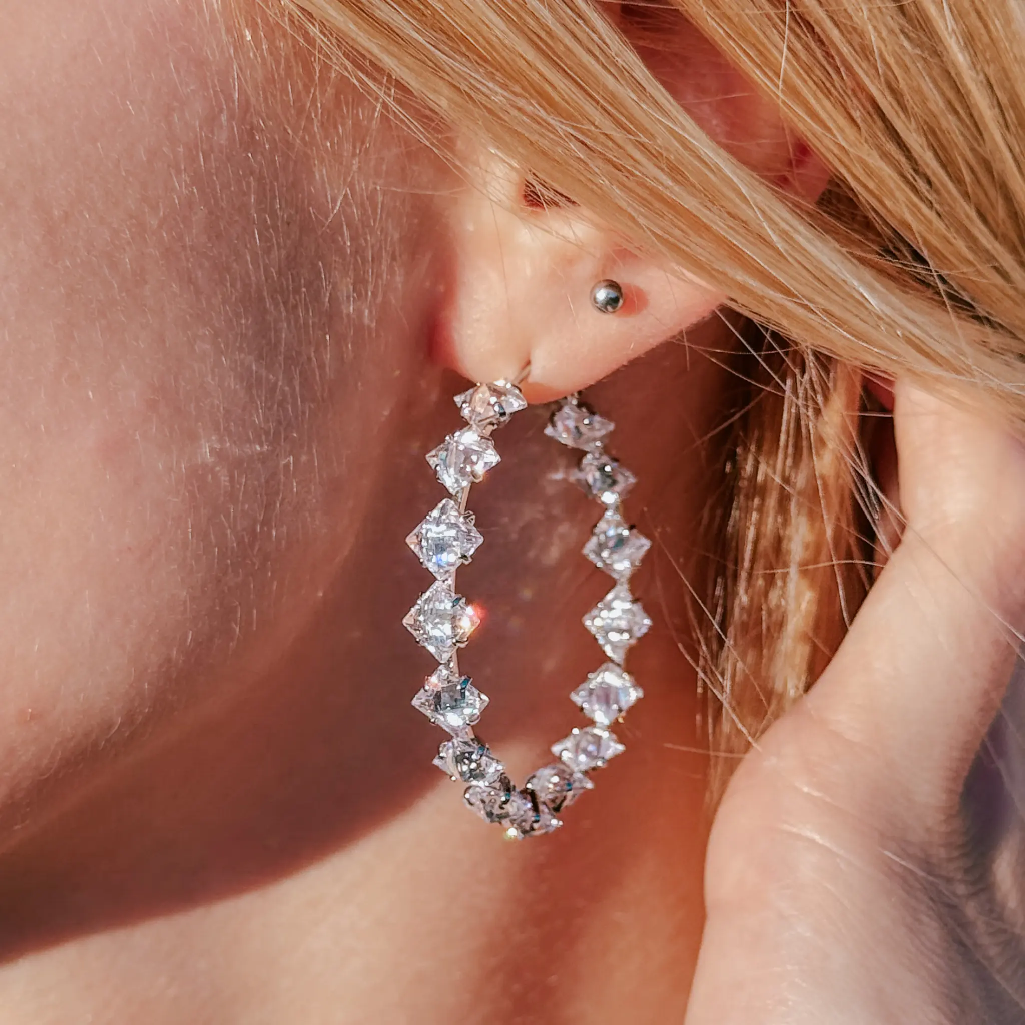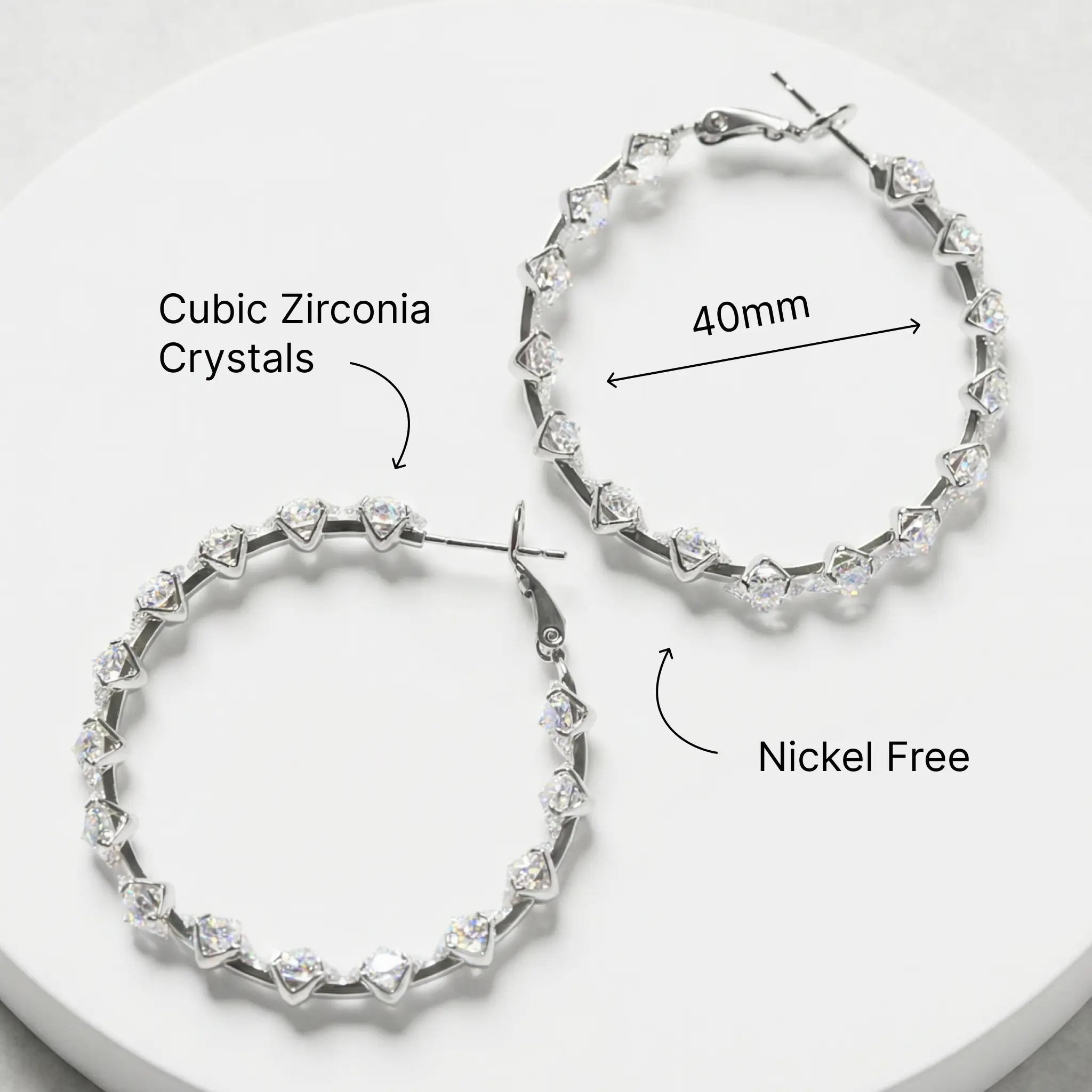 Shiny 40mm hoop earrings with cubic zirconia. Lightweight, comfortable, and perfect for everyday wear or special occasions.