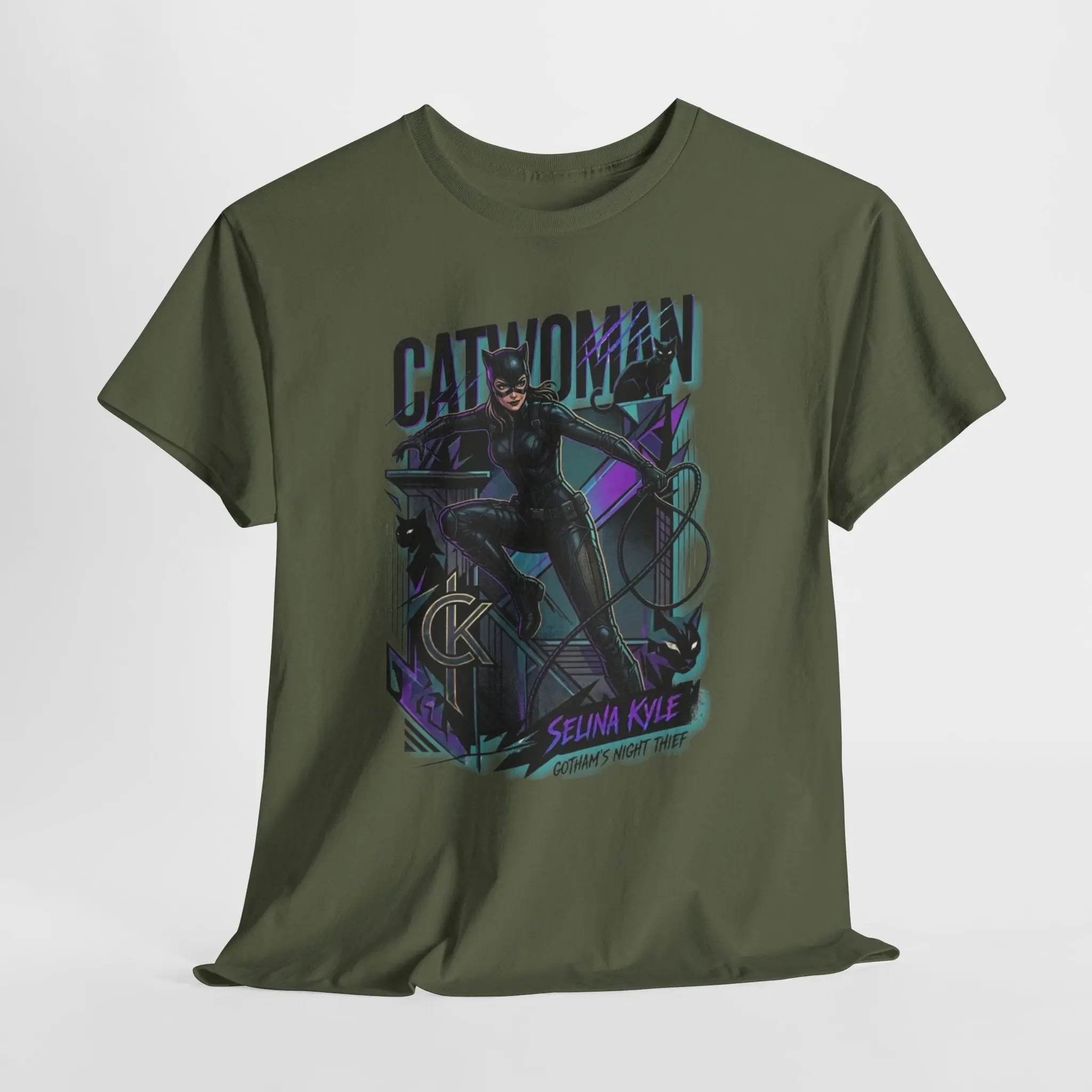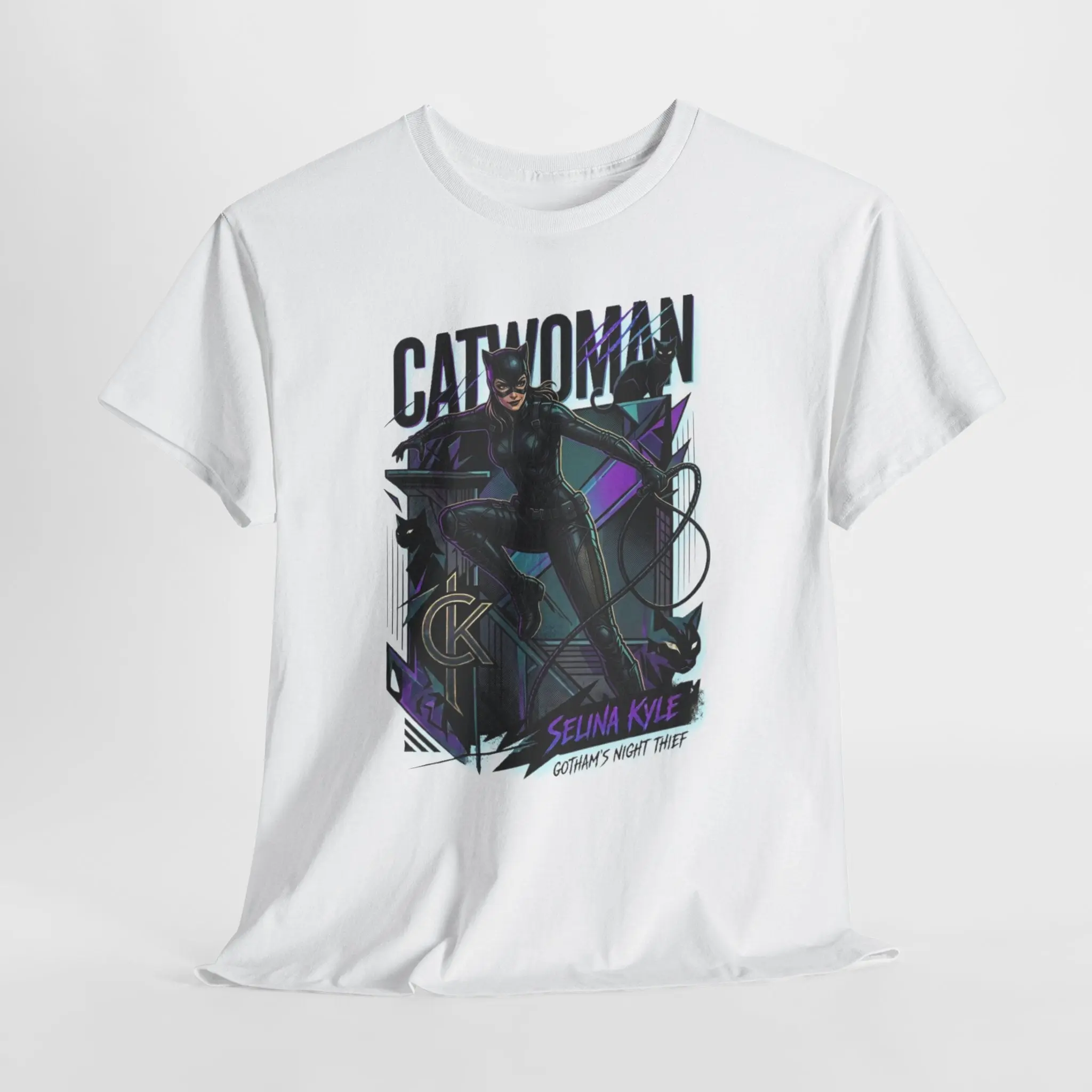 This vintage-inspired tee channels comic-book swagger with a moody, noir palette and bold graphic front print. The soft white cotton background makes the detailed artwork pop — deep purples, inky blacks, and subtle teal highlights create a nighttime alleyway vibe. Wear it with worn denim and a leather jacket to bring a cinematic, slightly mischievous edge to everyday outfits. The relaxed crew cut and smooth print let the design speak without fuss, whether you’re heading to a convention, a late-night hang, or just running city errands. It feels like a page torn from a favorite graphic novel: dramatic, a little mysterious, and unmistakably bold.