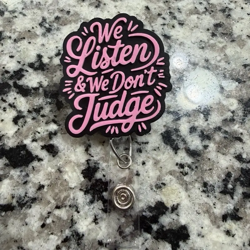 This handmade badge reel features the popular “We Listen & We Don’t Judge” design—perfect for nurses, healthcare workers, teachers, or anyone who wants a fun but meaningful reminder at work.