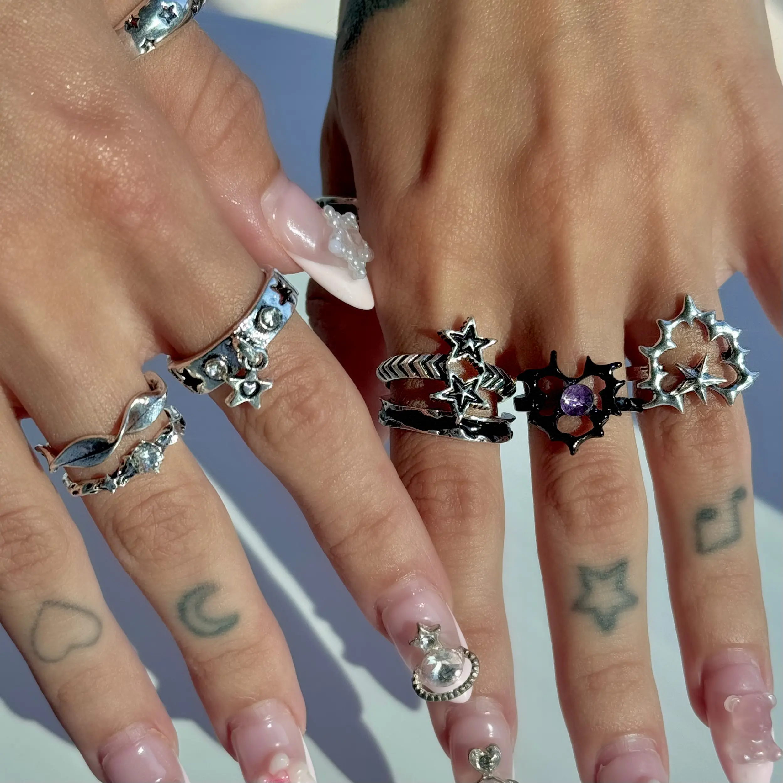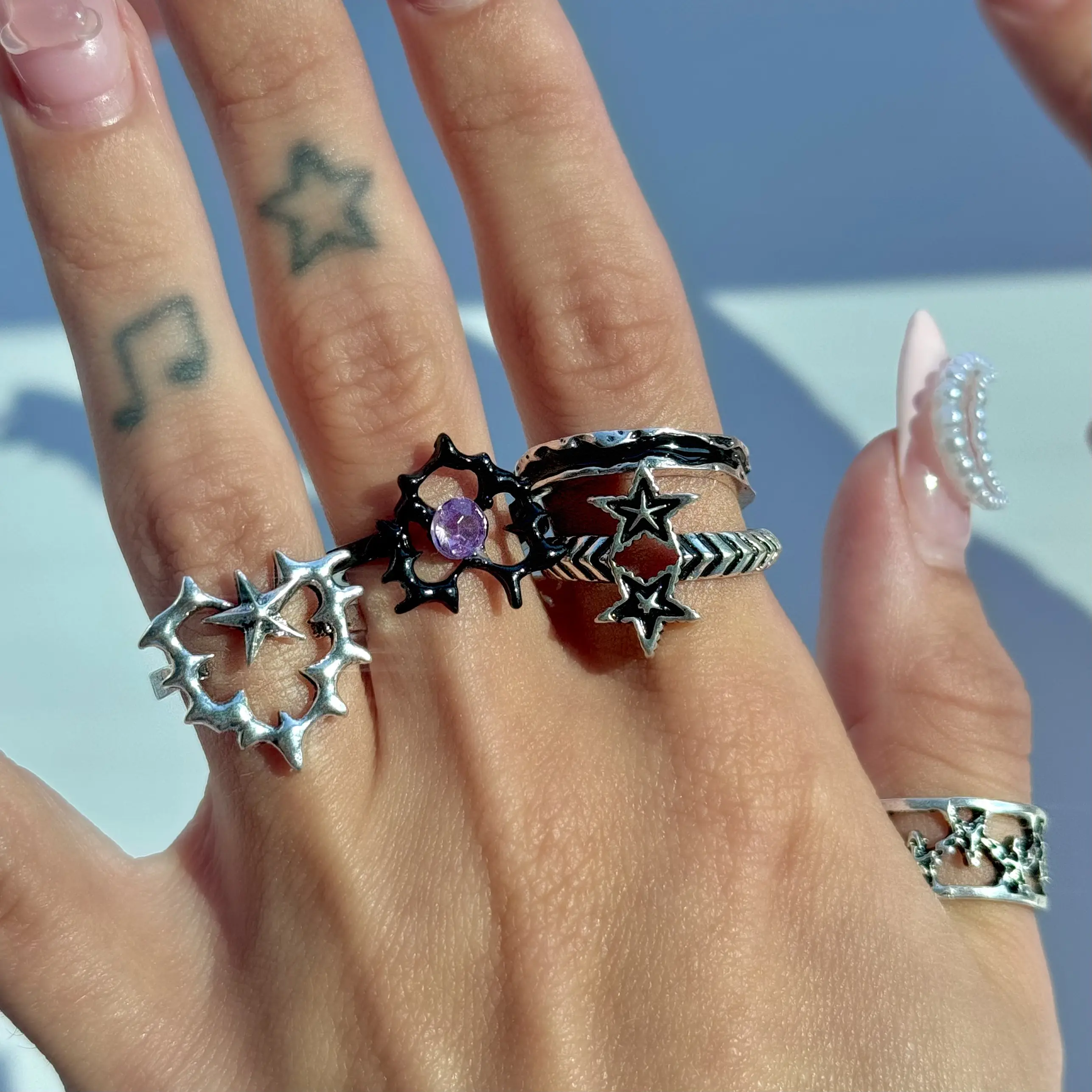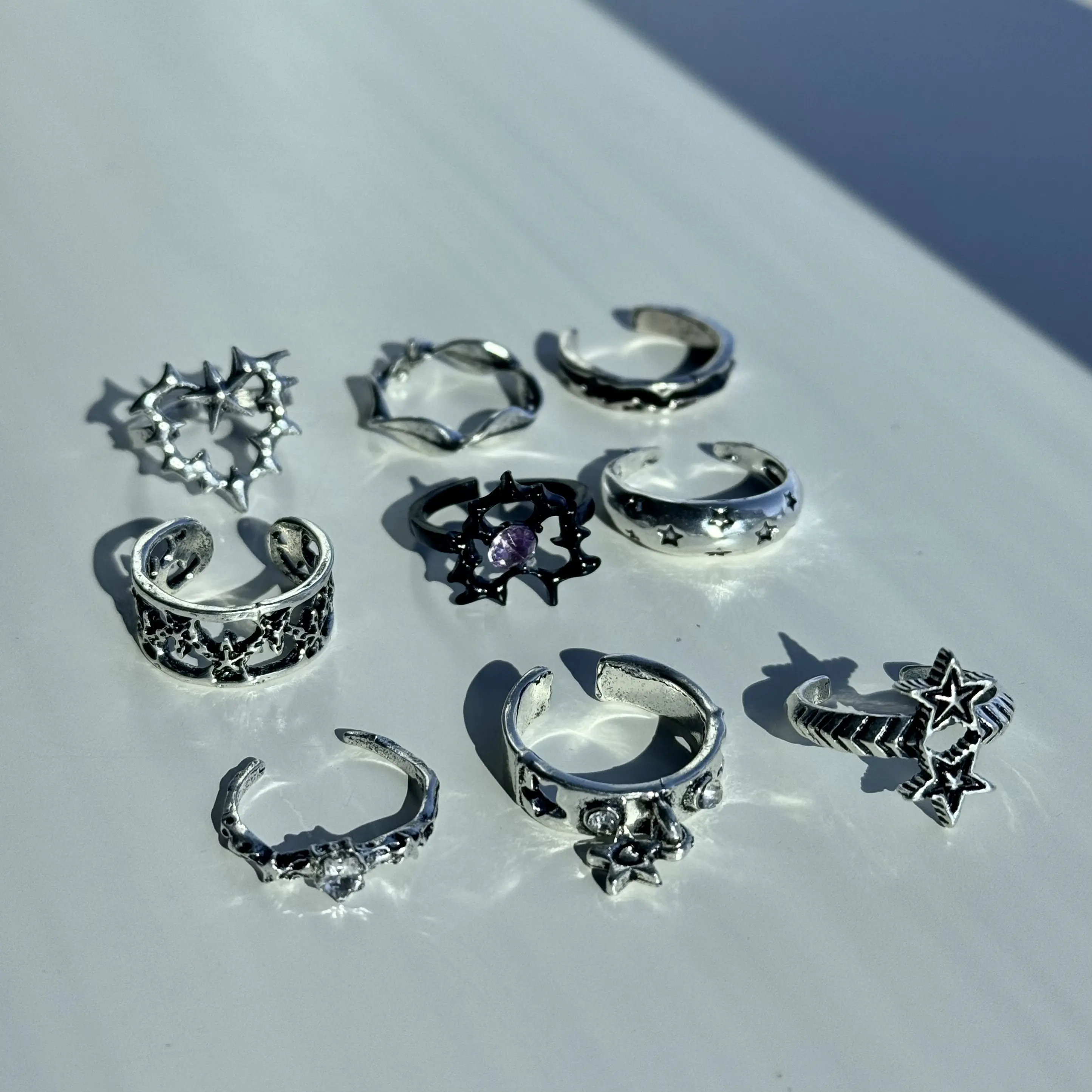 Elevate your style with this stunning 9-piece gothic punk ring set! Features a mix of hollow star, heart, and geometric designs perfect for stacking and layering. One size fits most with adjustable open bands. Perfect for daily wear, gifting, and festival styling.