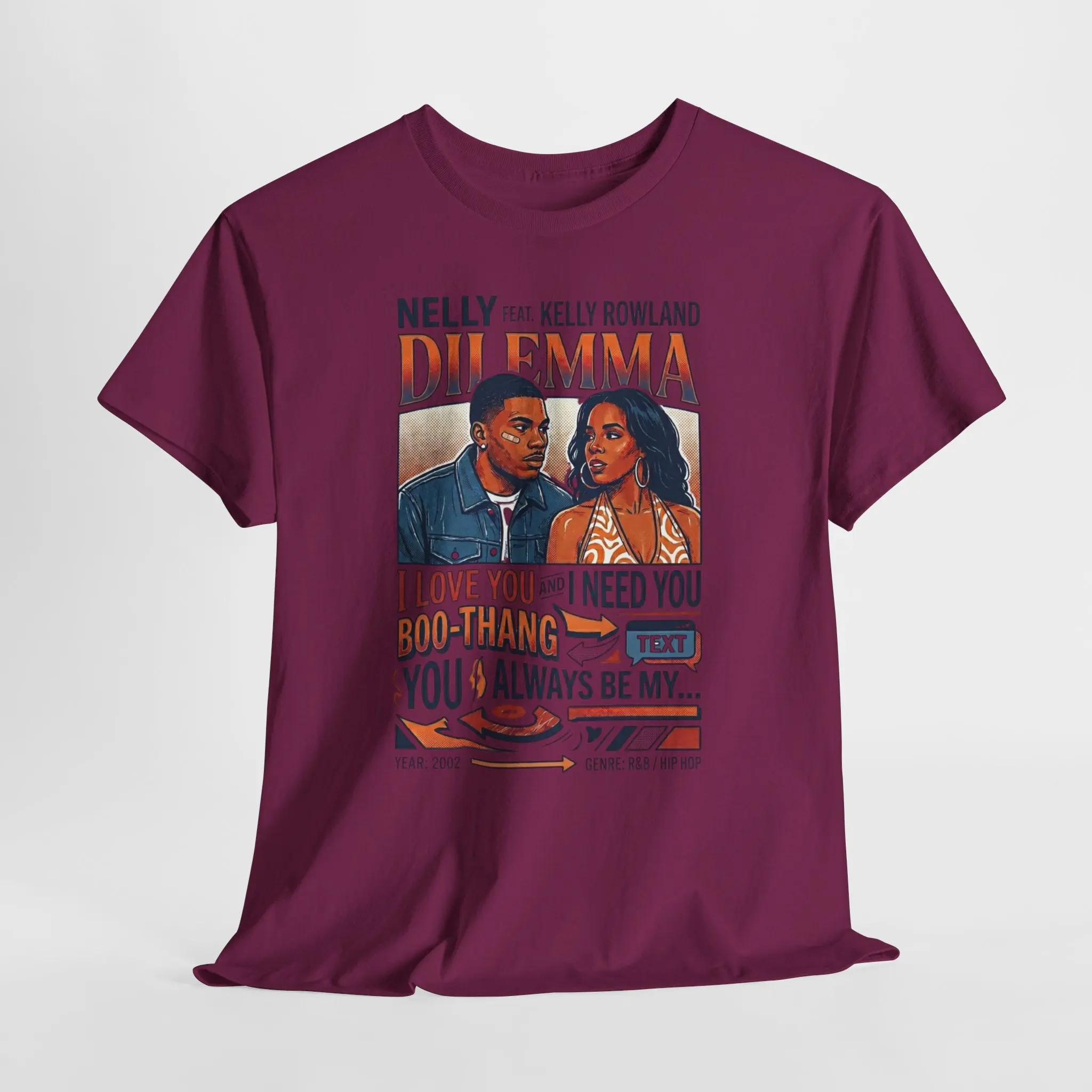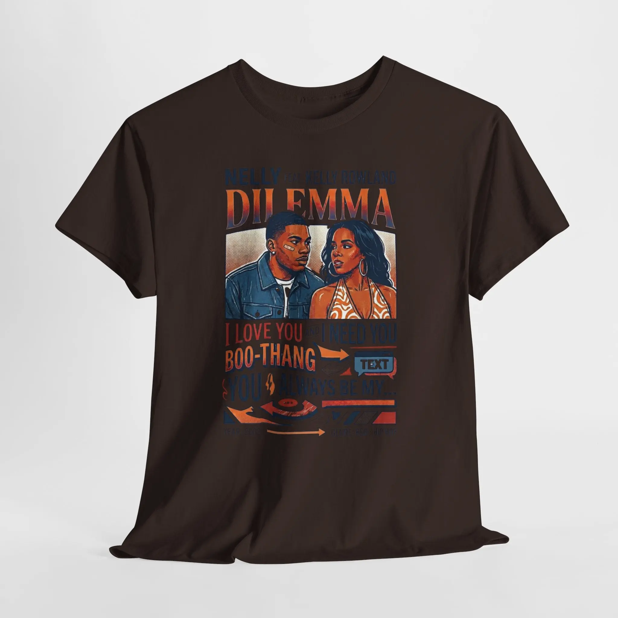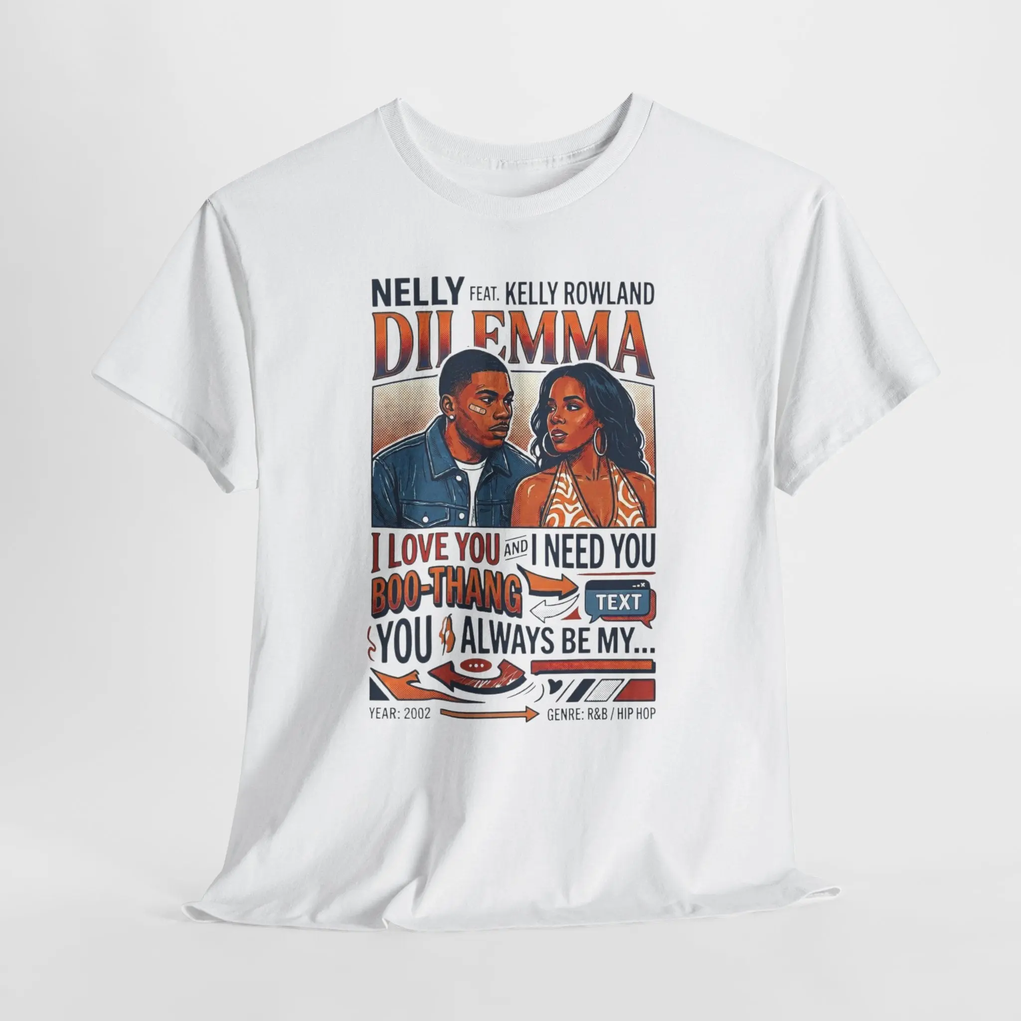 This vintage-inspired tee channels late-90s R&B nostalgia with a warm, storytelling print that feels like a mixtape cover. The artwork captures an intimate moment between two voices—frustration, longing, a playful back-and-forth—so the shirt reads like a lyric you can wear. Soft yet structured, it drapes easily for everyday wear and brings a retro soundtrack to coffee runs, open-mic nights, or relaxed studio hangs. Wear it with faded jeans, layered under an oversized jacket, or tied at the waist while you rewind to old-school playlists and shared memory lanes.