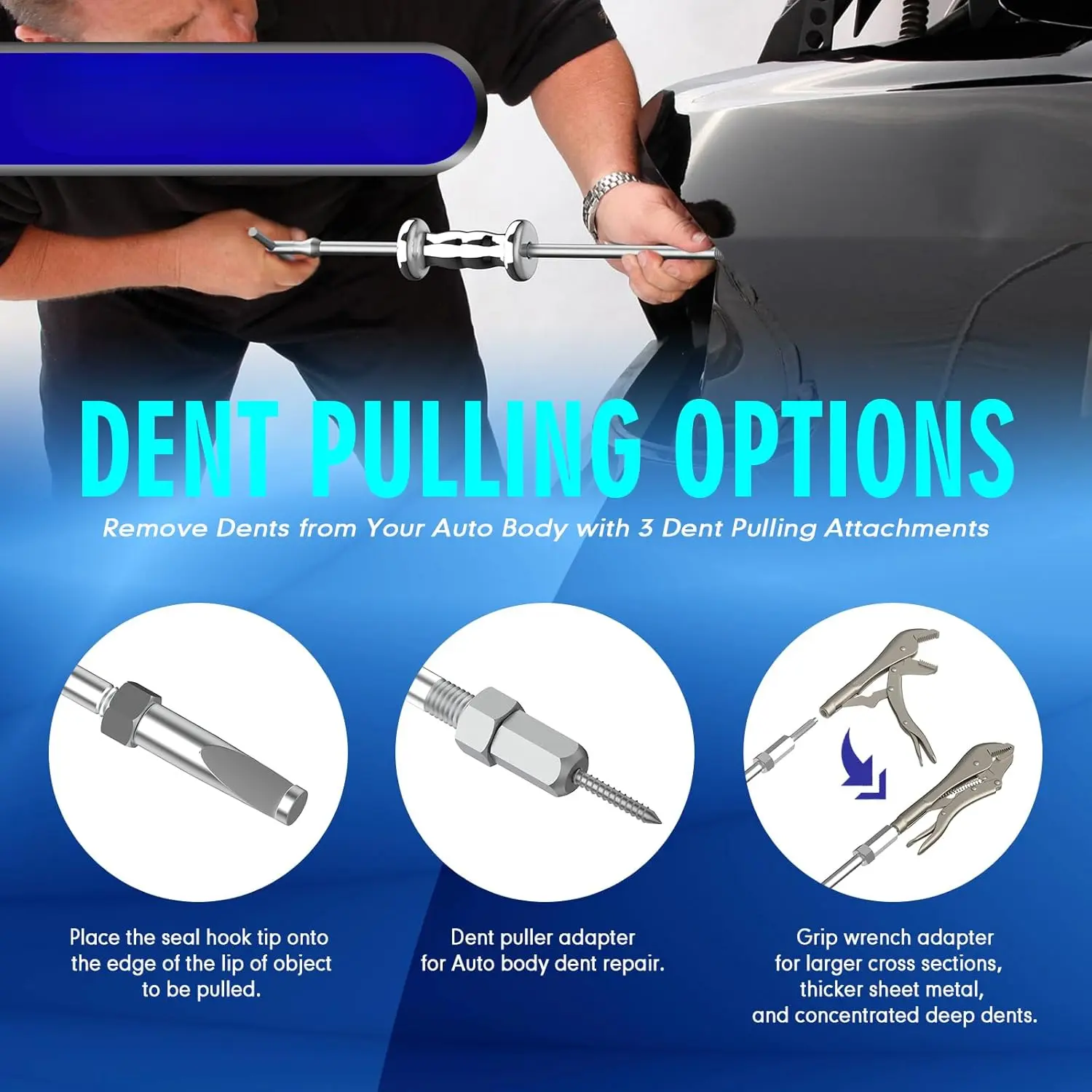 ·VERSATILE TOOL KIT: 9-way Slide Hammer Pulling Set is a comprehensive solution for a wide range of repair and removal tasks, from dents and dings to pulling flange-type rear axles and most front-wheel drive hubs.