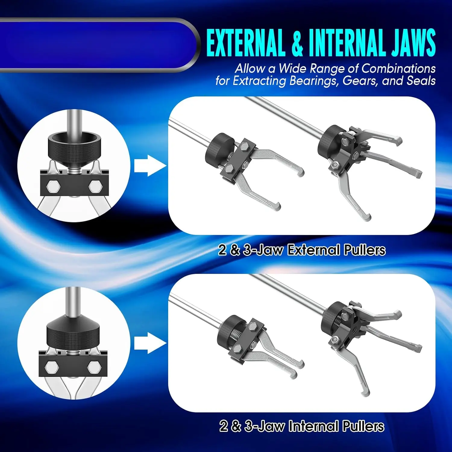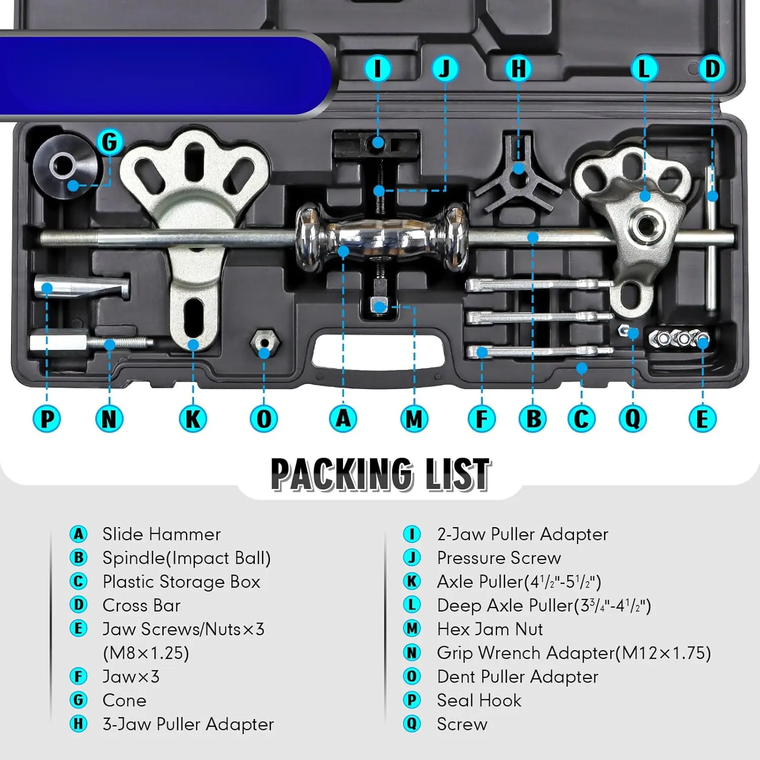 ·INTERCHANGEABLE ATTACHMENTS: The set includes a variety of interchangeable attachments, including an axle puller (4-1/2" to 5-1/2"), a deep axle puller (-3/4" to 4-1/2"), 3-jaw external/internal puller, 2-jaw external/internal puller, grip wrench adapter, dent puller, seal hook puller and etc.