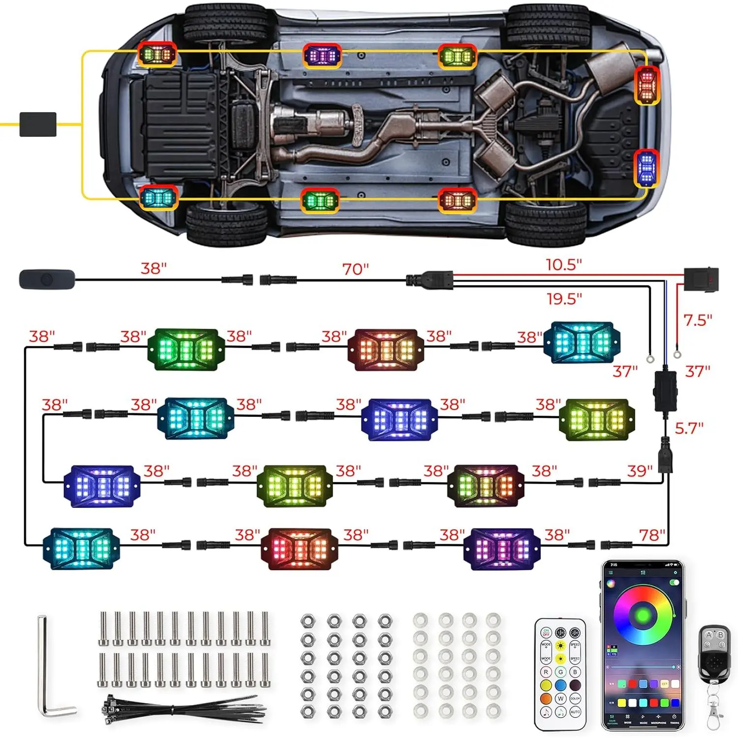 ·Hassle-free setup with dual path series wiring.The on/off switch prevents battery drainage, and a safety fuse adds extra protection.This ensures reliable and safe operation of your rock lights.
