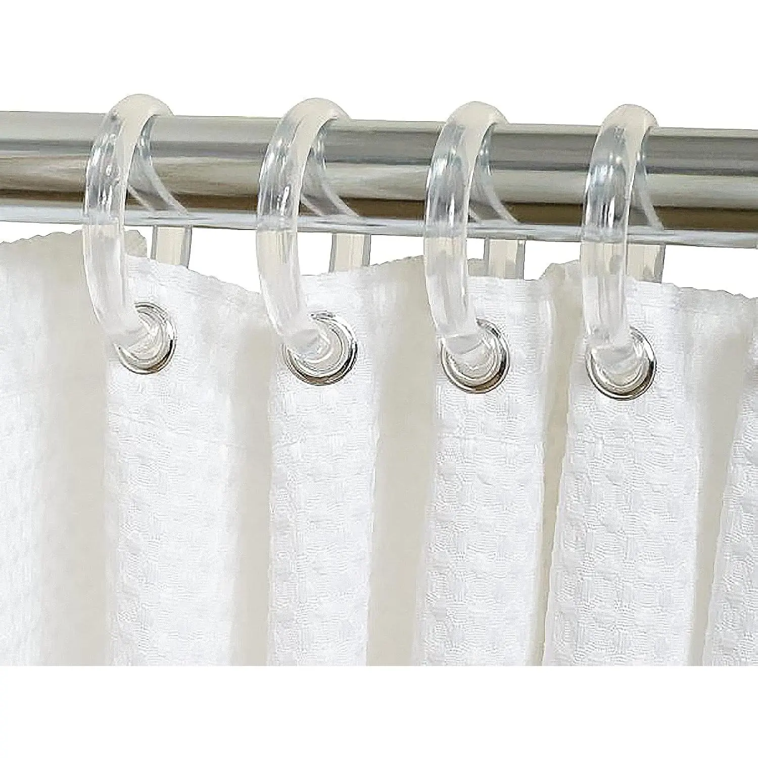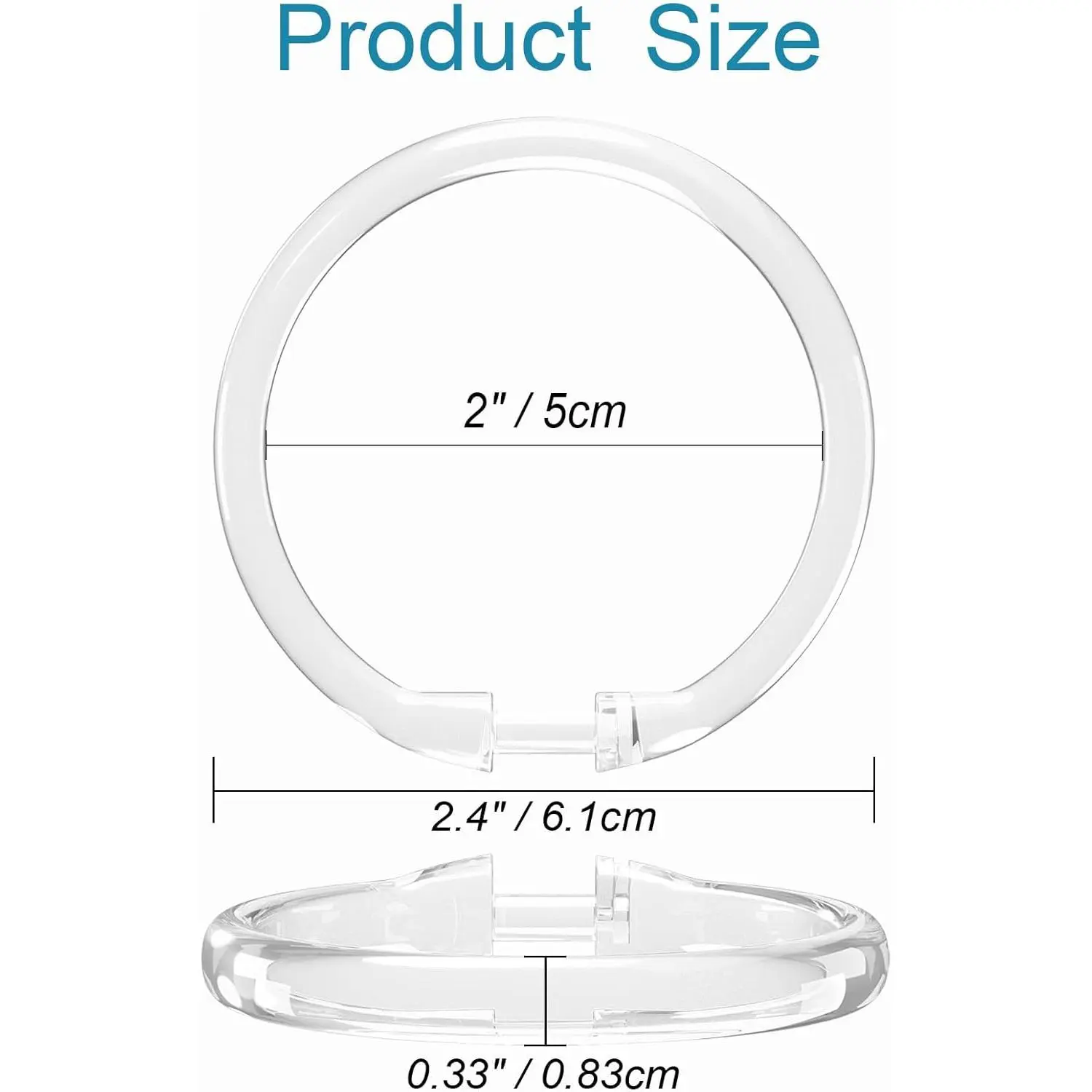 [High Quality] Shower curtain hooks are made of lightweight high quality plastic resin material, sturdy and rustproof. [Unique design] O-shaped design is easy to bend, crystal clear plastic, not easy to break. [Easy use] Easy install without effort, Easy disassembly, Easy to clean, Easy Sliding of Curtains. [Product application] Widely suit for tub, bathroom, changing room, and so on. [Packaging includes] 2.34 x 1.95 inch (12 PCS) plastic hooks. Delicate and lightweight.