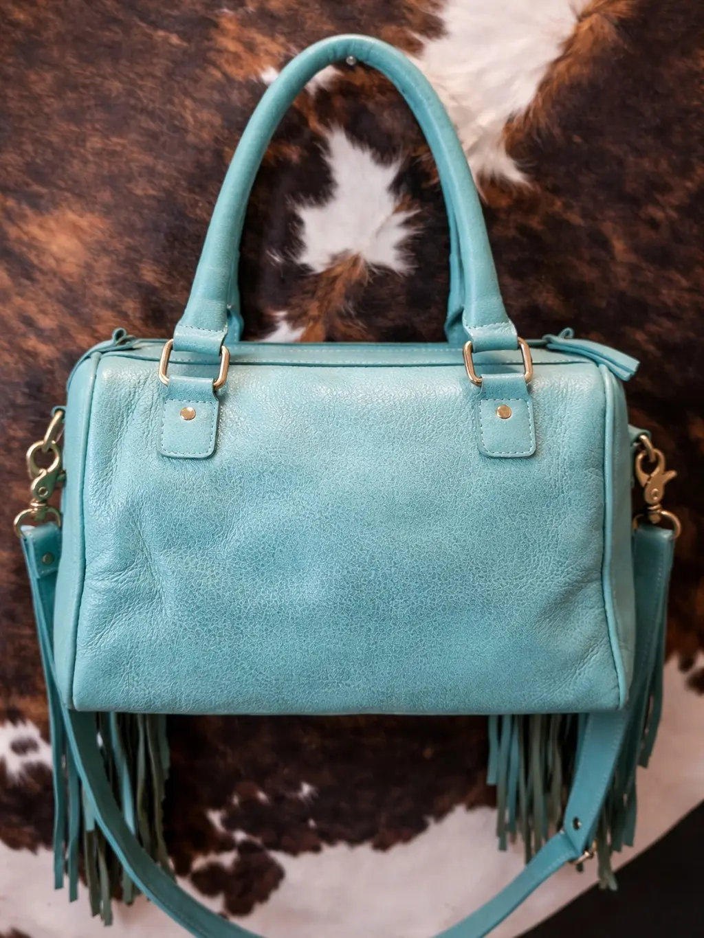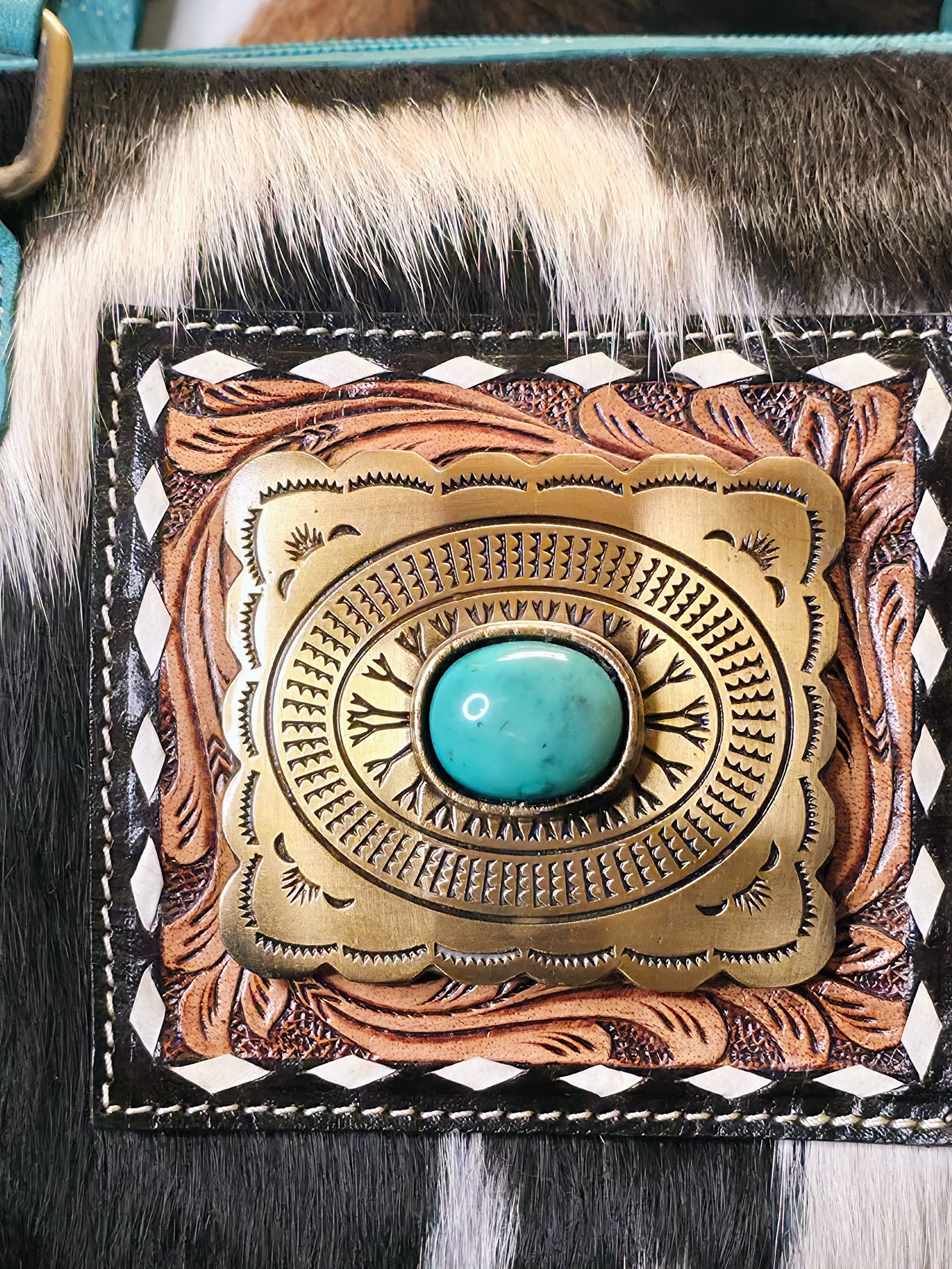 The Turquoise Outlaw Fringe Bag features genuine hair-on cowhide paired with hand-tooled leather accents and a bold turquoise centerpiece that pulls the entire look together. Finished with long flowing fringe and soft, pliable leather, this bag moves with you while still making a statement.