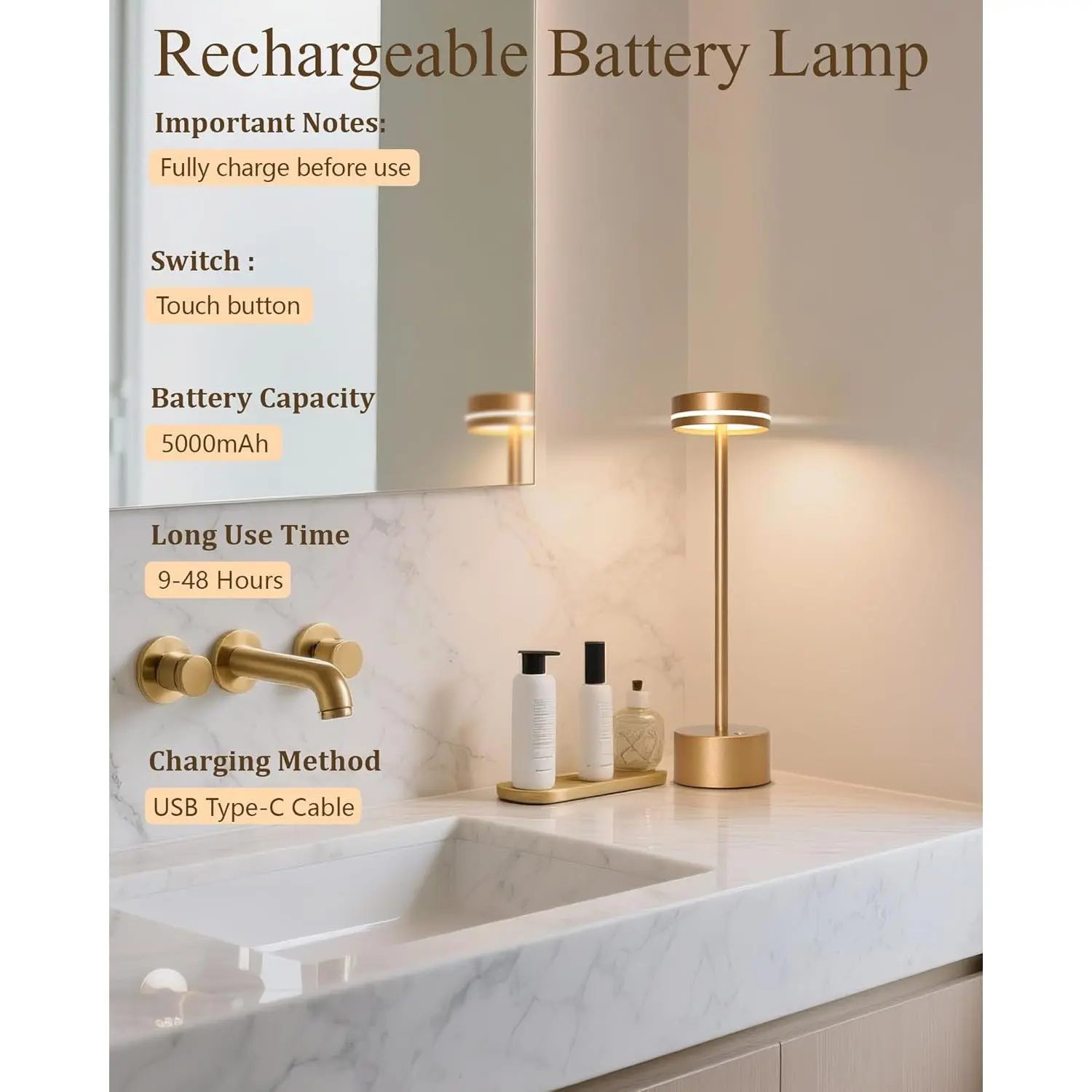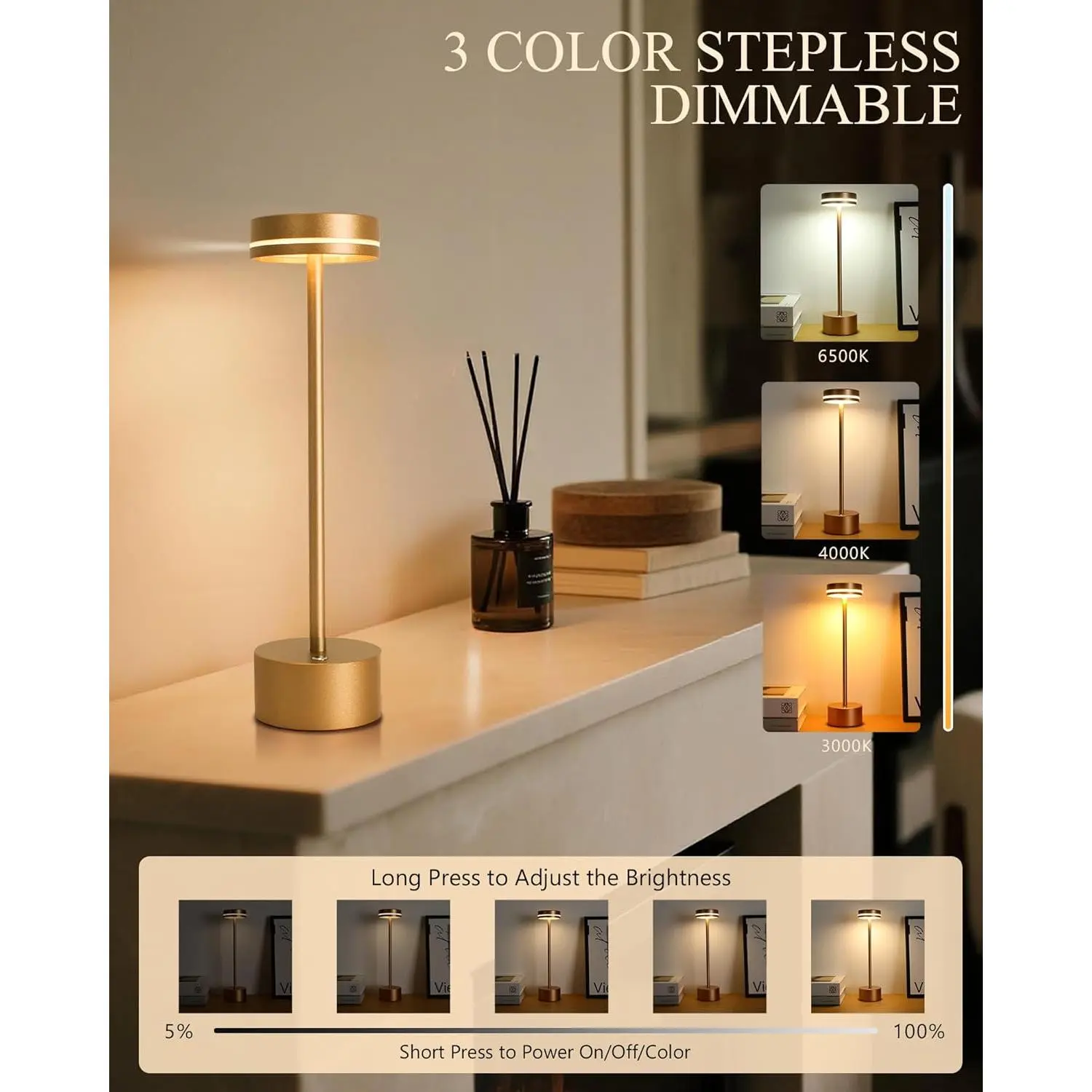 LED Cordless Table Lamp Rechargeable, 5000mAh Portable Battery Operated LED Desk Lamp, 3 Color Dimmable Table Light for Reading/Home Office/Dining/Nightstand for Home Décor – Rose Gold