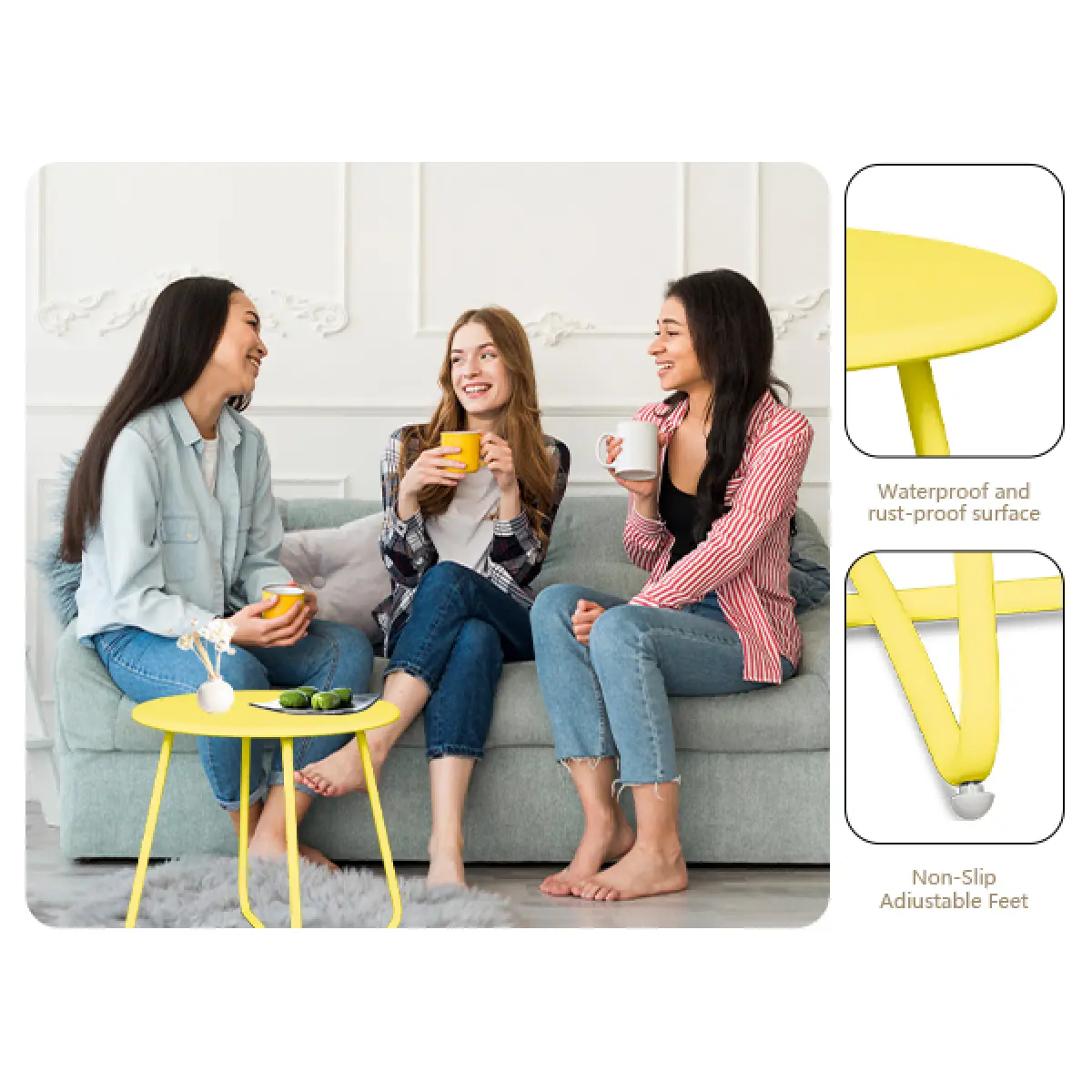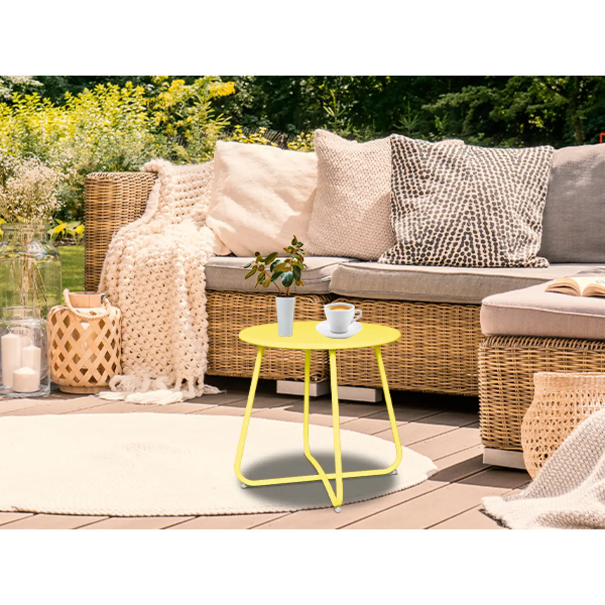 This new version of the steel patio side table features a unique rolled edge design to prevent items from falling off.And it comes in a stylish color to enhance its visual impact.