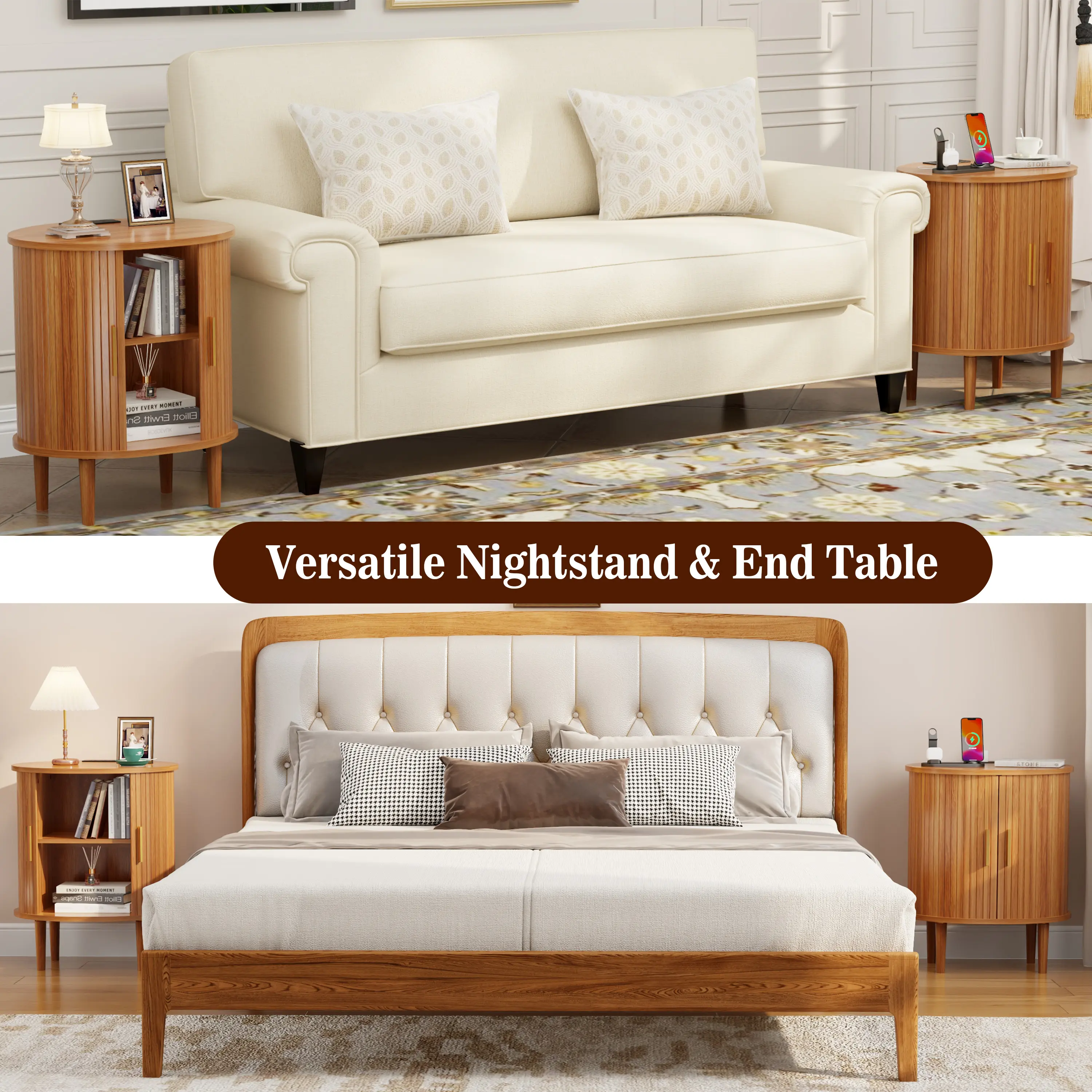 The perfect smart nightstand that keeps your phone charged and your nighttime essentials hidden behind the stylish tambour door.