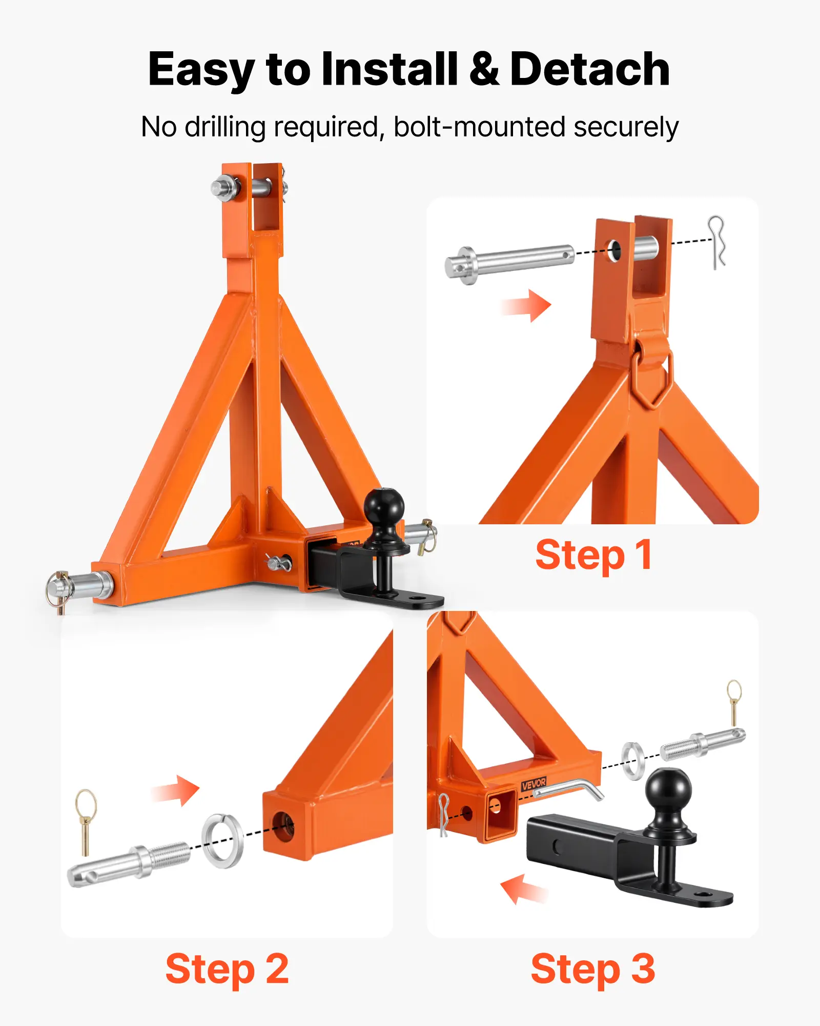 5. VEVOR 3 Point Trailer Hitch with 2" Receiver, 3 Pt Quick Hitch Attachment with Trailer Ball, Tractor Tow Drawbar Adapter, Fits Category 1, Kubota, Mahindra, Ford, Yanmar, John Deere, Massey Ferguson