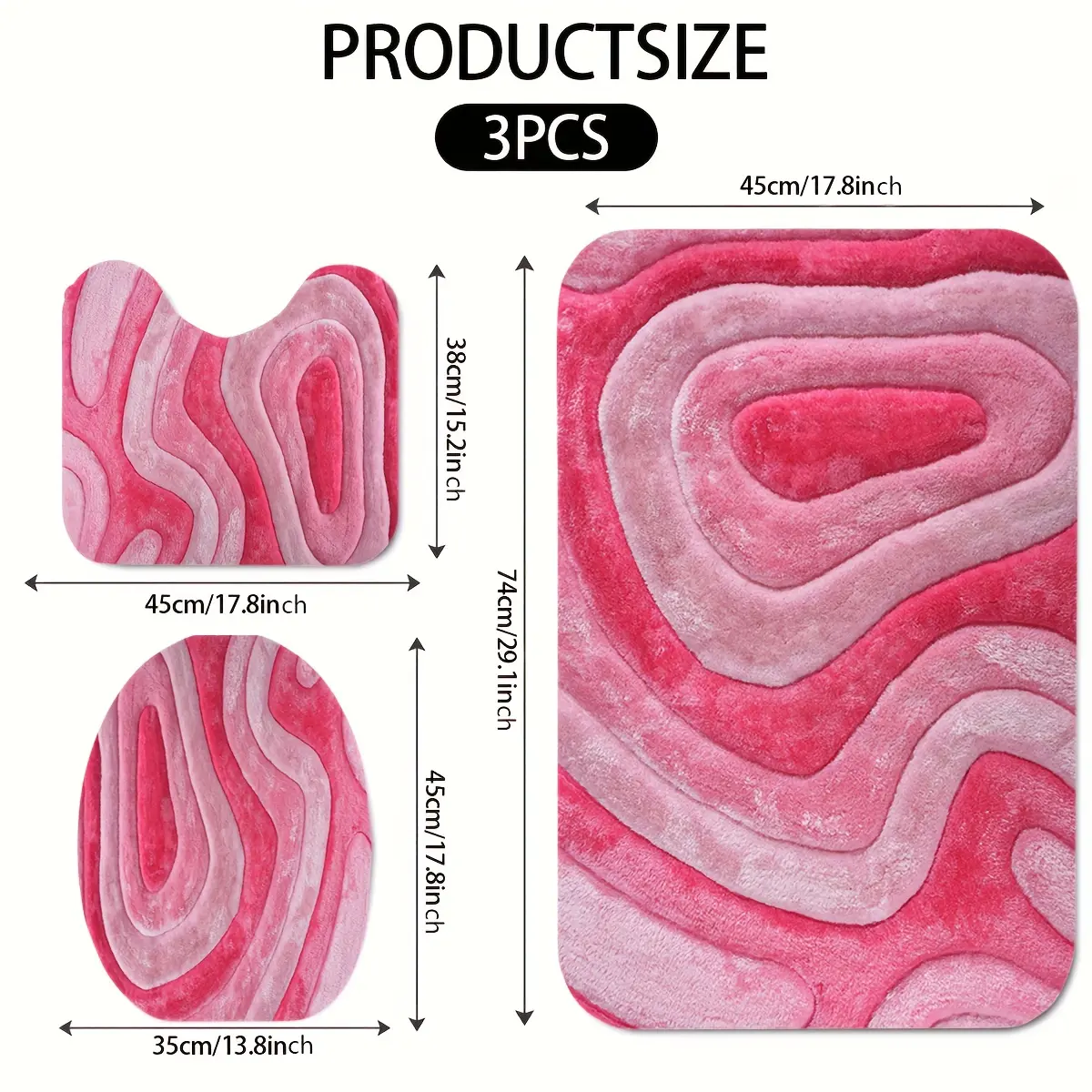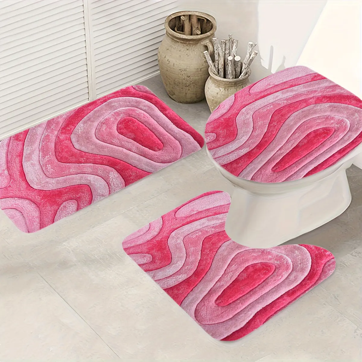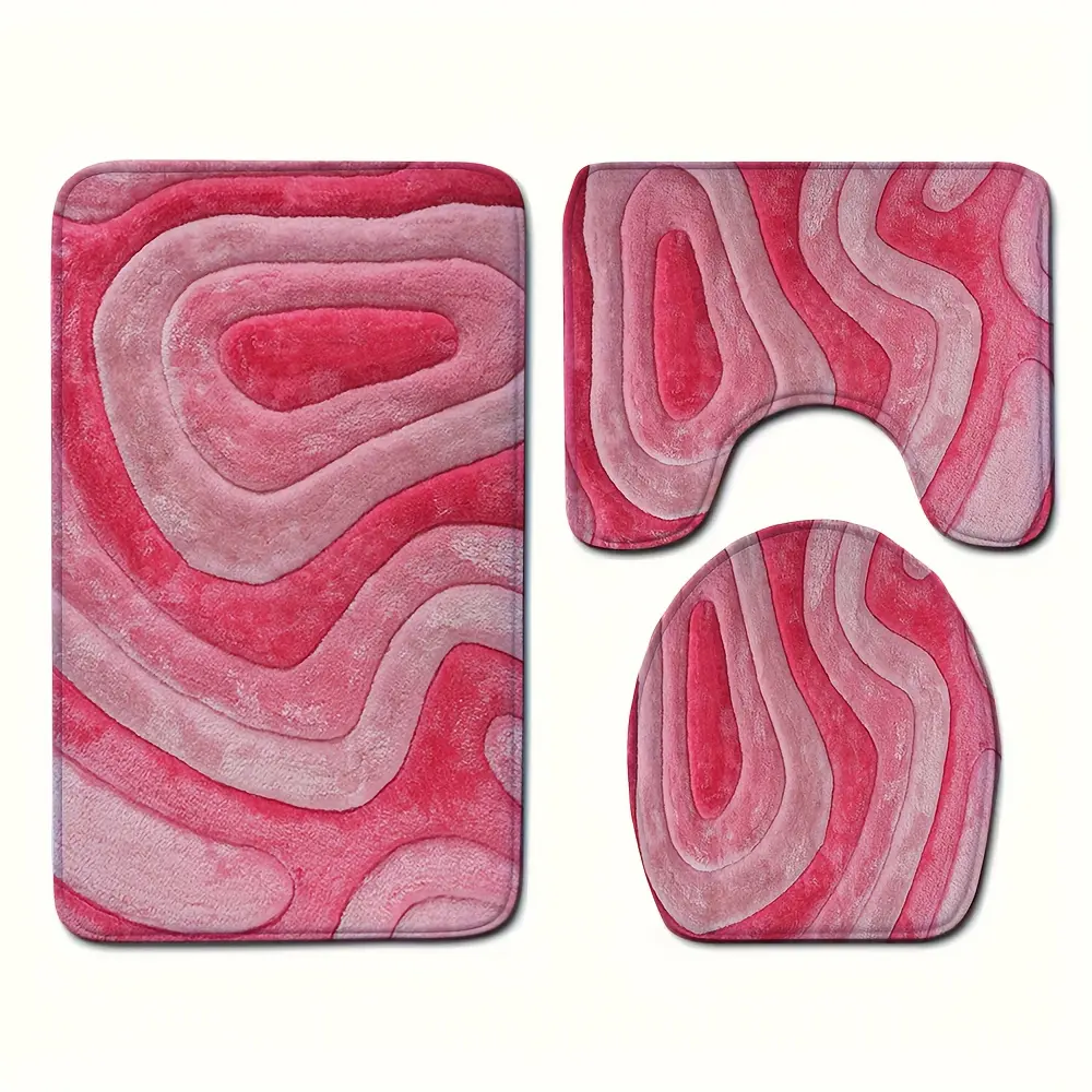 2D Flat, 3pcs Bathroom Mat Set in Soft-Toned Abstract Pink Ripple Print, Includes Toilet Lid Cover and U-Shaped Toilet Mat, Made of Flannel with Soft Surface, Thanksgiving Decoration, 2D Flat