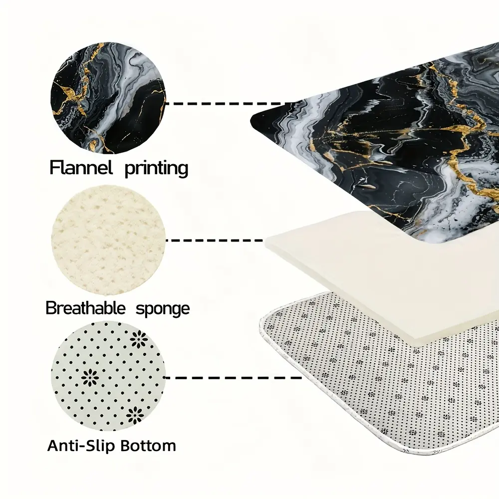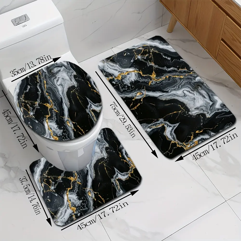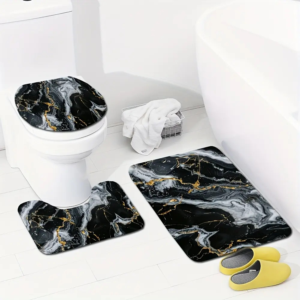3pcs Black and Golden Faux Marble Pattern Rug Set, 0.8cm Flannel Material, Modern Minimalist Style, Non-Slip Bath Mat, O-Shaped Non-Slip Toilet Seat Cover, Exquisite Home Decor Set