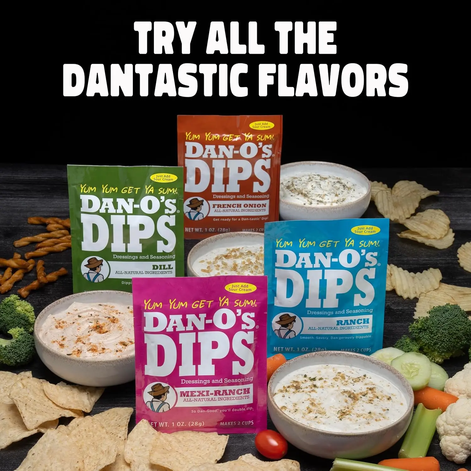 ·Four Bold Dip Flavors In One Variety Pack: This 8-pack includes 2 packets each of Ranch, Mexi-Ranch, French Onion, and Dill (1 oz each), making it the ideal middle ground for smaller gatherings, weekly meals, or first-time Dan-O’s dip fans
