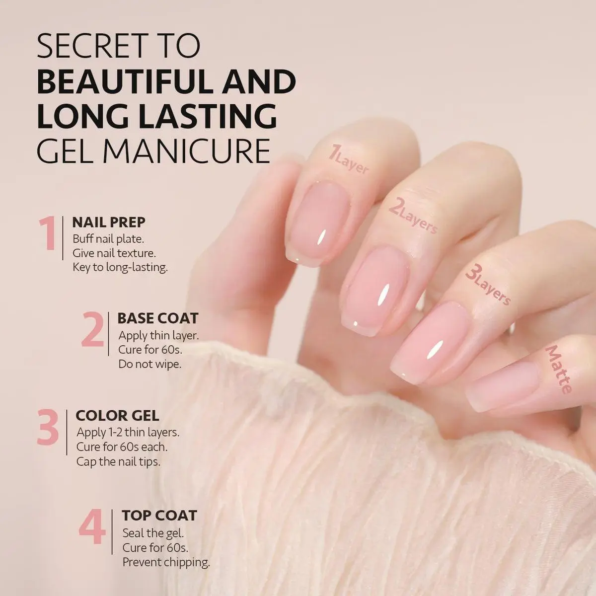 4 Weeks Long-Lasting: Buff your nail bed before base coat to give your nail texture. Apply top coat after color gel for shiny finish.