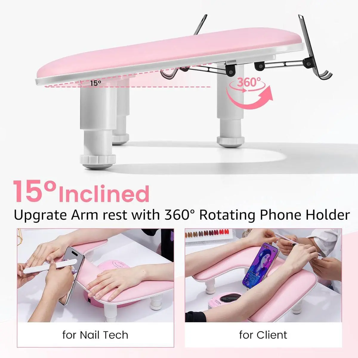 Built-in Rotating Phone Holder: Frees both hands to check design refs on your phone while applying gel polish, 3D carving or nail extensions. Or gives clients a comfy angle for TikTok or shows. Push flat to snap it flush into the arm rest—out of sight and clutter-free.