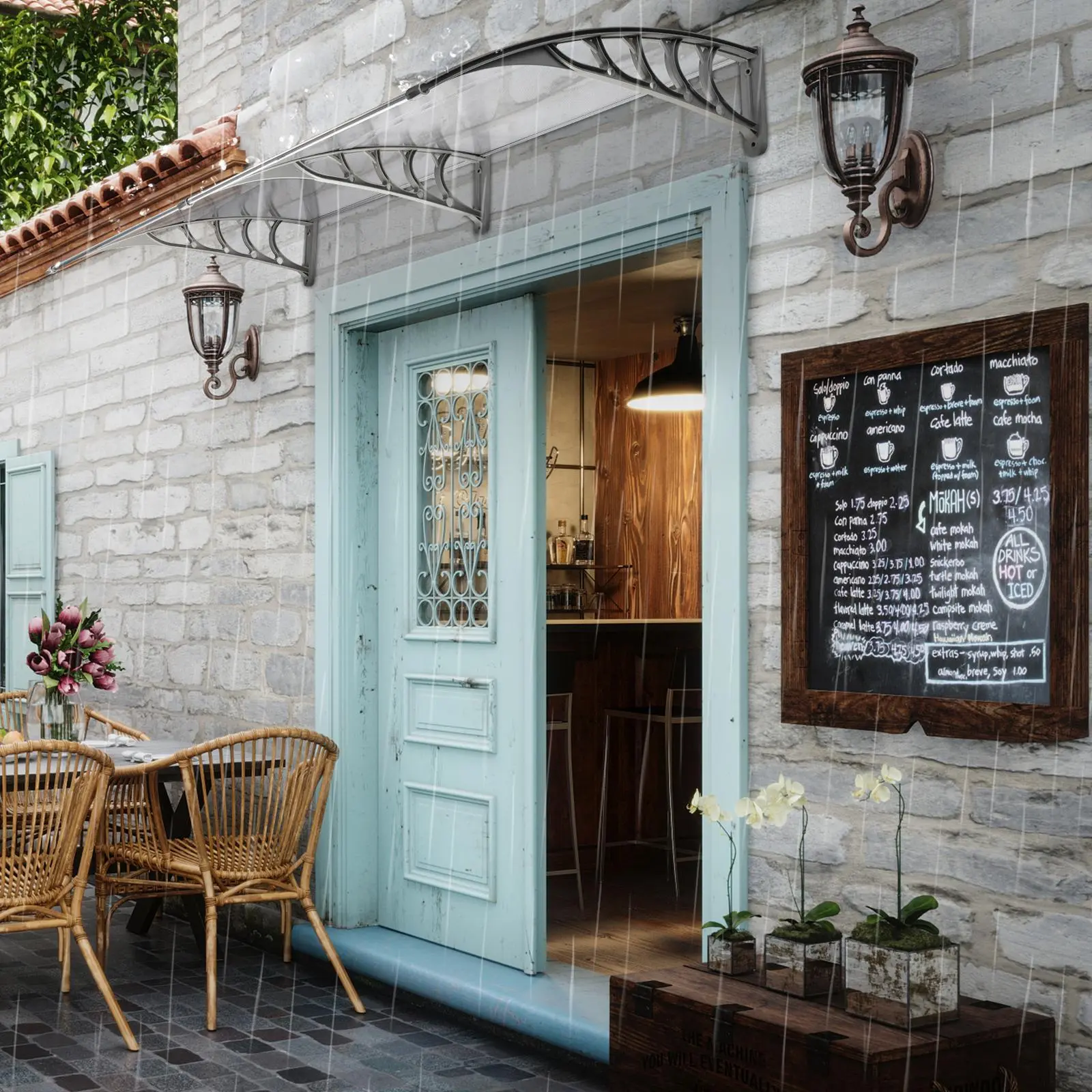 ·DURABLE MATERIAL: The 76”x38” front door awning exterior boasts robust materials like a 19mm hollow polycarbonate panel, ABS frame, and aluminum strip, offering transparency and remarkable weather resilience. This door awning canopy not only combats UV ray damage, delaying signs of aging and yellowing, but also with superior impact and corrosion resistance, ensuring prolonged, quality protection for doors and windows