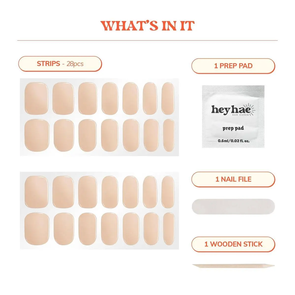 Enjoy a complete package to get fresh salon quality nails done at ease everywhere and anywhere you go! Package includes: 28 strips, 1 Prep pad, 1 Nail file, & 1 Wooden stick.