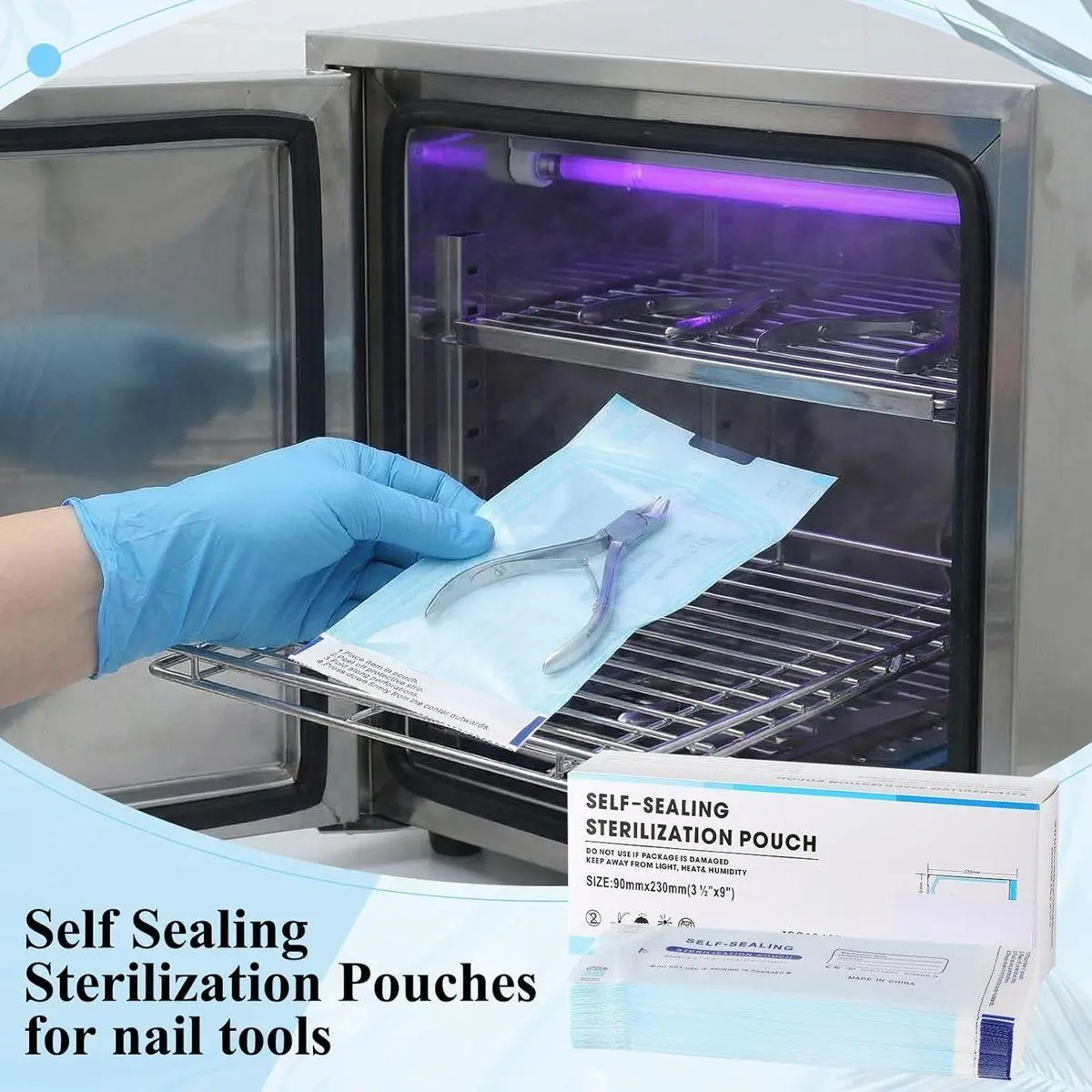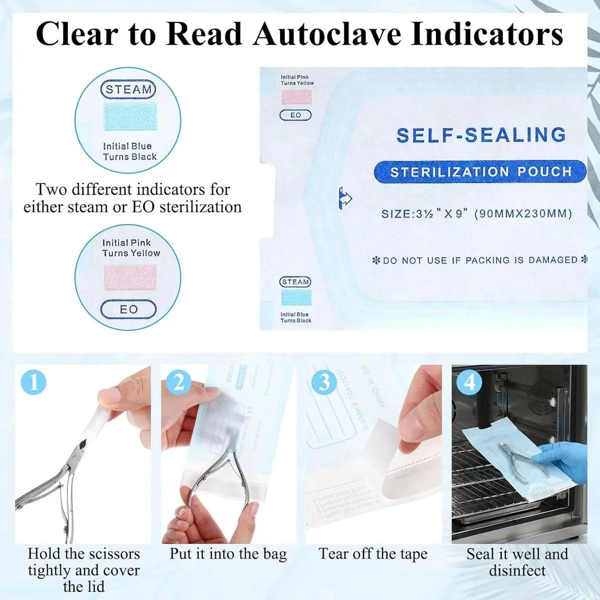Reliable Sterilization Assurance: maintain hygiene with ease using our sterilization pouches, sized about 3.5 x 9 inches, they feature a self sealing strip that ensures a secure closure, keeping your tools sterilized until their next use; The autoclave bags feature a color changing indicator strip to visibly confirm effective sterilization, helping to promote cleanliness and safety in every application of salon hygiene