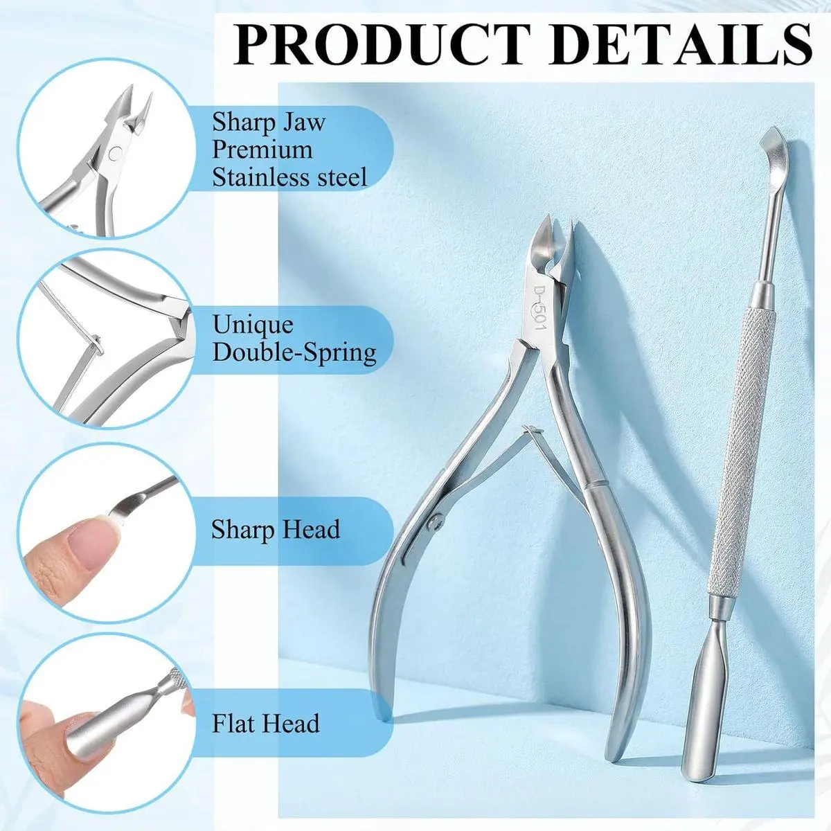 Comfortable and Professional: experience the comfort of ergonomic design with cuticle clippers for nails, designed for a non slip grip, cutting cuticle off in small areas around nails, while reducing hand fatigue during use; The dual ended pushers feature a rounded end to push the dead skin and a sharp end to cut or scrape off dead skin, offering versatility and precision for meticulous cuticle maintenance and cleaning