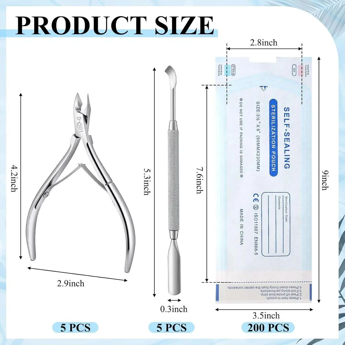 Professional Nail Care Kit with Hygiene Protection: elevate your nail care routine with this comprehensive cuticle nippers set; It includes 5 cuticle clippers, 5 dual head cuticle pushers, alongside 200 self sealing sterilization pouches, offering everything you need for professional cuticle care, ensuring hygiene and quality every time, necessary kit for nail technicians