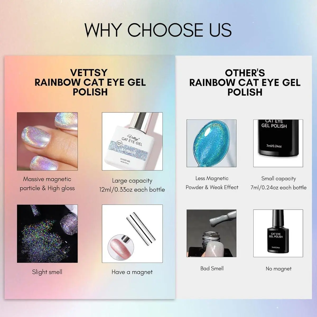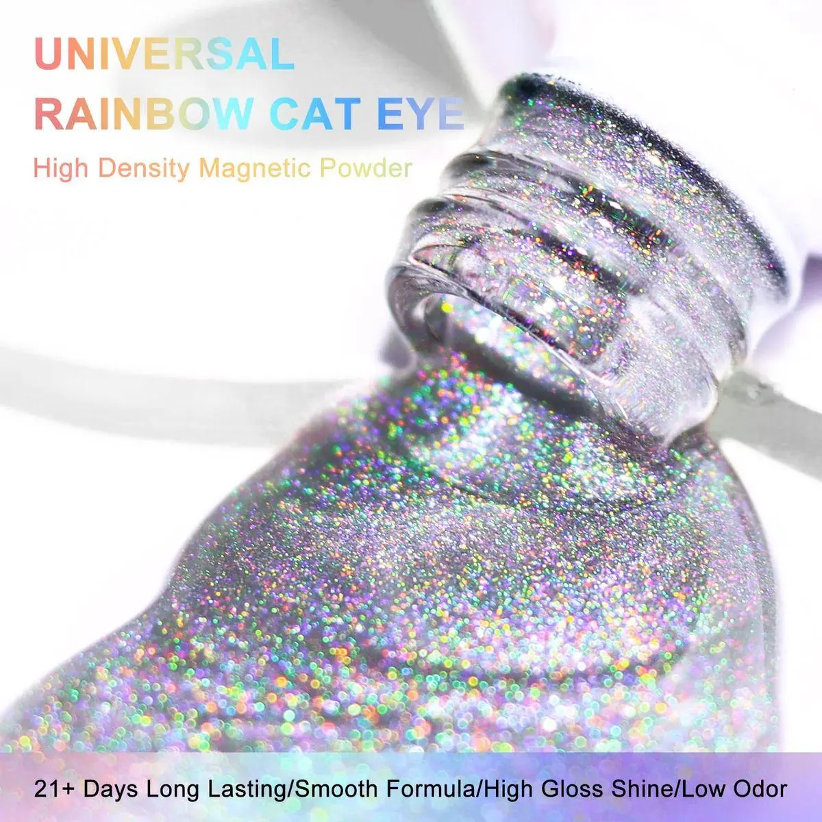 【 MAGIC HOLOGRAPHIC EFFECT 】This gel nail polish combines multiple effects like classic holographic glitter shades and finishes to create a rainbow color magnetic cat eye effect and holographic laser rainbow magnetic cat eye effect.