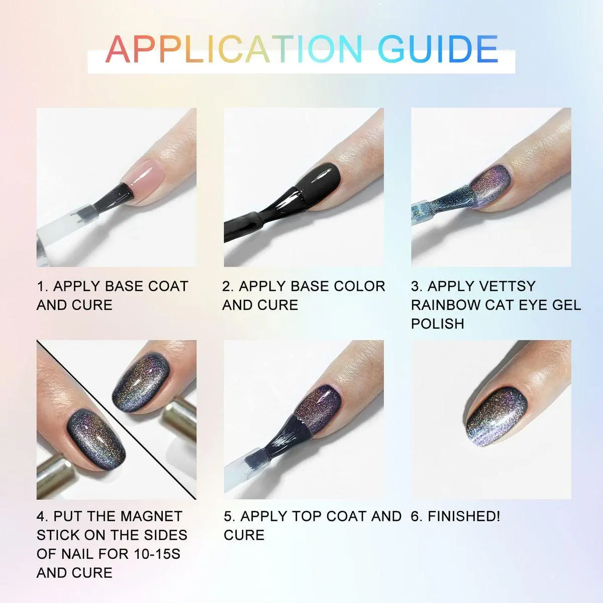 【 UV/LED LAMP CURING 】Magnetic cat eye gel nail polish must to be cured under LED or UV nail lamp. This multichrome holographic gel polish should be used with a base coat(dark base coat is better)as well as a top coat finish.