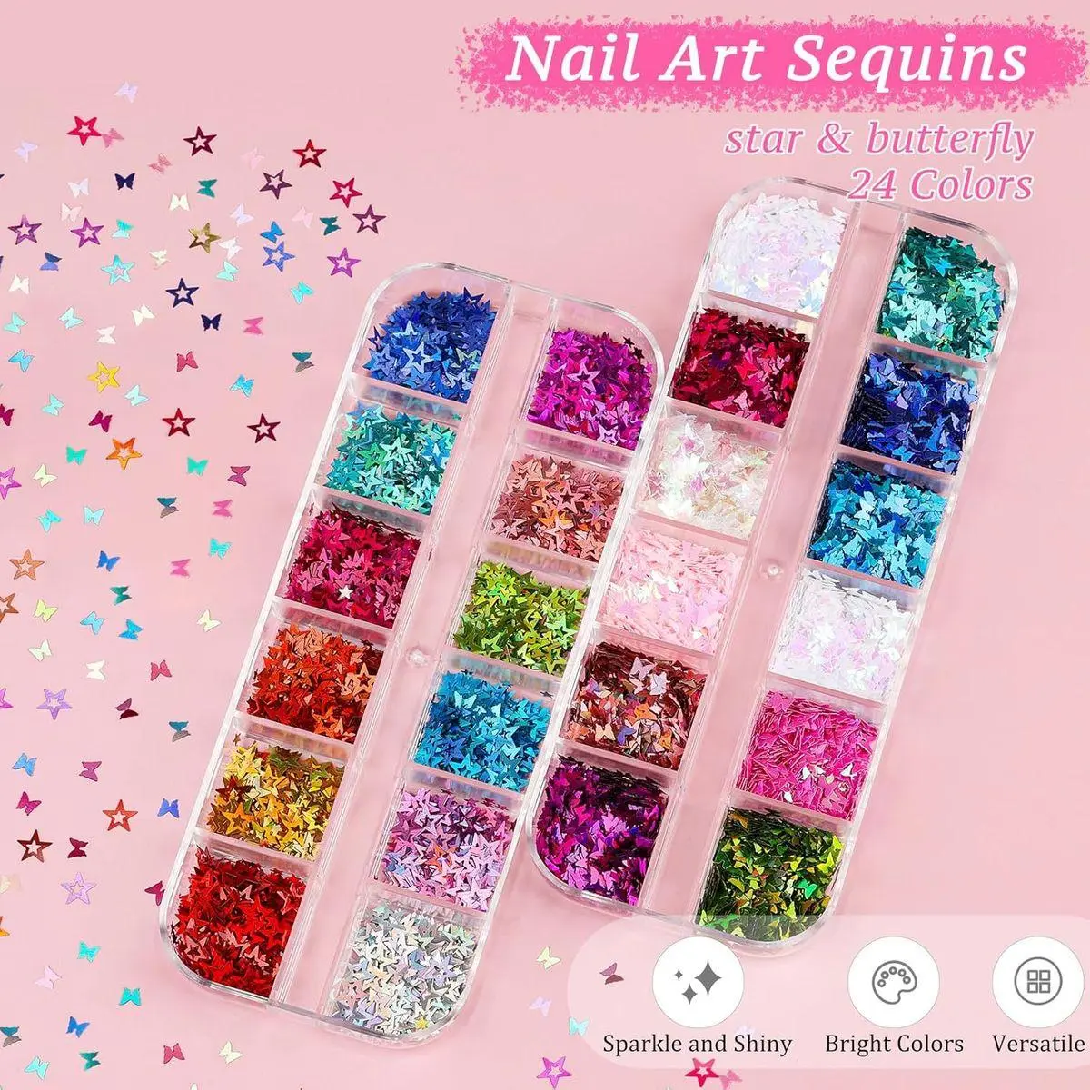 Star Butterfly Nail Sequin: Delicate star and butterfly nail art glitter flakes are colorful and unique in design, easy to match with various nail styles. Also using high quality reflective material, each piece of sequins can reflect the bright light, let your fingertips shine and move.