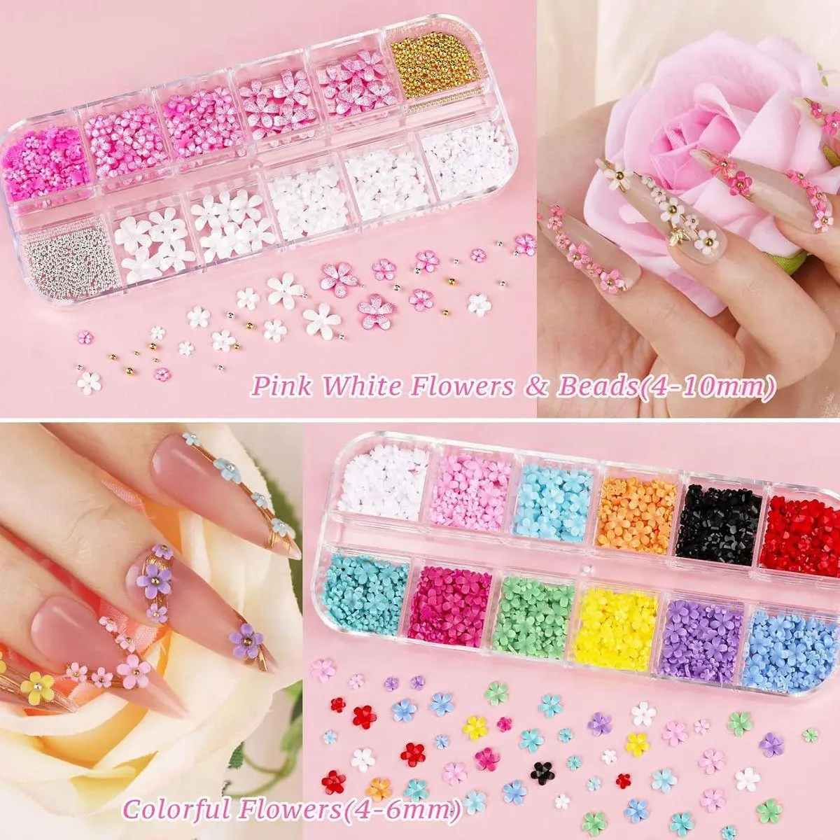 12 Colors Spring Flower with Caviar Beads: Flower charms have abundant colors to meet all your needs for color, 0.4-1cm diversified sizes suitable for a variety of nail shapes, with gold and silver steel beads are elegant and charming, perfect for daily, weddings, parties and other occasions, creating a unique fingertip garden.